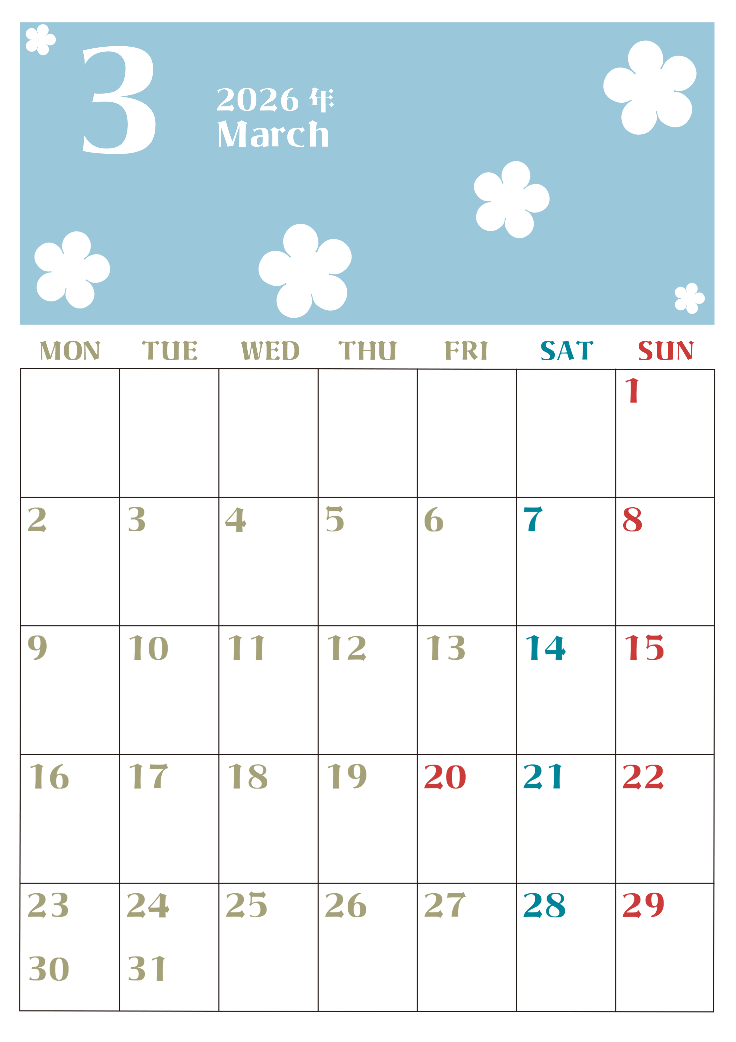 2026年3月カレンダーは縦型月曜始まりでフラワーシルエットが上品でおしゃれなお花のデザインです。暮らしにほっこり休み時間を添えるプラン立てにおすすめの無料ダウンロード可能コンテンツです。(2026-01330311)