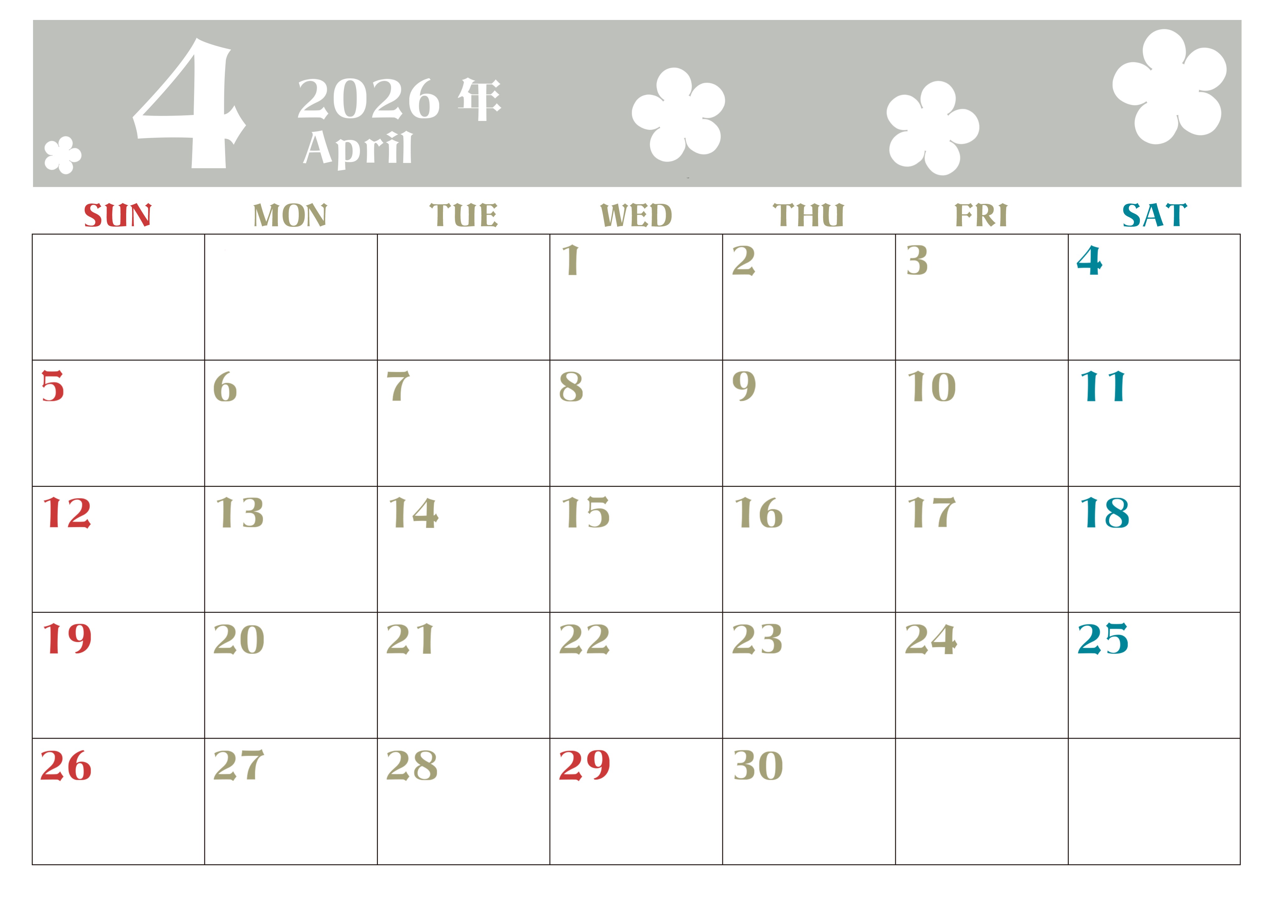 2026年・無料のカレンダーテンプレート 2026年4月カレンダーは横型日曜始まりでフラワーシルエットが上品でおしゃれ(無料)(2026-01330400) 素材状デザイン王 2025年4月10日 2026年4月カレンダーは横型日曜始まりでフラワーシルエットが上品でおしゃれなお花のデザインです。暮らしにほっこり休み時間を添えるプラン立てにおすすめの無料ダウンロード可能コンテンツです。(2026-01330400) おしゃれ 4月 草花 横型のカレンダー 日曜始まり カレンダーデザイン-0133