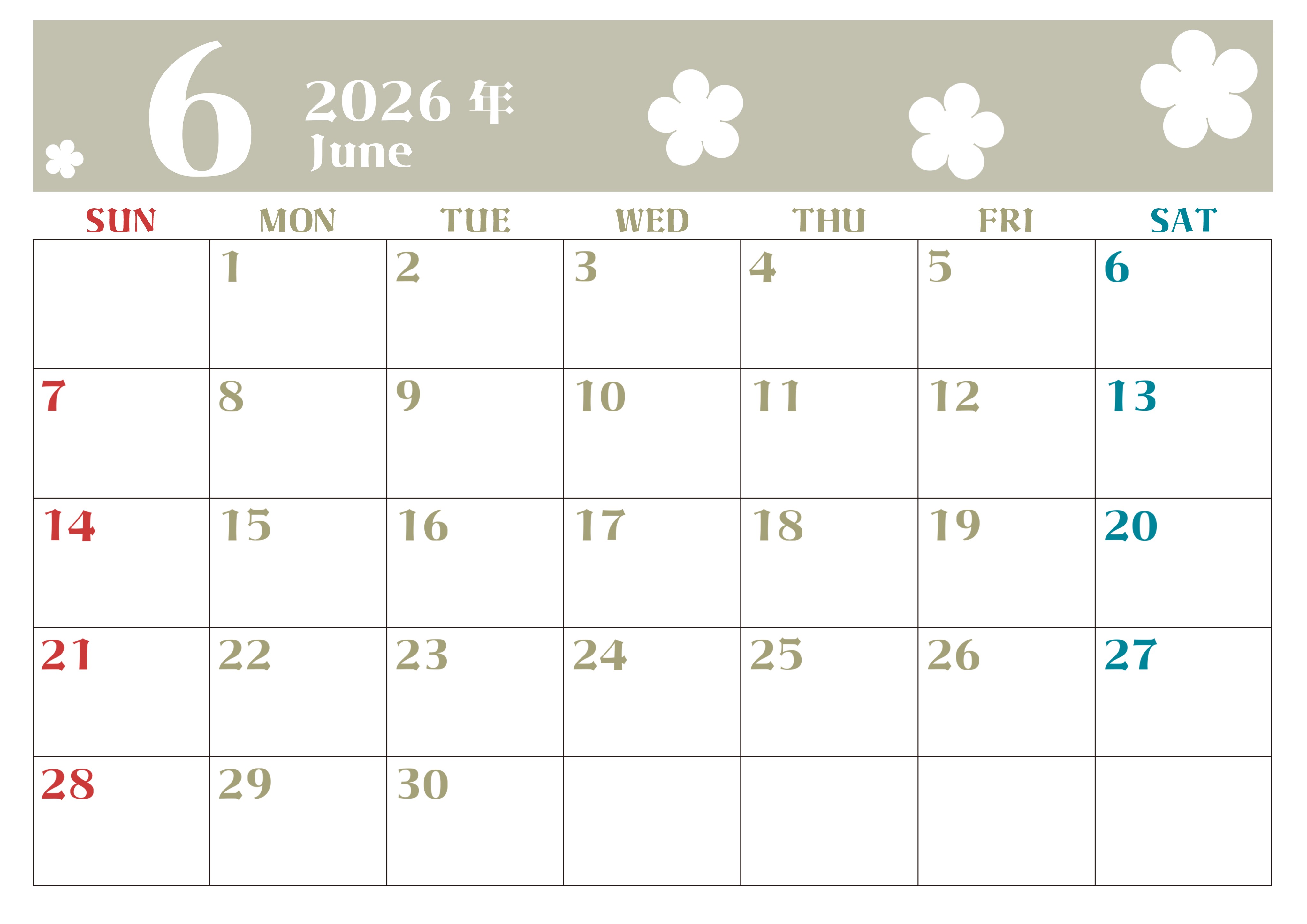 2026年6月カレンダーは横型日曜始まりでフラワーシルエットが上品でおしゃれなお花のデザインです。暮らしにほっこり休み時間を添えるプラン立てにおすすめの無料ダウンロード可能コンテンツです。(2026-01330600)