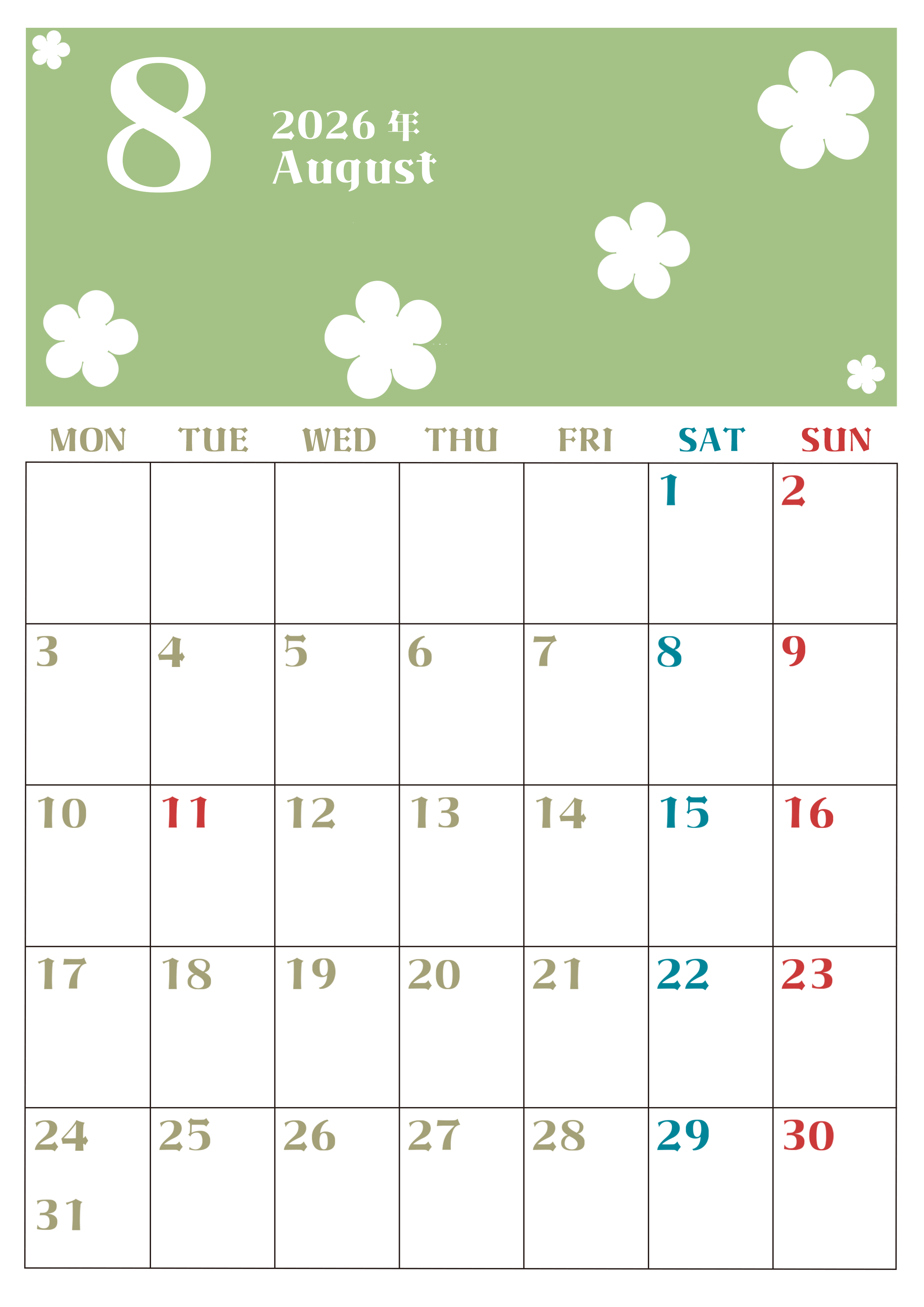 2026年8月カレンダーは縦型月曜始まりでフラワーシルエットが上品でおしゃれ(無料)(2026-01330811)