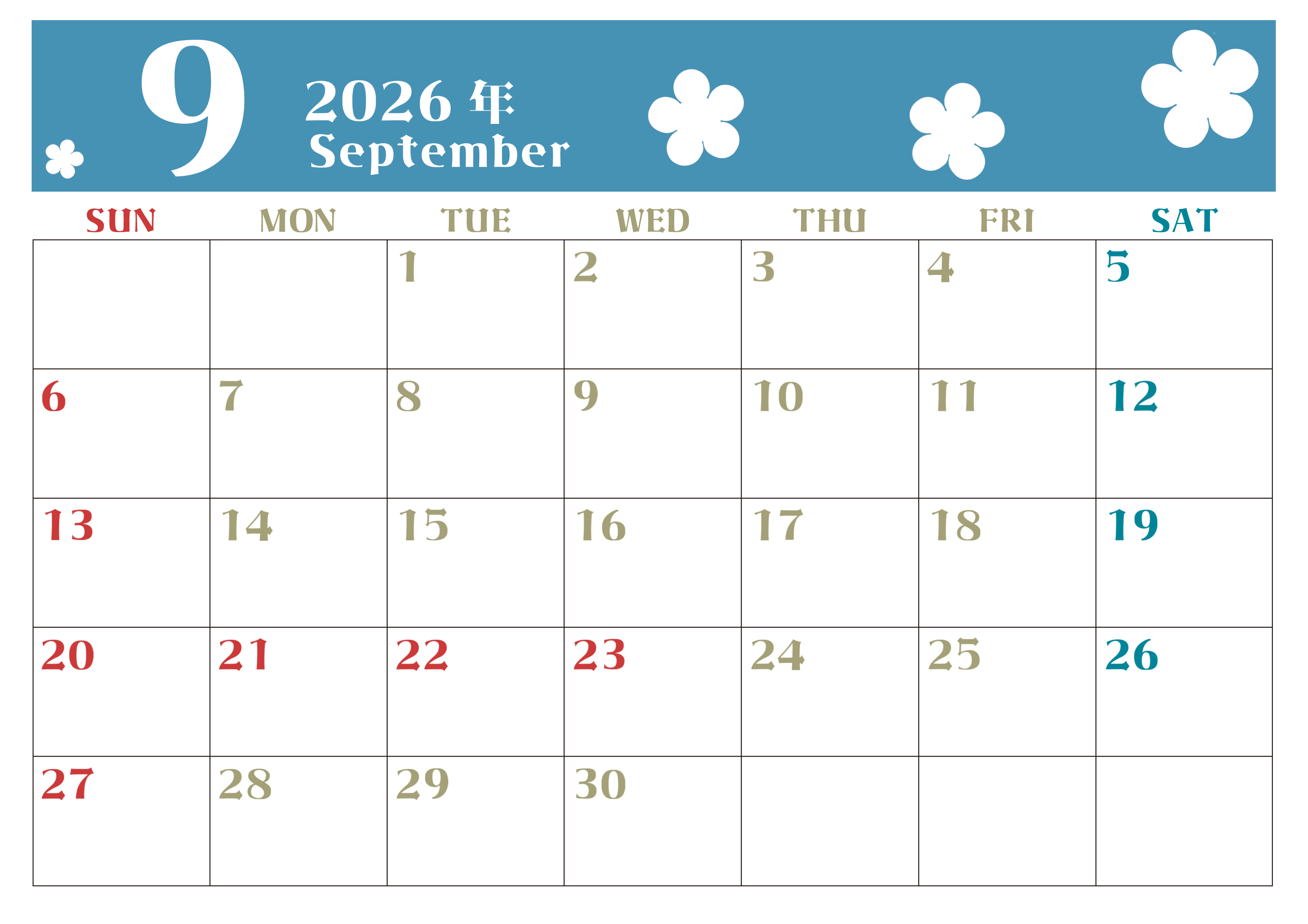 2026年・無料のカレンダーテンプレート 2026年9月カレンダーは横型日曜始まりでフラワーシルエットが上品でおしゃれ(無料)(2026-01330900) 素材状デザイン王 2025年4月10日 2026年9月カレンダーは横型日曜始まりでフラワーシルエットが上品でおしゃれなお花のデザインです。暮らしにほっこり休み時間を添えるプラン立てにおすすめの無料ダウンロード可能コンテンツです。(2026-01330900) おしゃれ 9月 草花 横型のカレンダー 日曜始まり カレンダーデザイン-0133