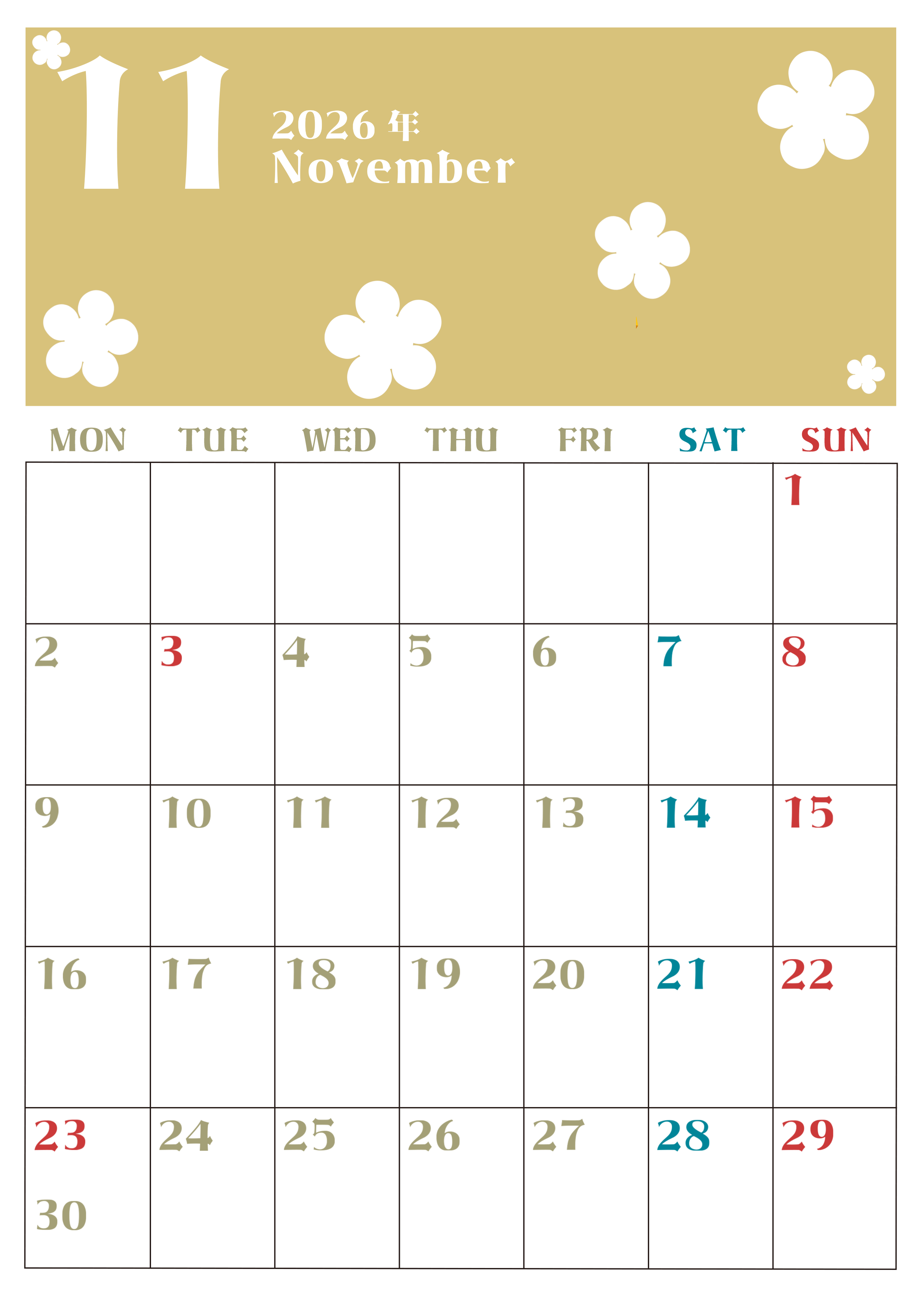 2026年11月カレンダーは縦型月曜始まりでフラワーシルエットが上品でおしゃれなお花のデザインです。暮らしにほっこり休み時間を添えるプラン立てにおすすめの無料ダウンロード可能コンテンツです。(2026-01331111)