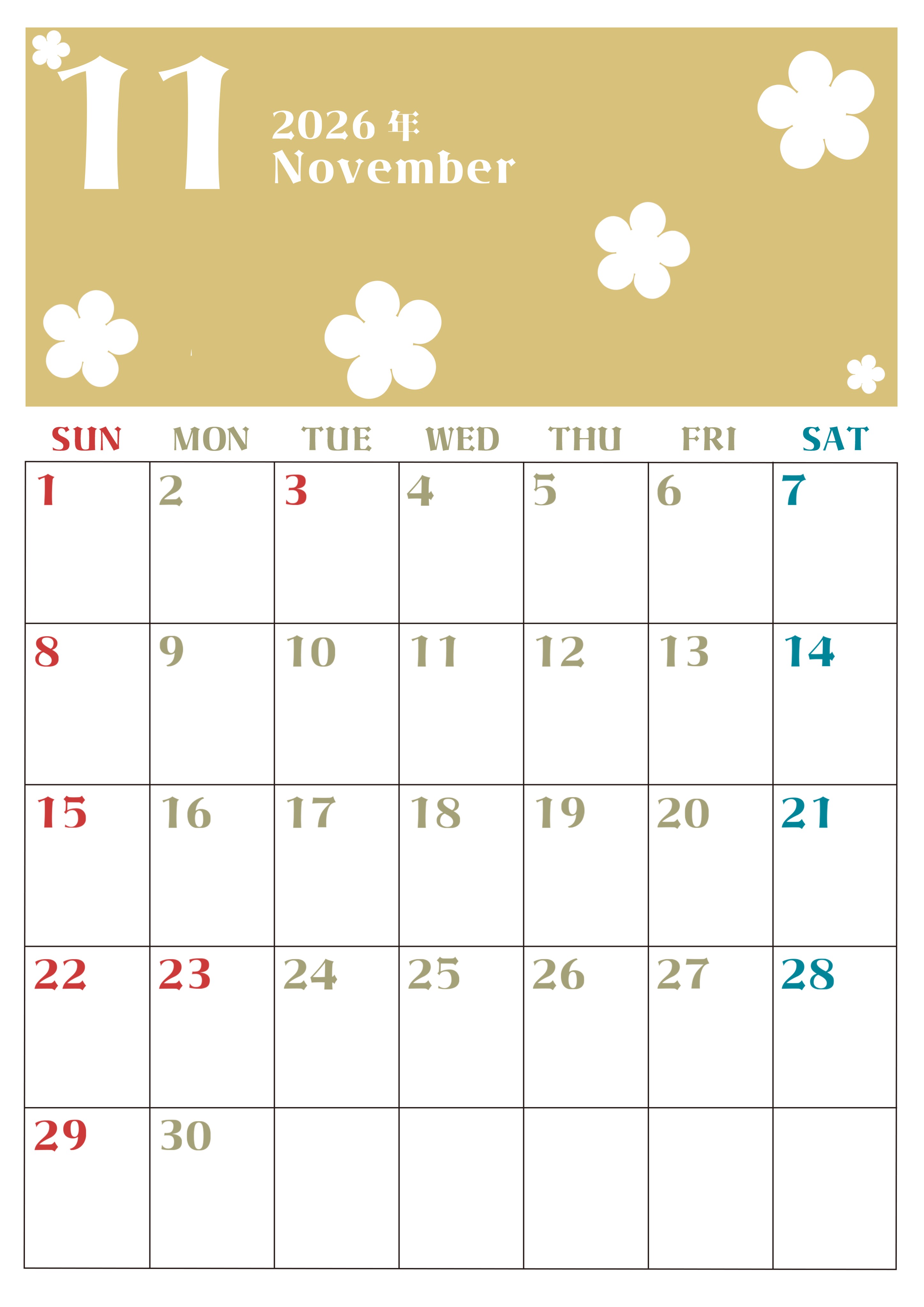 2026年・無料のカレンダーテンプレート 2026年11月カレンダーは縦型日曜始まりでフラワーシルエットが上品でおしゃれ(無料)(2026-01331110) 素材状デザイン王 2025年4月10日 2026年11月カレンダーは縦型日曜始まりでフラワーシルエットが上品でおしゃれなお花のデザインです。暮らしにほっこり休み時間を添えるプラン立てにおすすめの無料ダウンロード可能コンテンツです。(2026-01331110) おしゃれ 11月 草花 縦型のカレンダー 日曜始まり カレンダーデザイン-0133