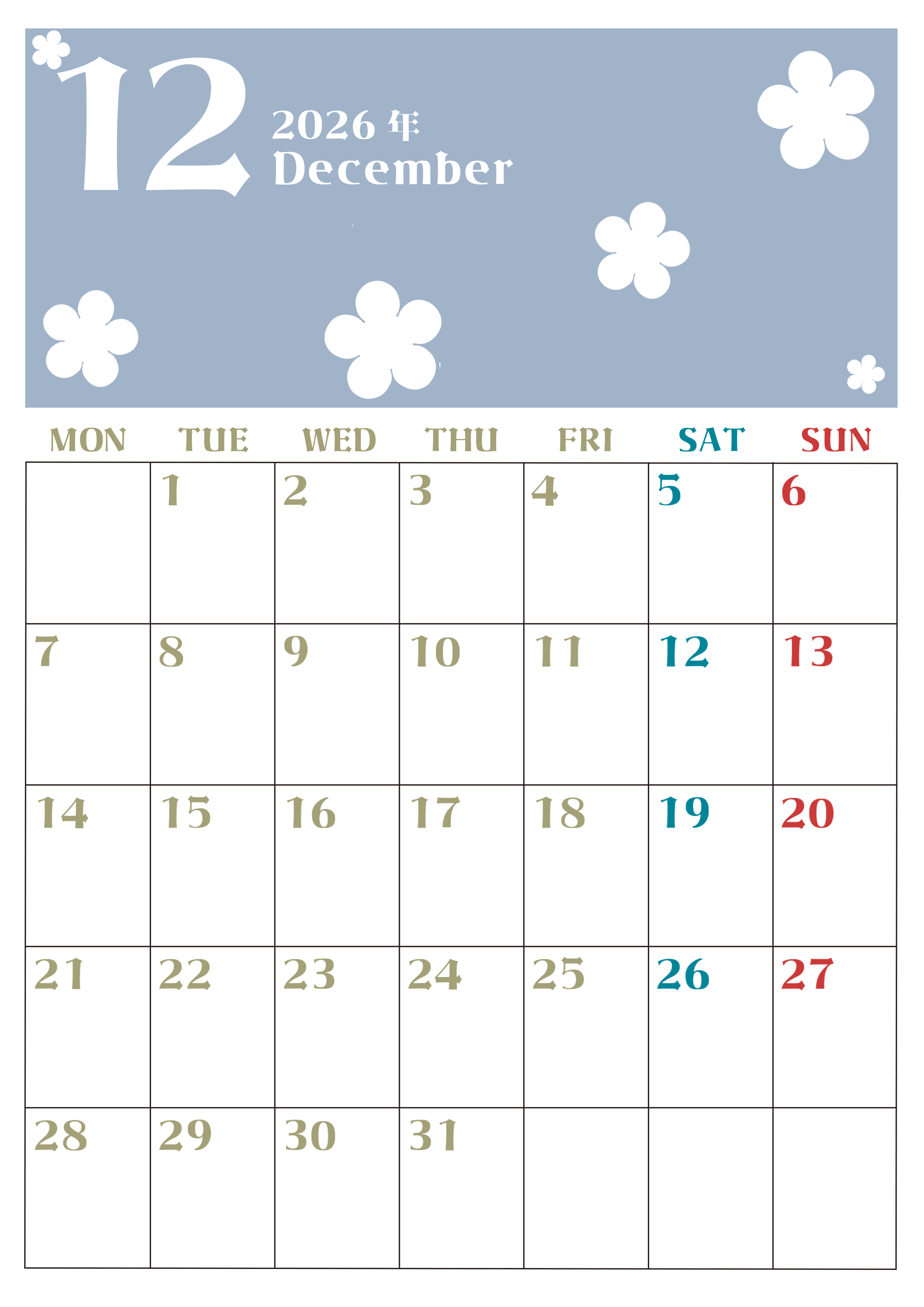 2026年12月カレンダーは縦型月曜始まりでフラワーシルエットが上品でおしゃれなお花のデザインです。暮らしにほっこり休み時間を添えるプラン立てにおすすめの無料ダウンロード可能コンテンツです。(2026-01331211)