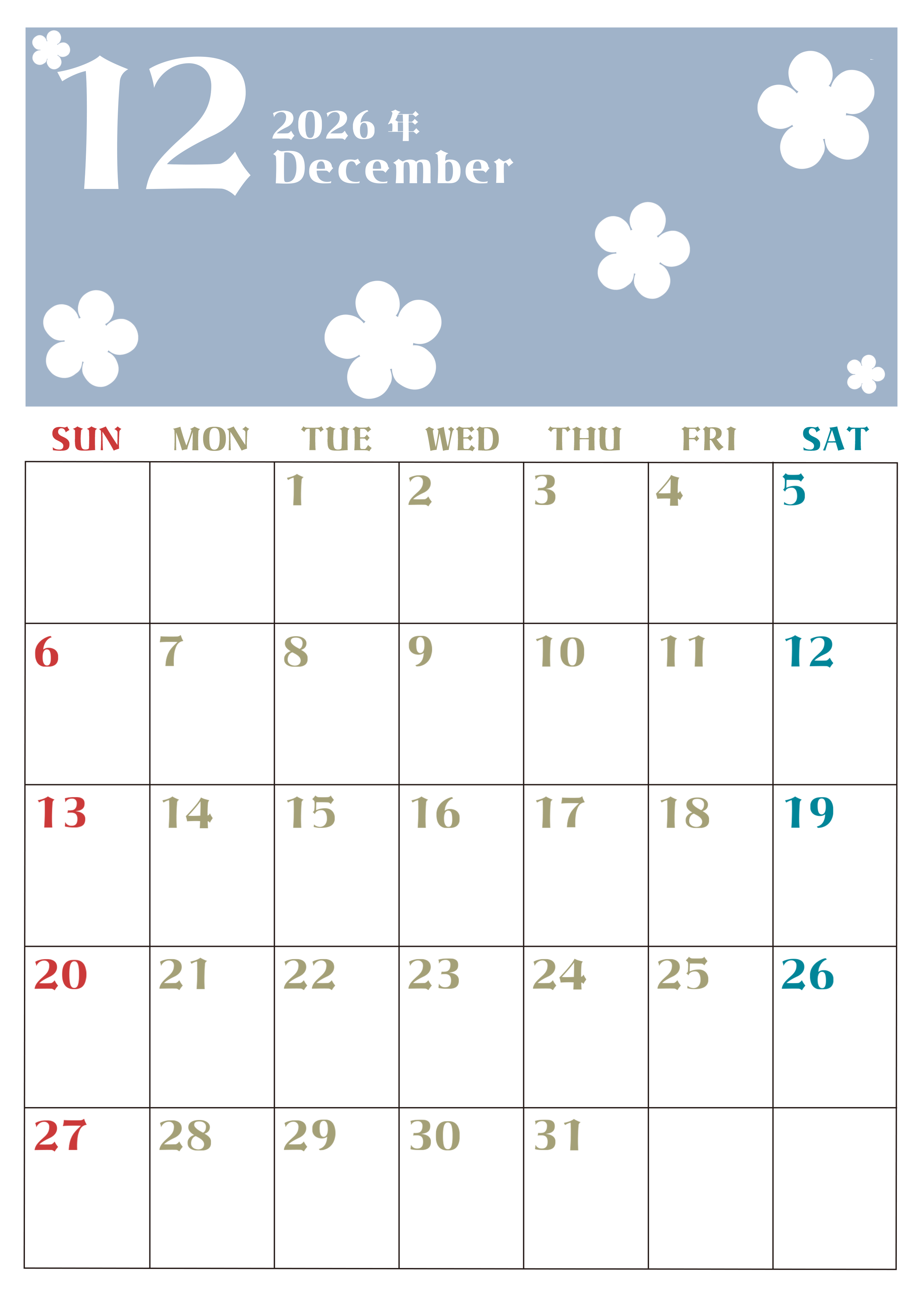 2026年・無料のカレンダーテンプレート 2026年12月カレンダーは縦型日曜始まりでフラワーシルエットが上品でおしゃれ(無料)(2026-01331210) 素材状デザイン王 2025年4月10日 2026年12月カレンダーは縦型日曜始まりでフラワーシルエットが上品でおしゃれなお花のデザインです。暮らしにほっこり休み時間を添えるプラン立てにおすすめの無料ダウンロード可能コンテンツです。(2026-01331210) おしゃれ 12月 草花 縦型のカレンダー 日曜始まり カレンダーデザイン-0133