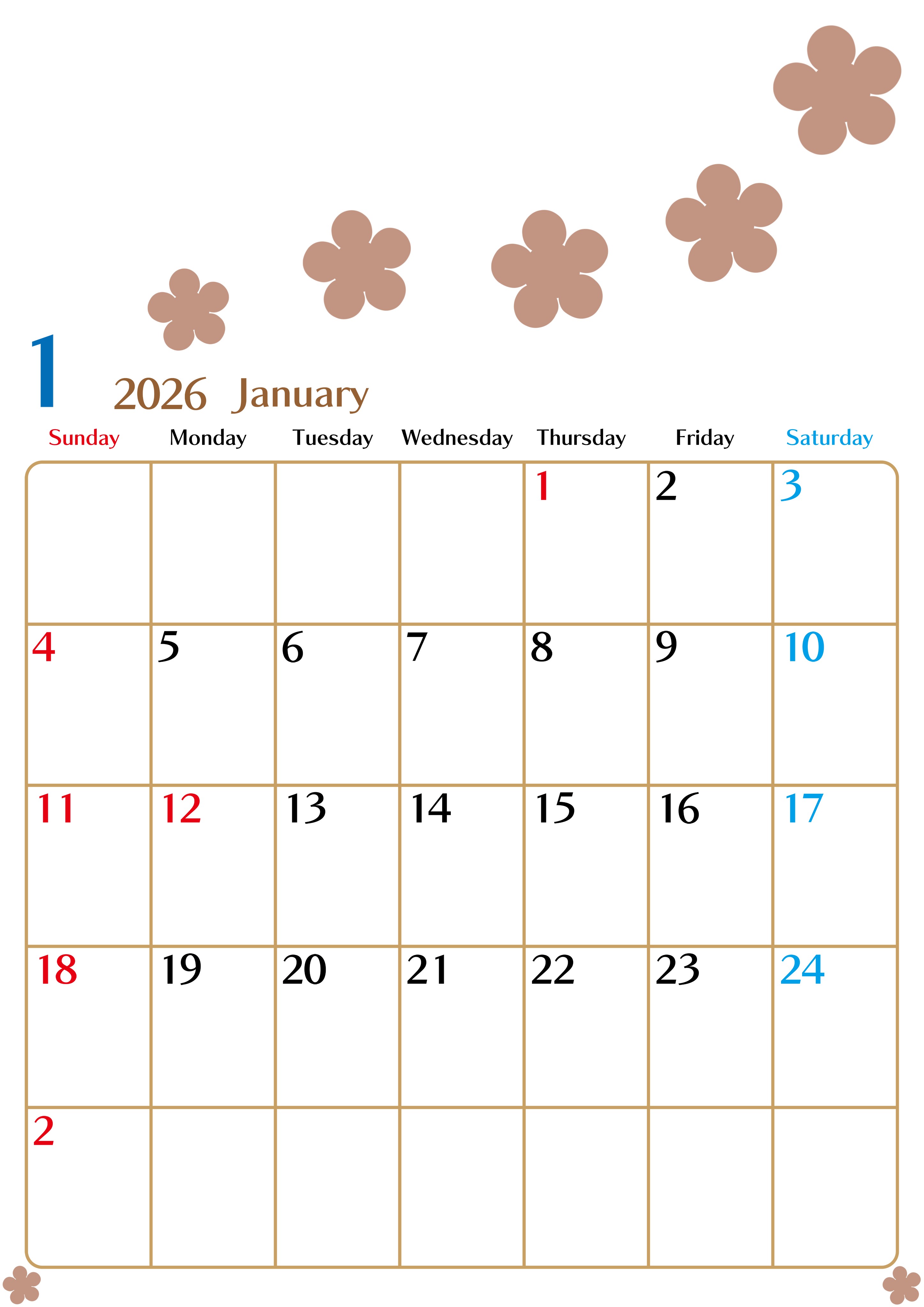 2026年・無料のカレンダーテンプレート 2026年1月カレンダーは縦型日曜始まりでベージュの花がおしゃれ:無料(2026-01340110) 素材状デザイン王 2025年4月10日 2026年1月カレンダーは縦型日曜始まりでベージュの花がおしゃれです。無料で使えるので暮らしの整理に役立ちます。(2026-01340110) おしゃれ 1月 草花 縦型のカレンダー 日曜始まり カレンダーデザイン-0134