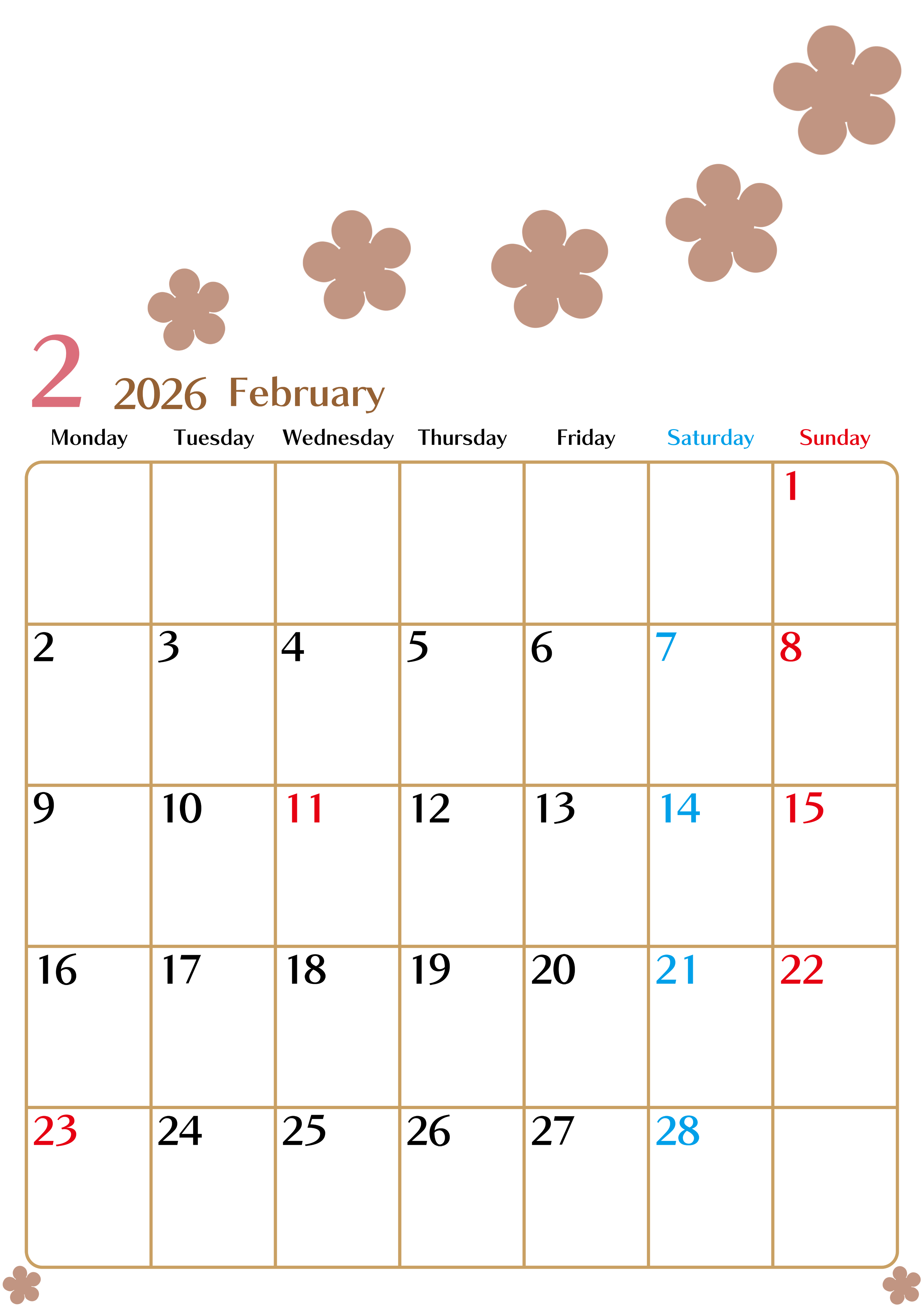 2026年2月カレンダーは縦型月曜始まりでベージュの花がおしゃれ:無料(2026-01340211)