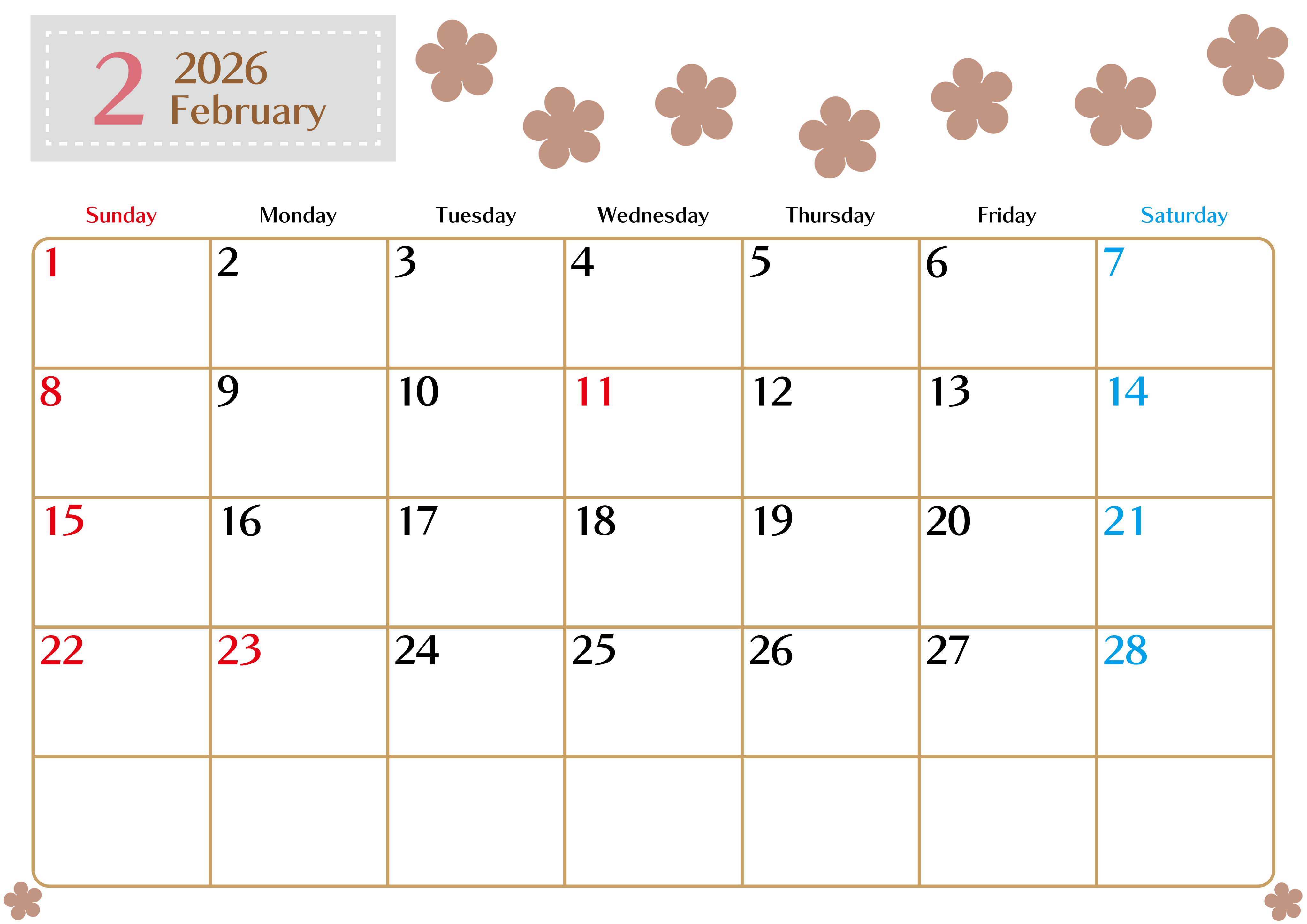2026年・無料のカレンダーテンプレート 2026年2月カレンダーは横型日曜始まりでベージュの花がおしゃれ:無料(2026-01340200) 素材状デザイン王 2025年4月10日 2026年2月カレンダーは横型日曜始まりでベージュの花がおしゃれです。無料で使えるので暮らしの整理に役立ちます。(2026-01340200) おしゃれ 2月 草花 横型のカレンダー 日曜始まり カレンダーデザイン-0134