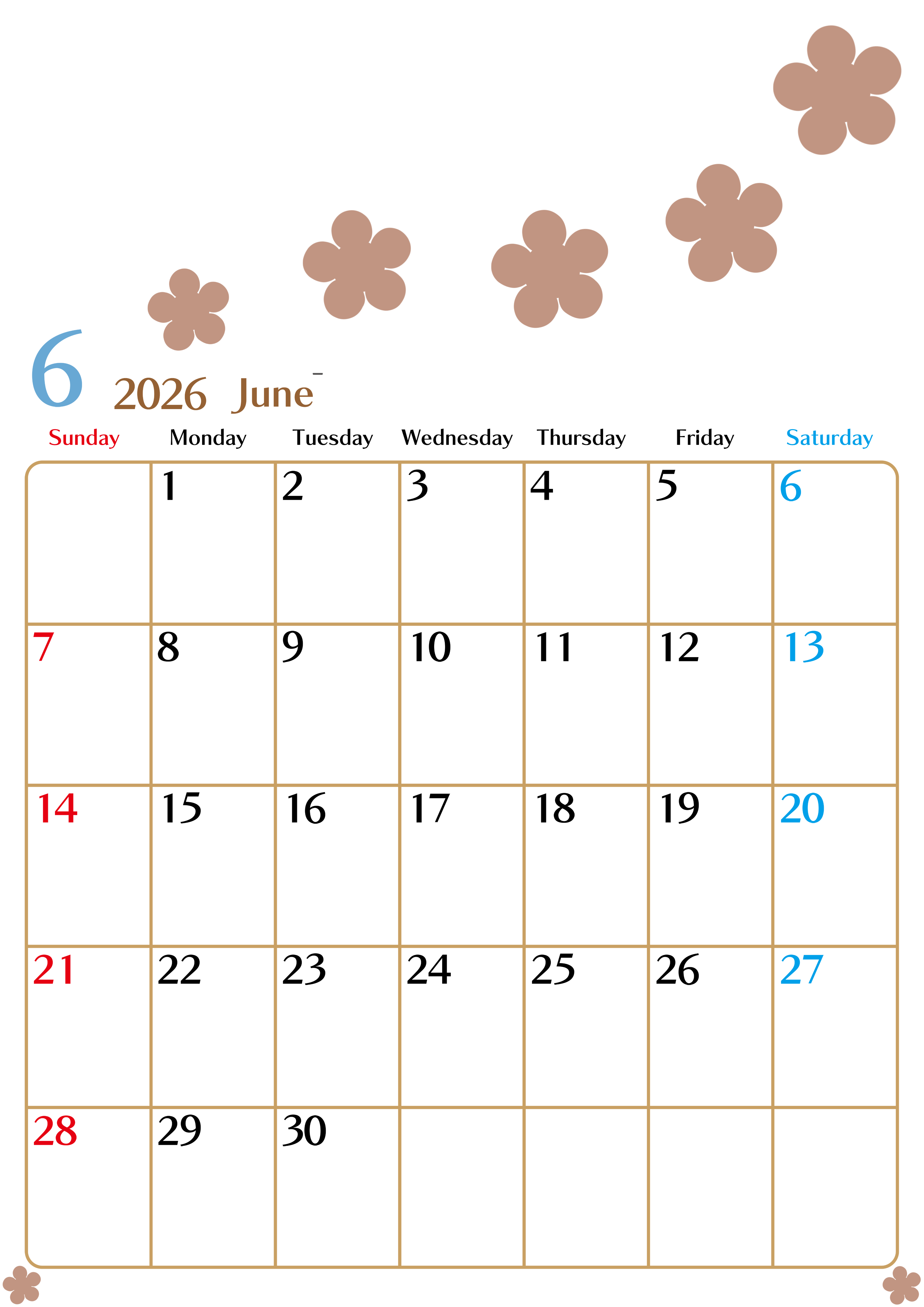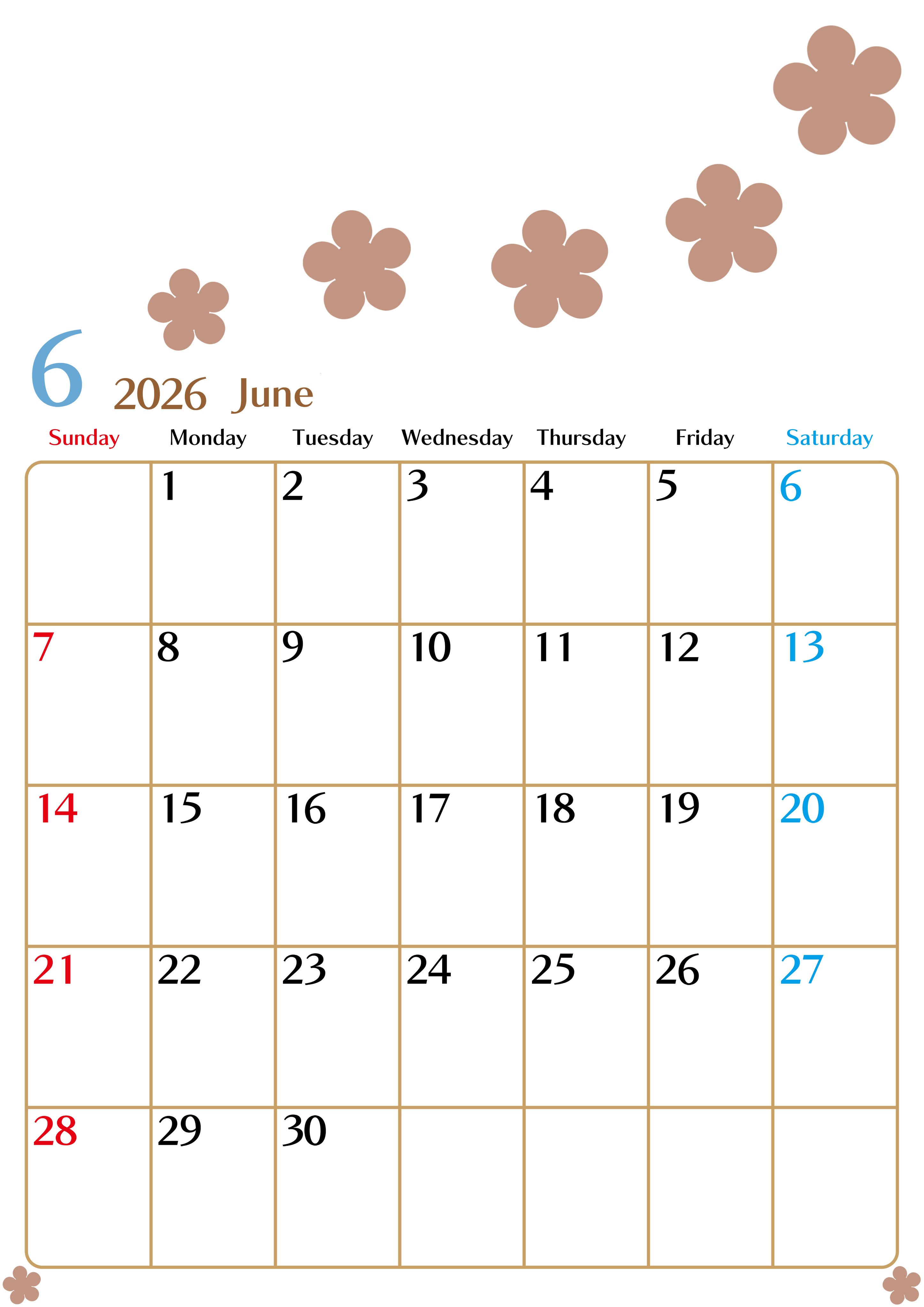 2026年・無料のカレンダーテンプレート 2026年6月カレンダーは縦型日曜始まりでベージュの花がおしゃれ:無料(2026-01340610) 素材状デザイン王 2025年4月10日 2026年6月カレンダーは縦型日曜始まりでベージュの花がおしゃれです。無料で使えるので暮らしの整理に役立ちます。(2026-01340610) おしゃれ 6月 草花 縦型のカレンダー 日曜始まり カレンダーデザイン-0134