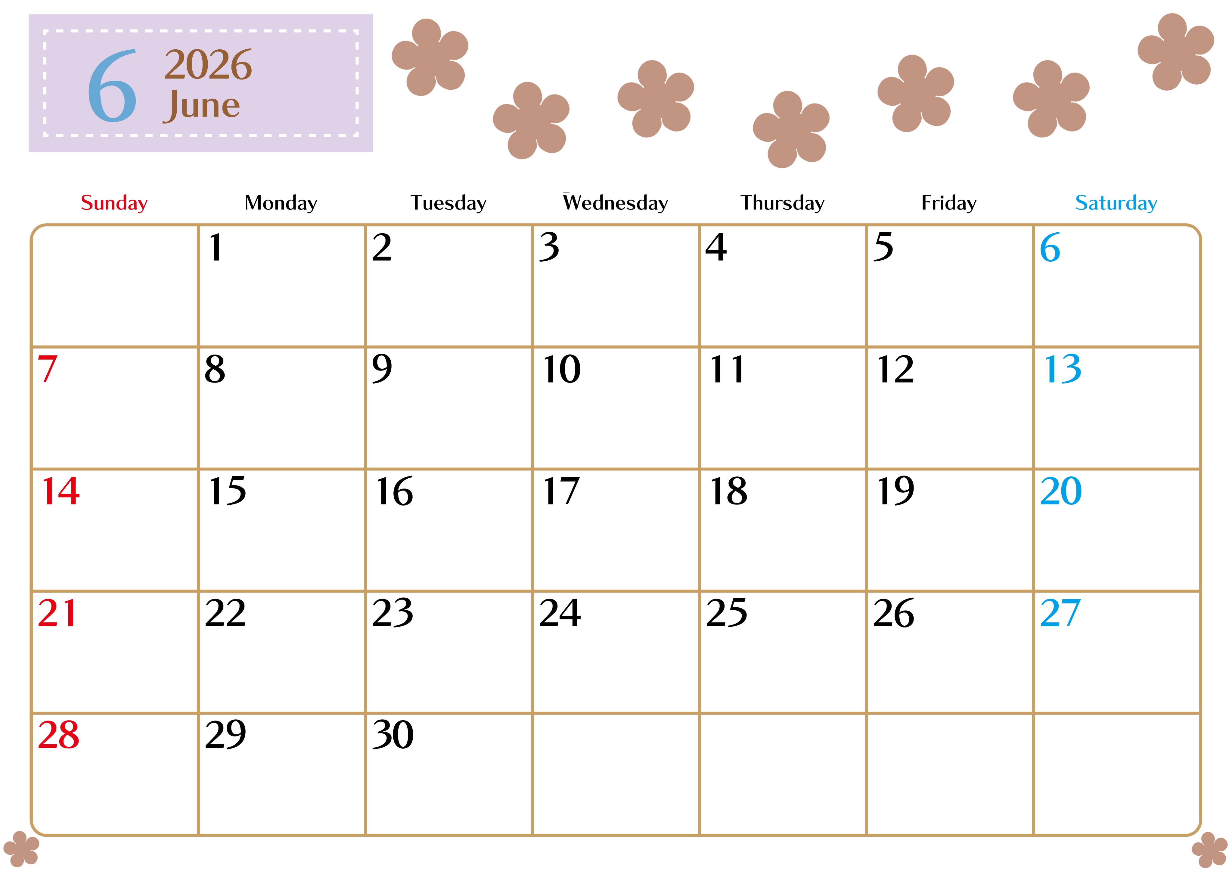 2026年・無料のカレンダーテンプレート 2026年6月カレンダーは横型日曜始まりでベージュの花がおしゃれ:無料(2026-01340600) 素材状デザイン王 2025年4月10日 2026年6月カレンダーは横型日曜始まりでベージュの花がおしゃれです。無料で使えるので暮らしの整理に役立ちます。(2026-01340600) おしゃれ 6月 草花 横型のカレンダー 日曜始まり カレンダーデザイン-0134