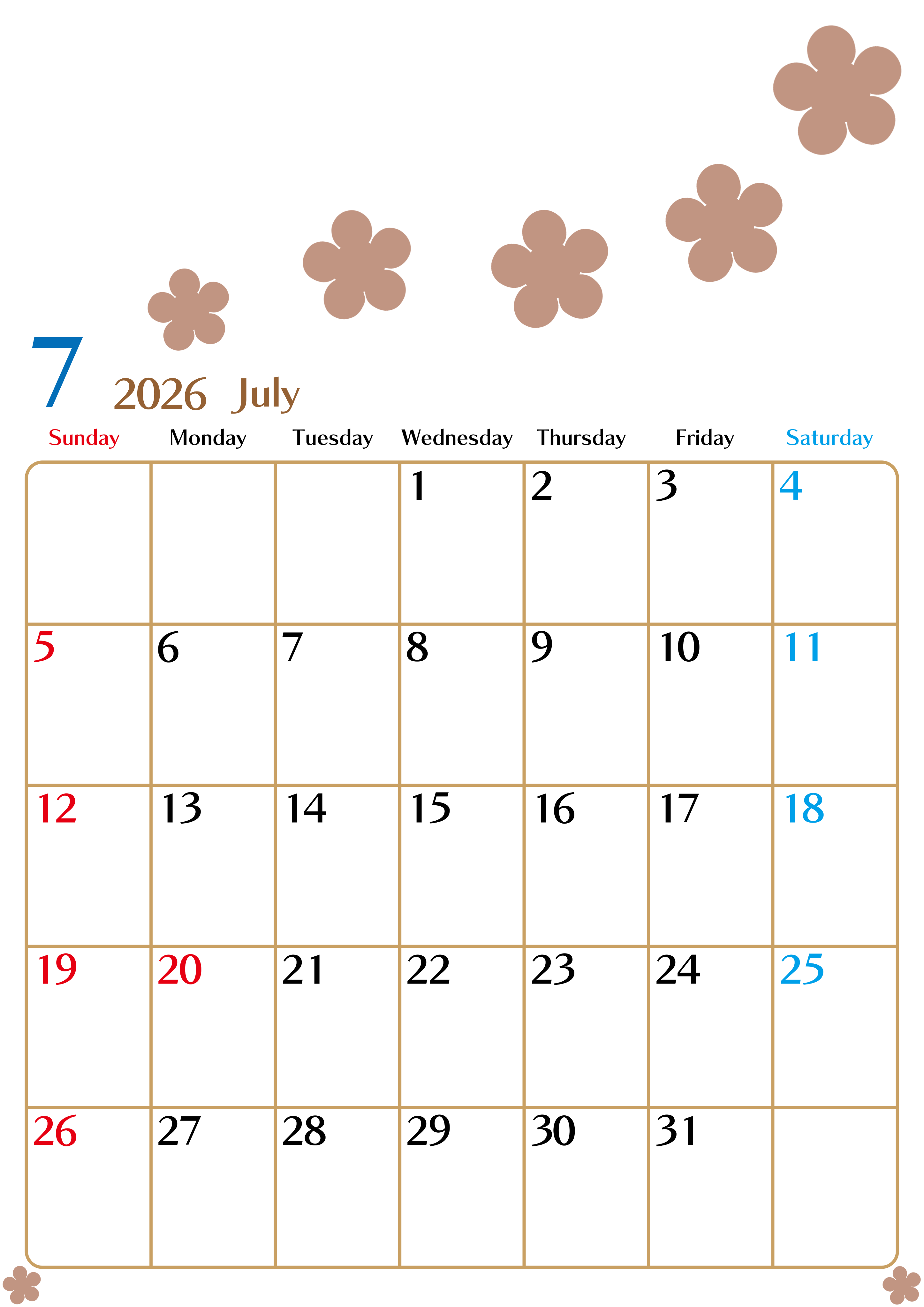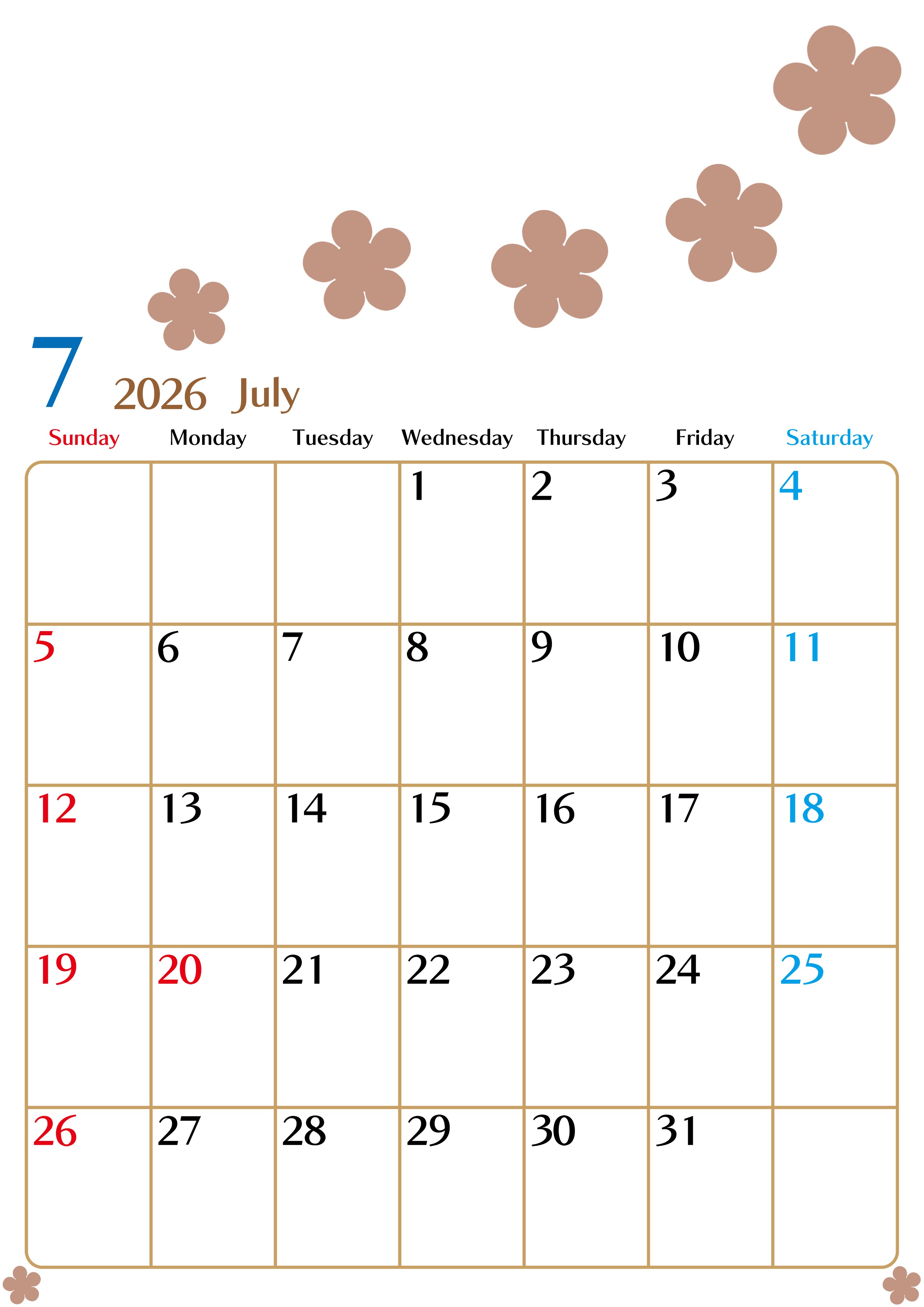 2026年・無料のカレンダーテンプレート 2026年7月カレンダーは縦型日曜始まり でベージュの花がおしゃれ:無料(2026-01340710) 素材状デザイン王 2025年4月10日 2026年7月カレンダーは縦型日曜始まりでベージュの花がおしゃれです。無料で使えるので暮らしの整理に役立ちます。(2026-01340710) おしゃれ 7月 草花 縦型のカレンダー 日曜始まり カレンダーデザイン-0134