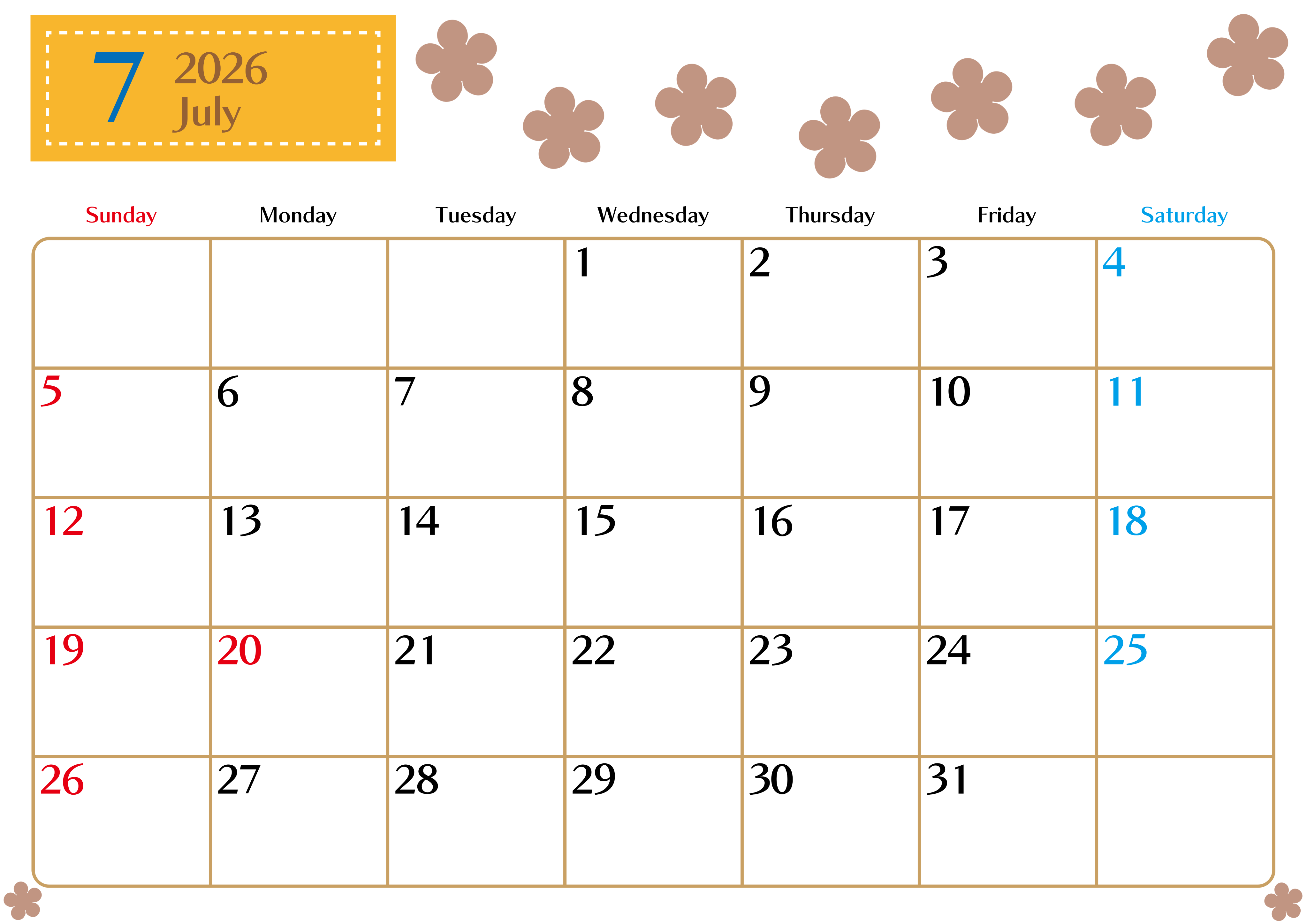 2026年7月カレンダーは横型日曜始まりでベージュの花がおしゃれ:無料(2026-01340700)