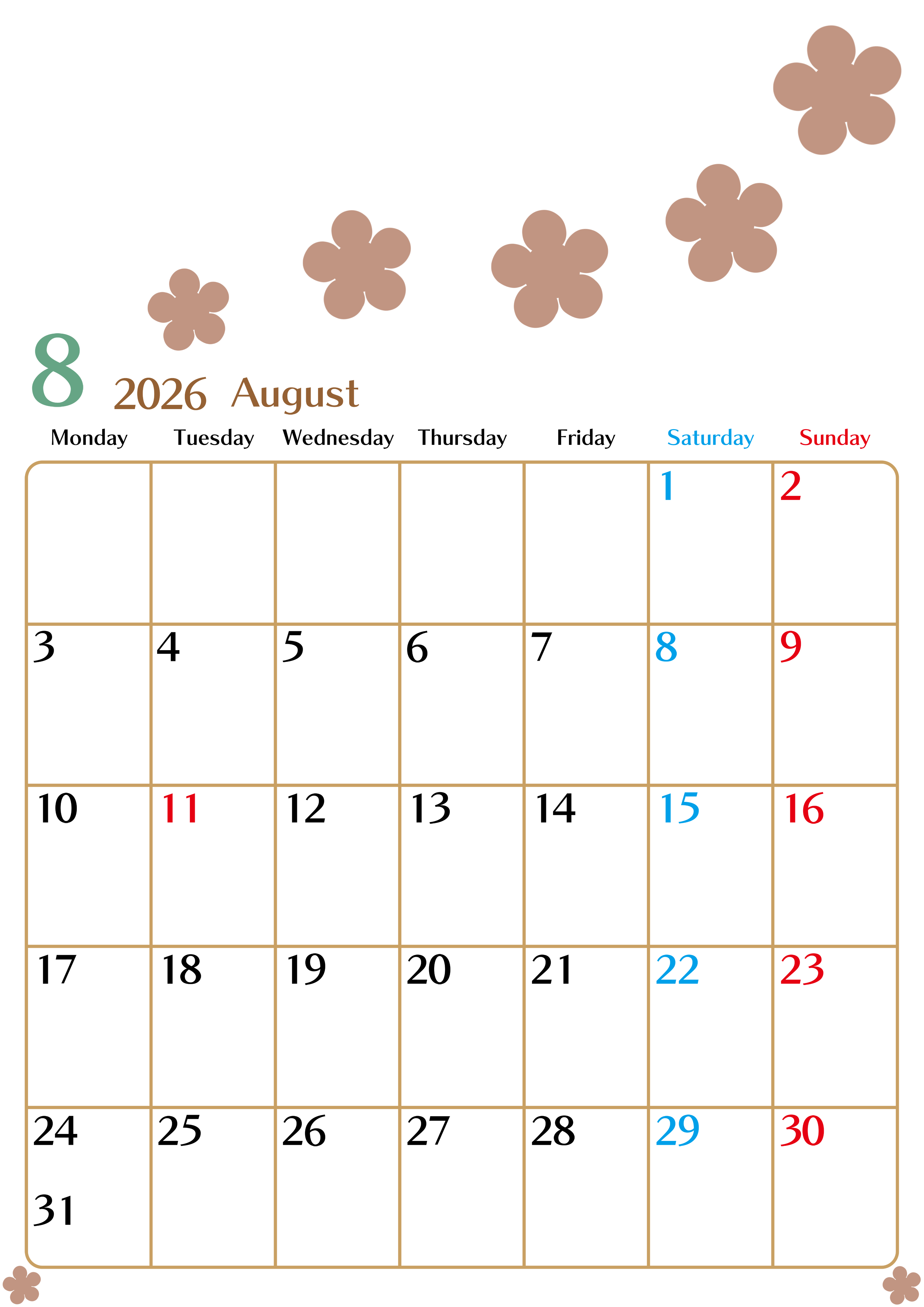 2026年・無料のカレンダーテンプレート 2026年8月カレンダーは縦型月曜始まりでベージュの花がおしゃれ:無料(2026-01340811) 素材状デザイン王 2025年4月10日 2026年8月カレンダーは縦型月曜始まりでベージュの花がおしゃれです。無料で使えるので暮らしの整理に役立ちます。(2026-01340811) おしゃれ 8月 草花 縦型のカレンダー 月曜始まり カレンダーデザイン-0134