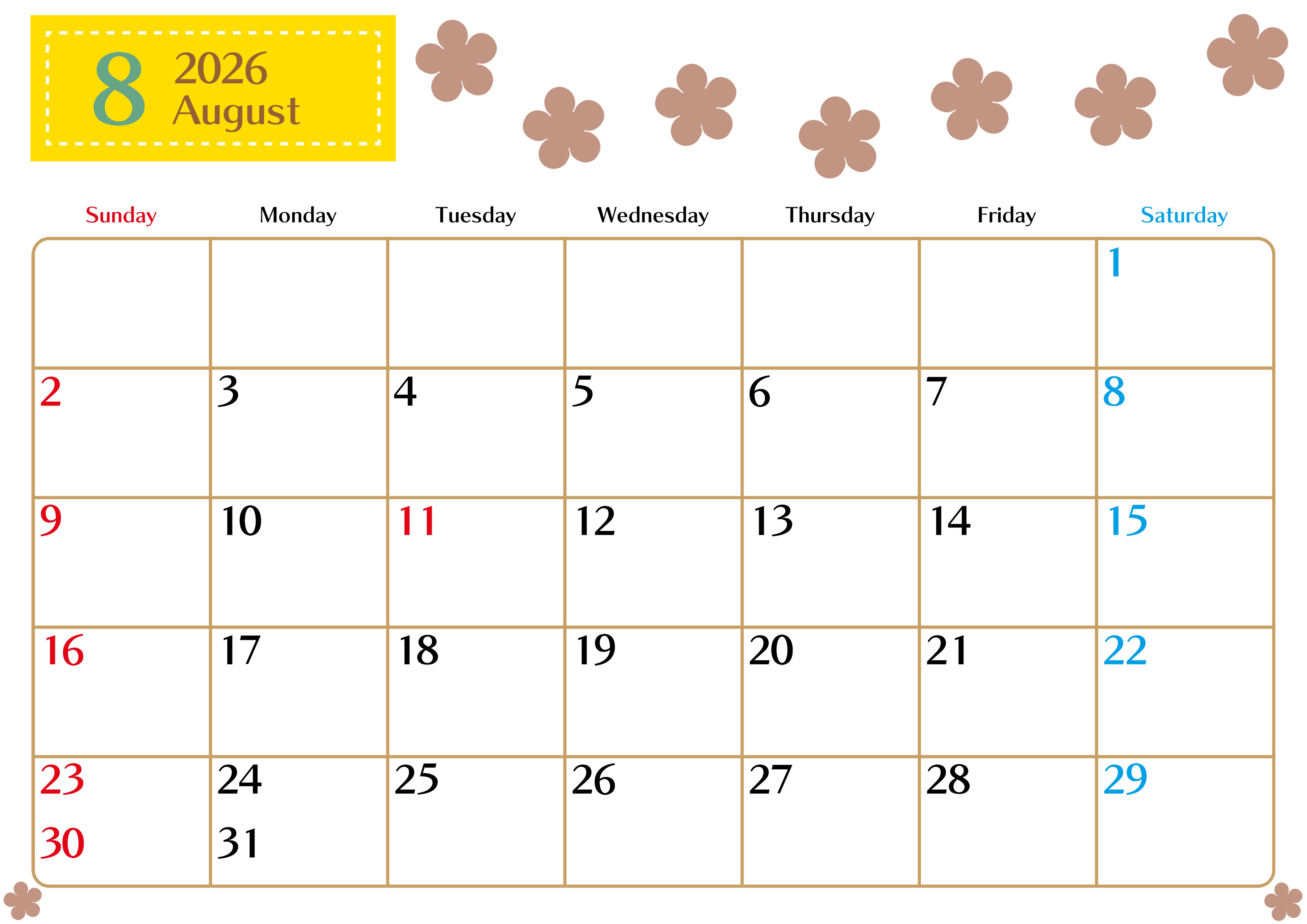 2026年8月カレンダーは横型日曜始まりでベージュの花がおしゃれ:無料(2026-01340800)