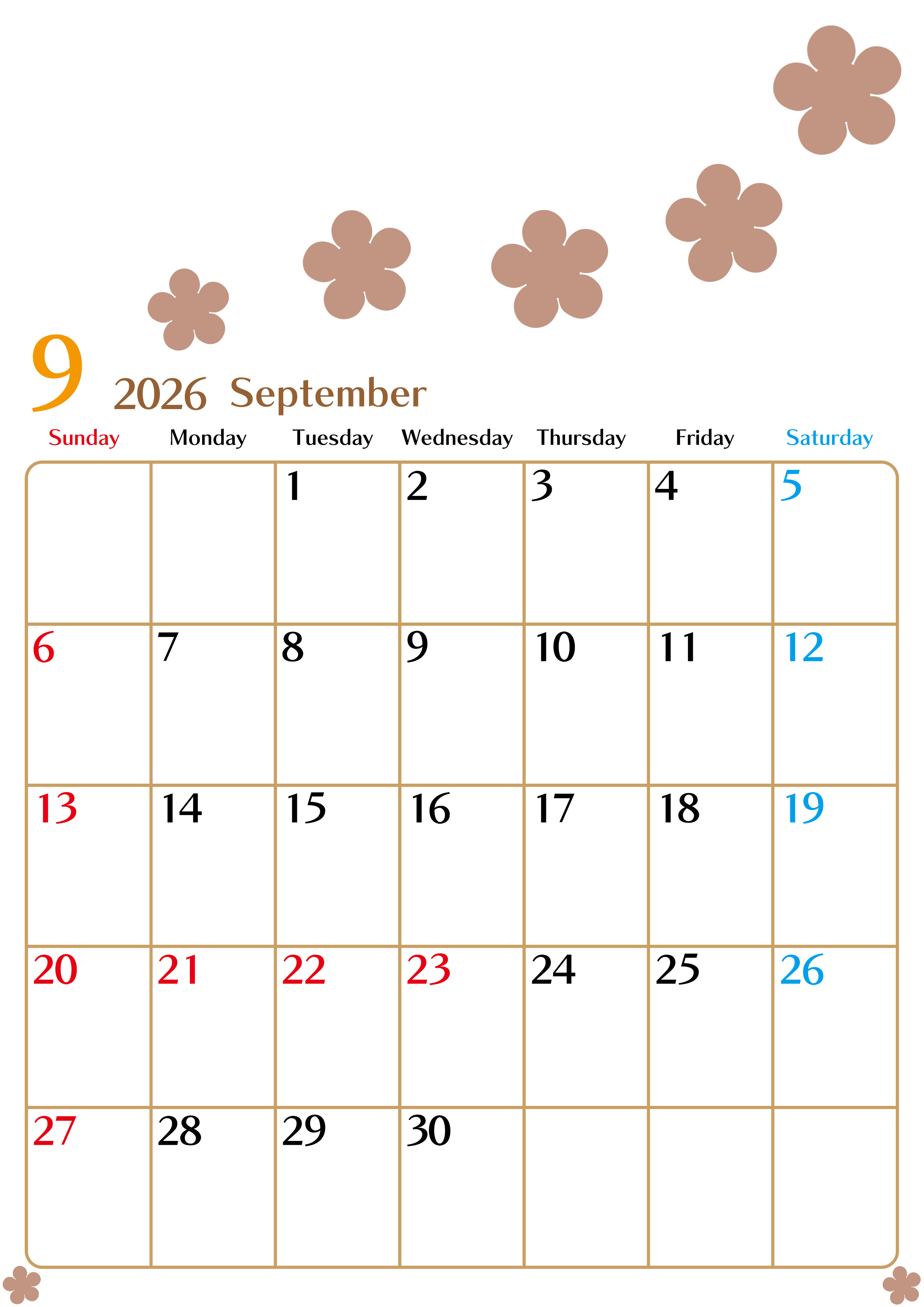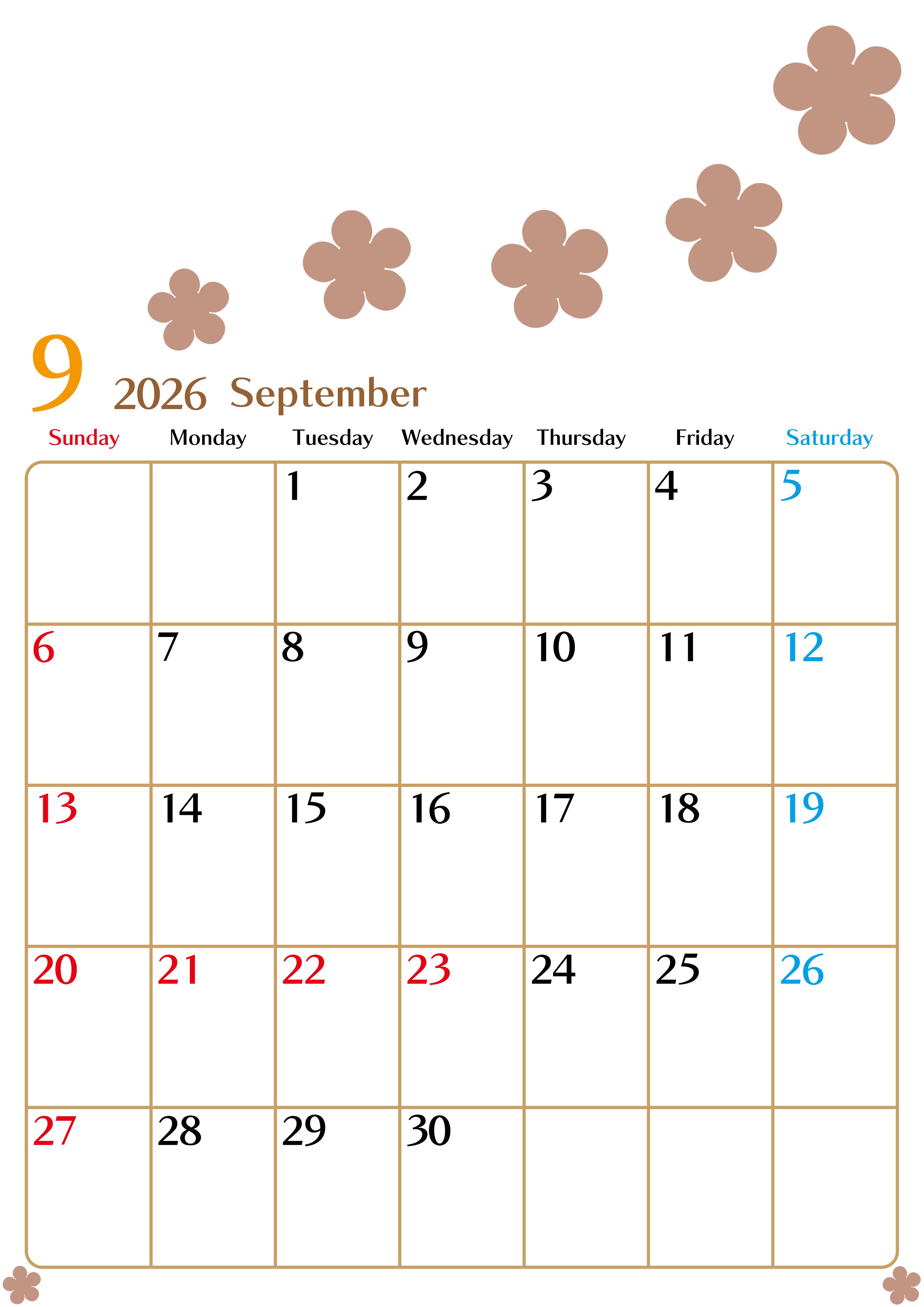 2026年9月カレンダーは縦型日曜始まりでベージュの花がおしゃれ:無料(2026-01340910)