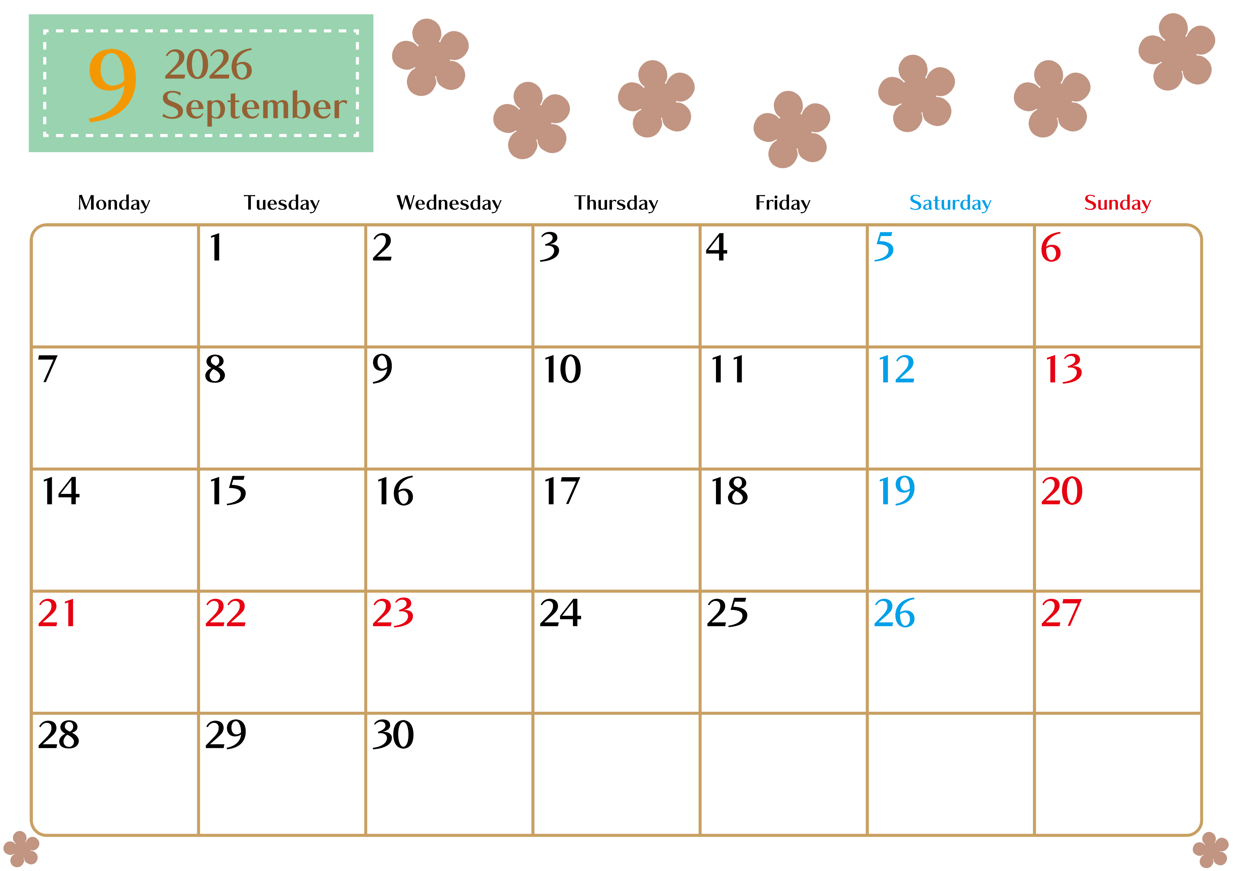 2026年・無料のカレンダーテンプレート 2026年9月カレンダーは横型月曜始まりでベージュの花がおしゃれ:無料(2026-01340901) 素材状デザイン王 2025年4月10日 2026年9月カレンダーは横型月曜始まりでベージュの花がおしゃれです。無料で使えるので暮らしの整理に役立ちます。(2026-01340901) おしゃれ 9月 草花 横型のカレンダー 月曜始まり カレンダーデザイン-0134