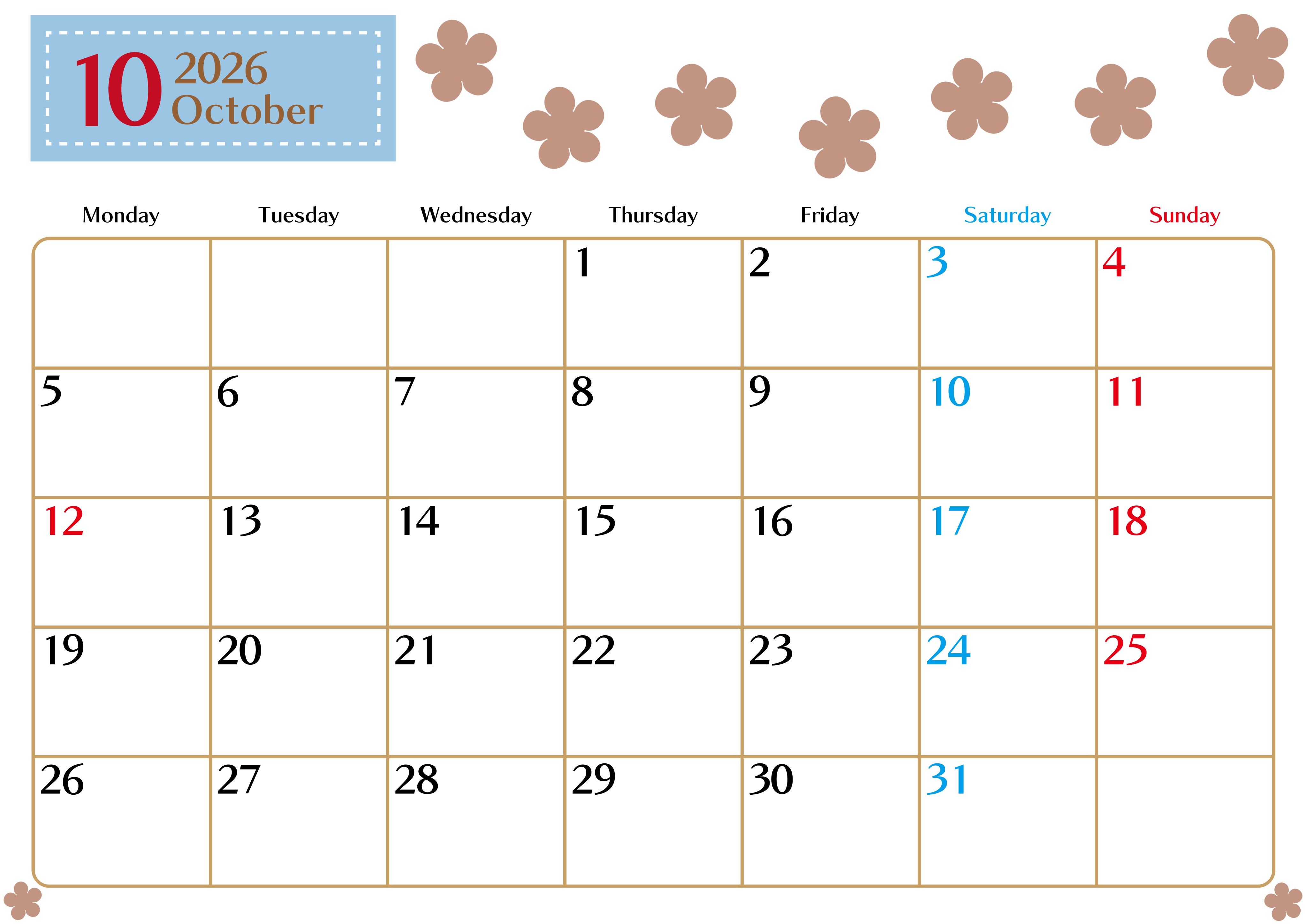 2026年10月カレンダーは横型月曜始まりでベージュの花がおしゃれ:無料(2026-01341001)