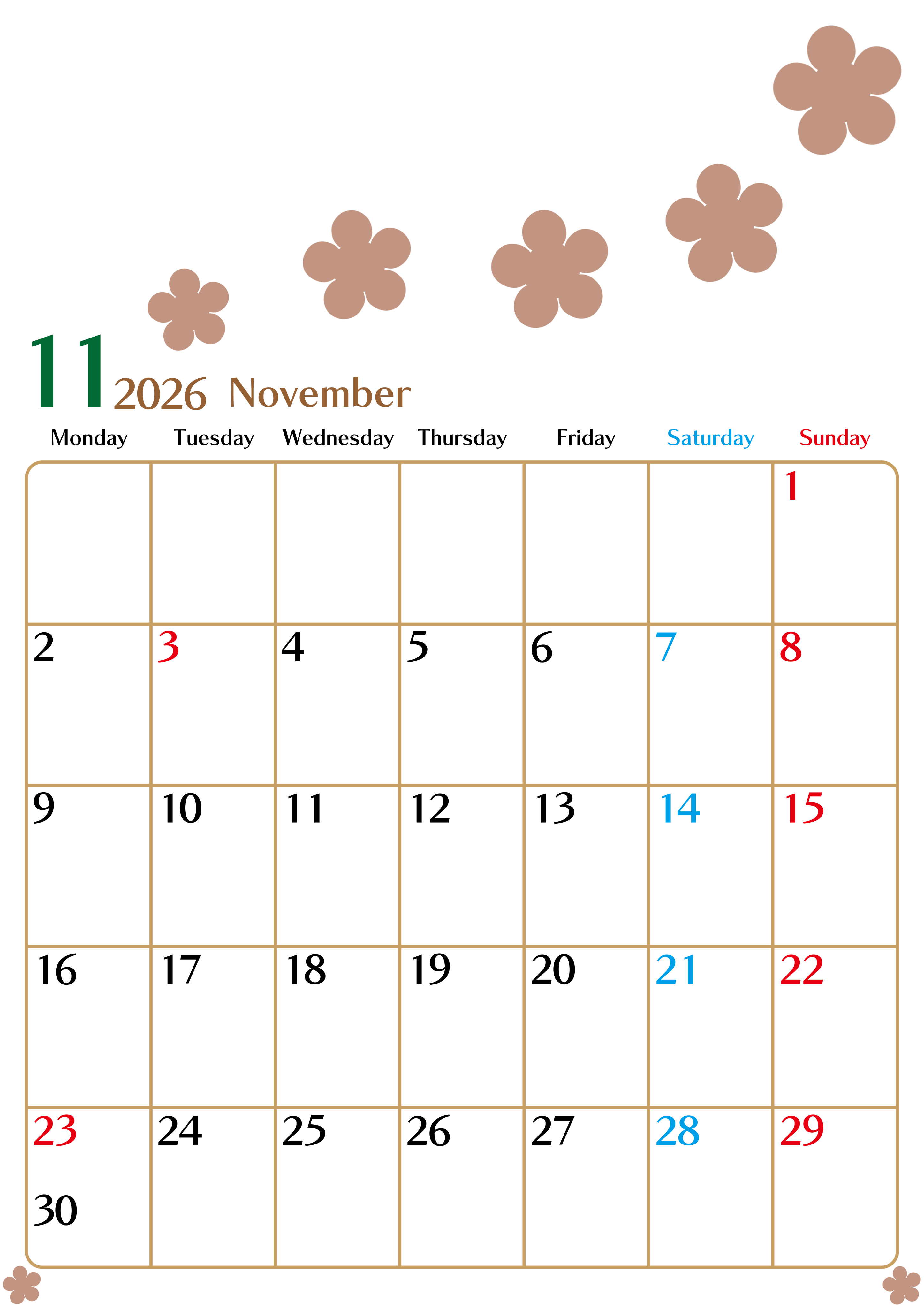 2026年・無料のカレンダーテンプレート 2026年11月カレンダーは縦型月曜始まりでベージュの花がおしゃれ:無料(2026-01341111) 素材状デザイン王 2025年4月10日 2026年11月カレンダーは縦型月曜始まりでベージュの花がおしゃれです。無料で使えるので暮らしの整理に役立ちます。(2026-01341111) おしゃれ 11月 草花 縦型のカレンダー 月曜始まり カレンダーデザイン-0134
