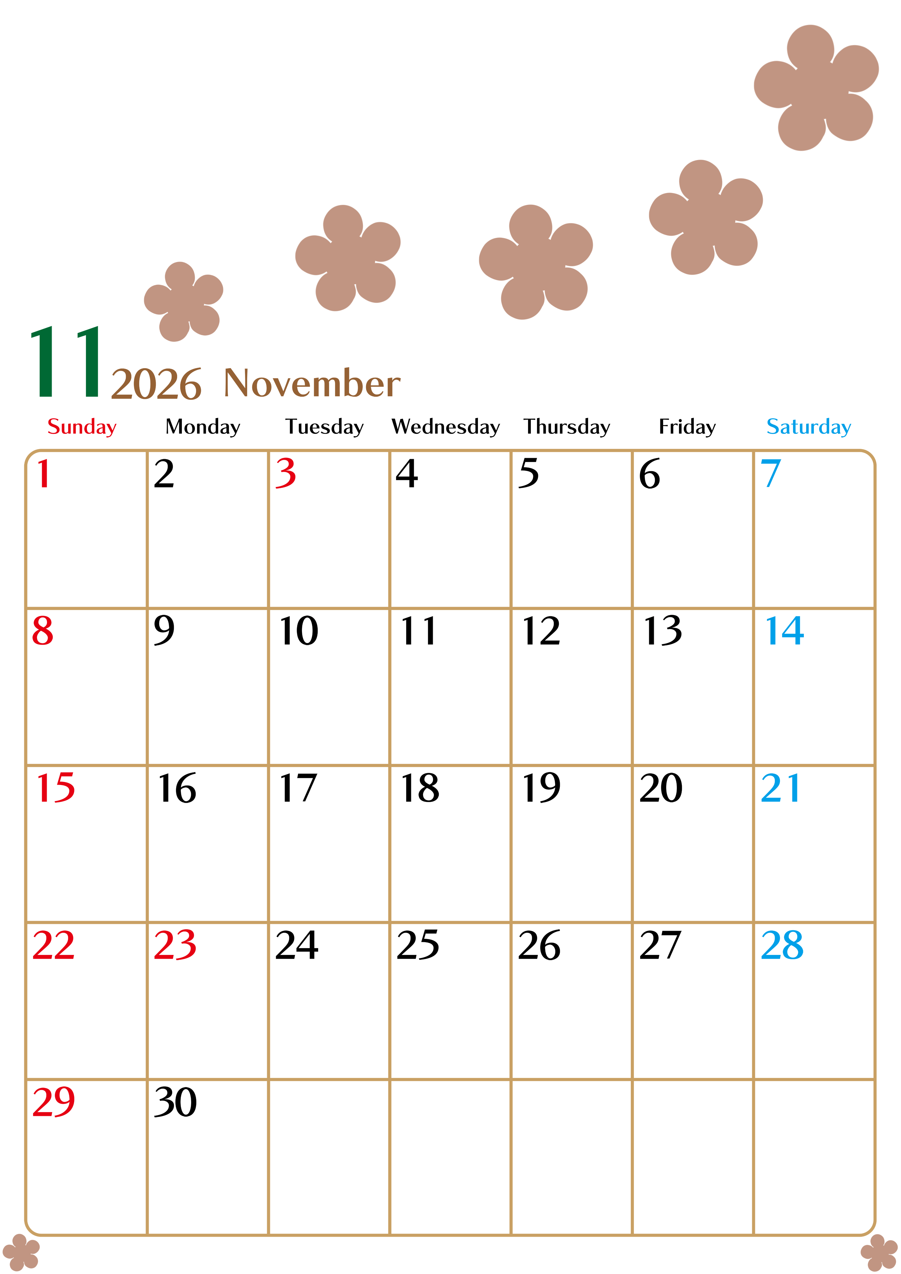2026年・無料のカレンダーテンプレート 2026年11月カレンダーは縦型日曜始まりでベージュの花がおしゃれ:無料(2026-01341110) 素材状デザイン王 2025年4月10日 2026年11月カレンダーは縦型日曜始まりでベージュの花がおしゃれです。無料で使えるので暮らしの整理に役立ちます。(2026-01341110) おしゃれ 11月 草花 縦型のカレンダー 日曜始まり カレンダーデザイン-0134