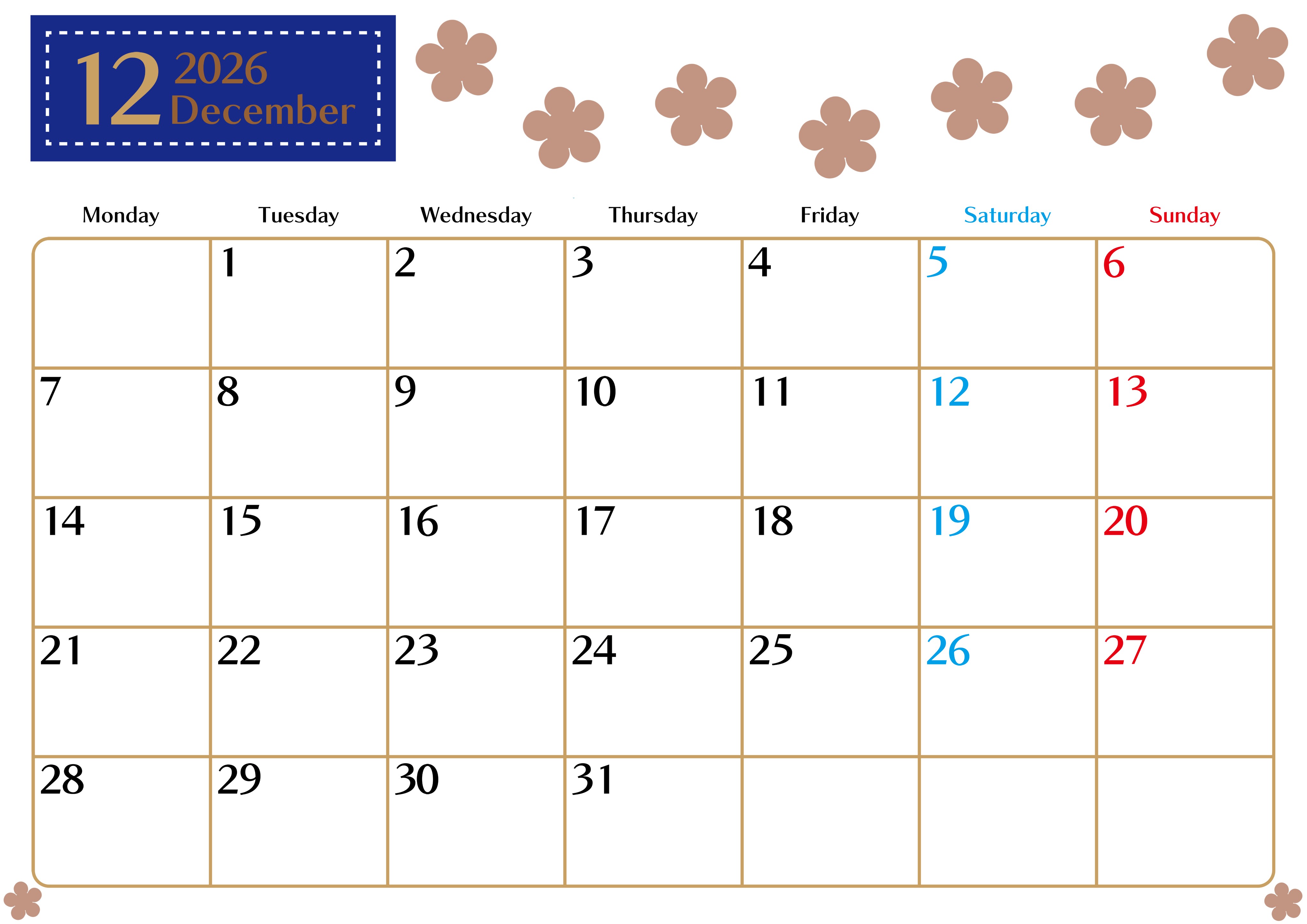 2026年・無料のカレンダーテンプレート 2026年12月カレンダーは横型月曜始まりでベージュの花がおしゃれ:無料(2026-01341201) 素材状デザイン王 2025年4月10日 2026年12月カレンダーは横型月曜始まりでベージュの花がおしゃれです。無料で使えるので暮らしの整理に役立ちます。(2026-01341201) おしゃれ 12月 草花 横型のカレンダー 月曜始まり カレンダーデザイン-0134