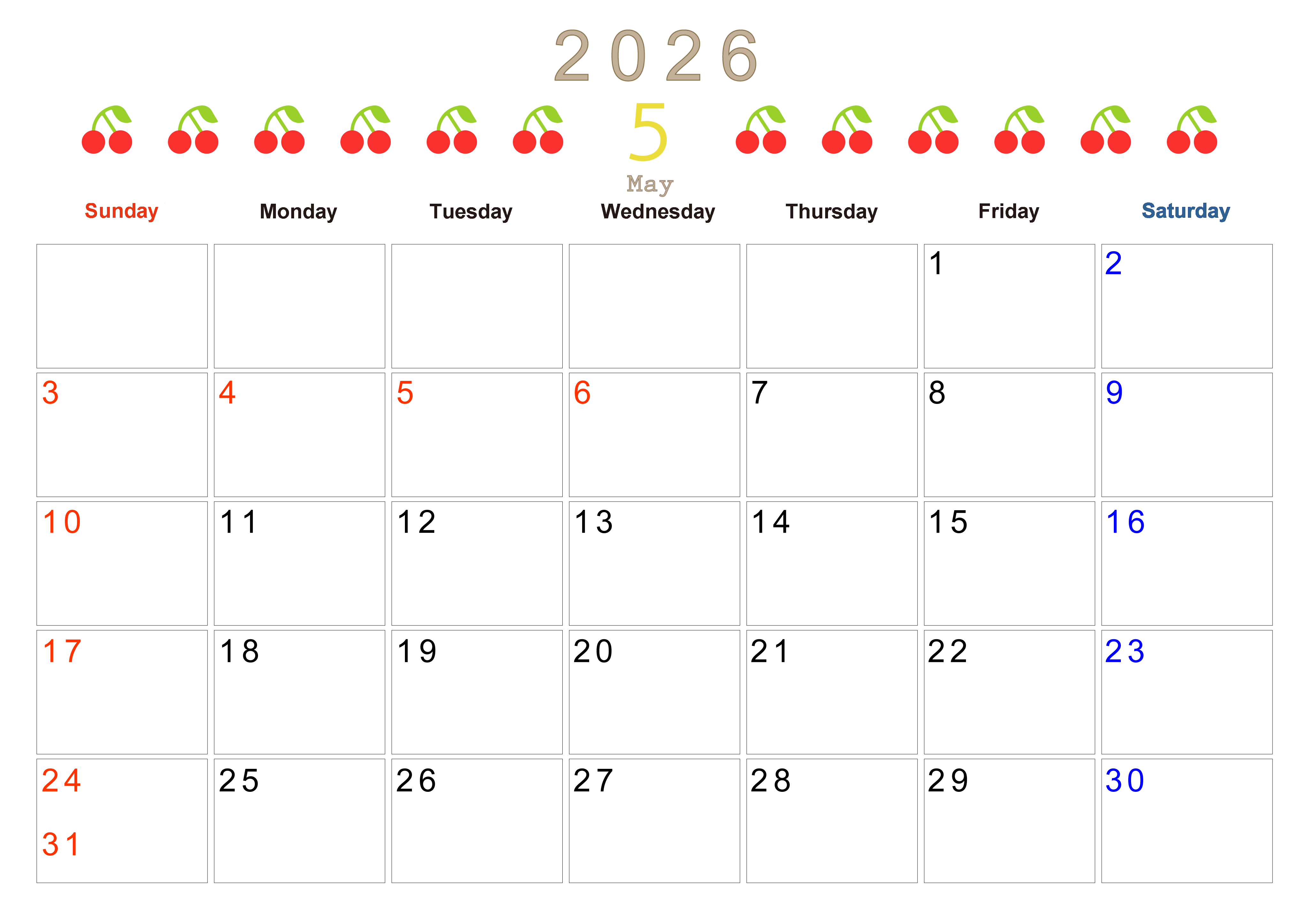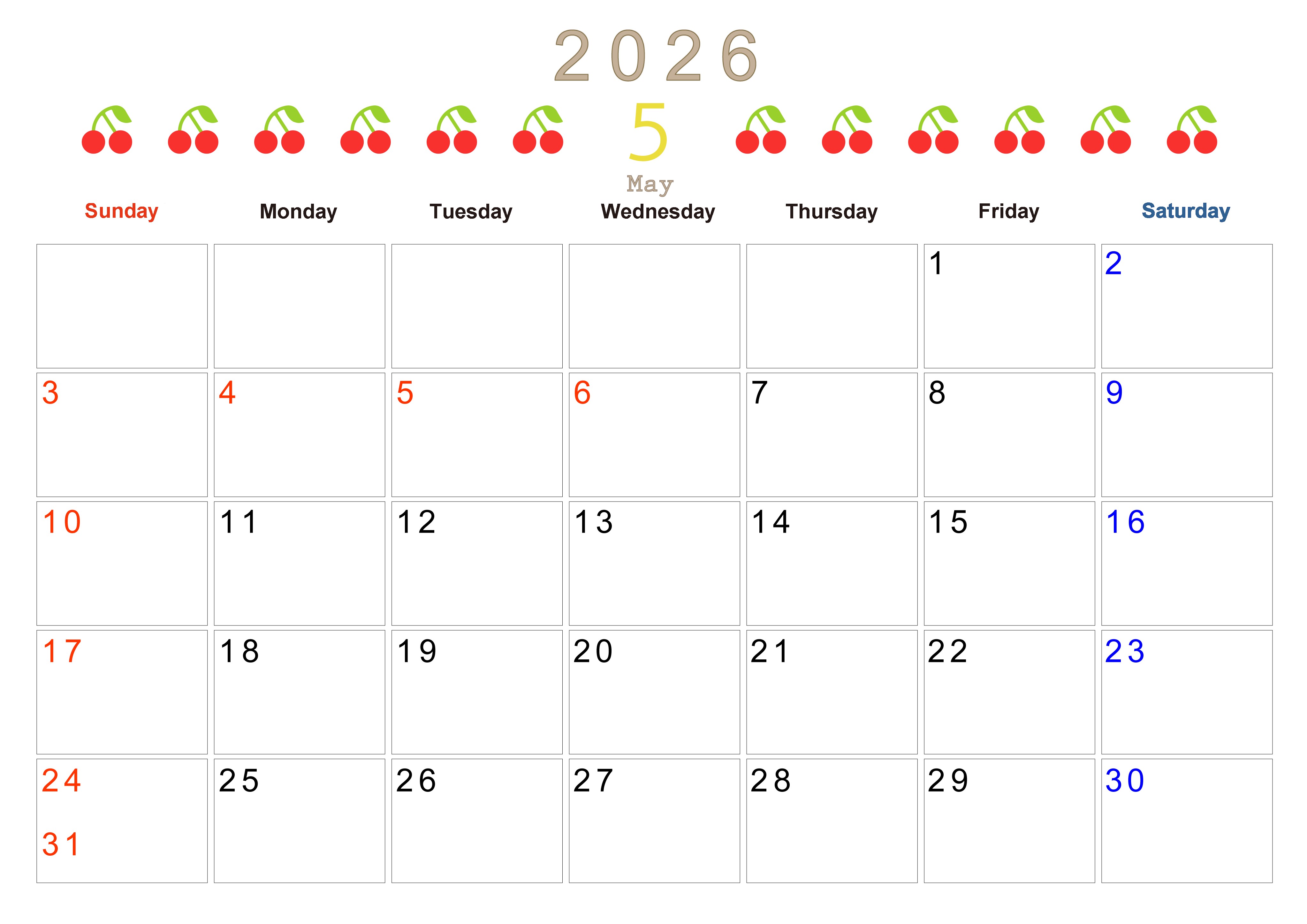 2026年・無料のカレンダーテンプレート 2026年5月カレンダーは横型日曜始まりで旬のフルーツのイラストがおしゃれ:無料(2026-01350500) 素材状デザイン王 2025年4月11日 2026年5月カレンダーは横型日曜始まりで旬のフルーツのイラストがおしゃれです。ダウンロードは無料で行えるので気軽に季節感を楽しめます。(2026-01350500) おしゃれ 5月 果物 横型のカレンダー 日曜始まり カレンダーデザイン-0135