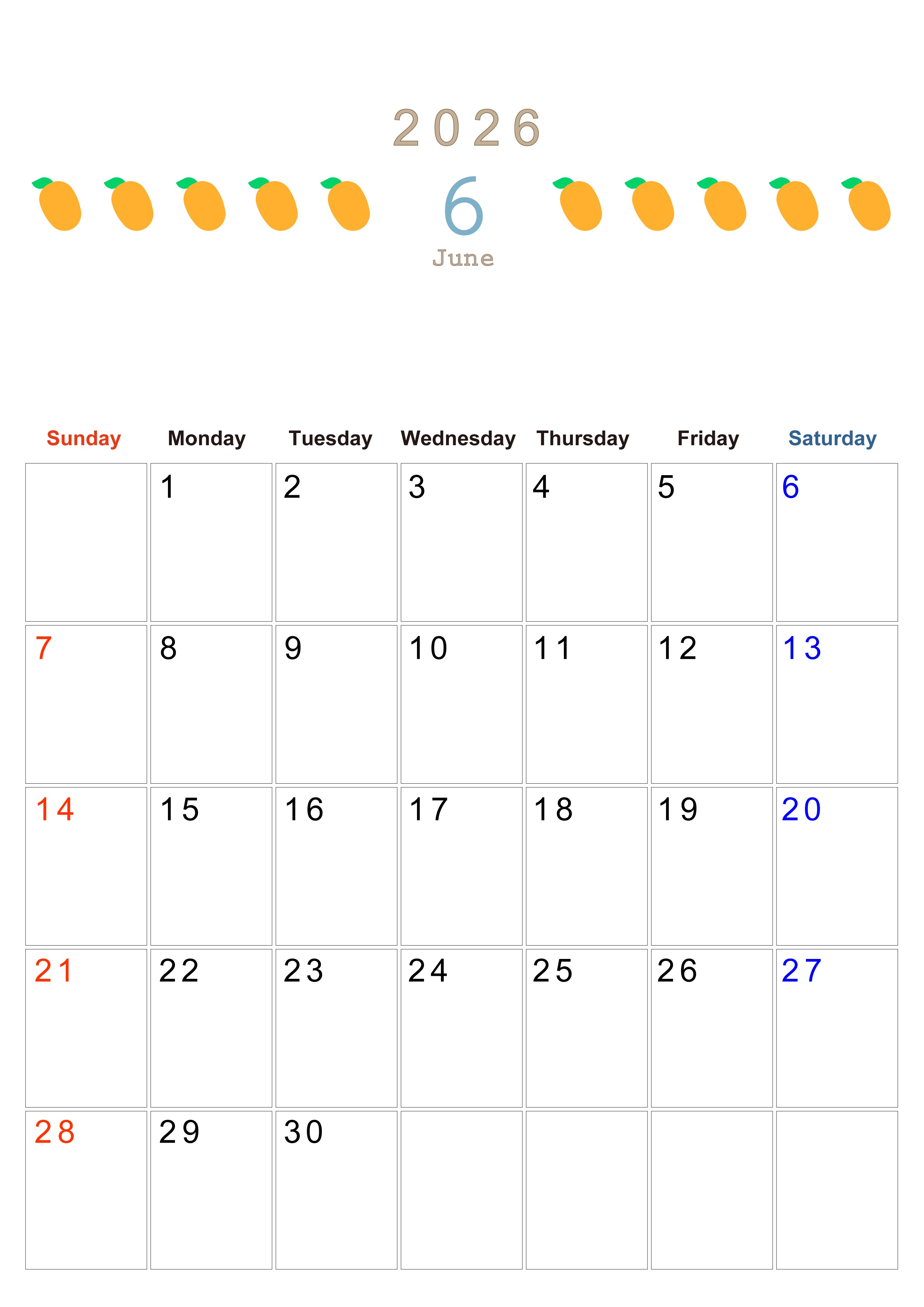 2026年6月カレンダーは縦型日曜始まりで旬のフルーツのイラストがおしゃれ:無料(2026-01350610)