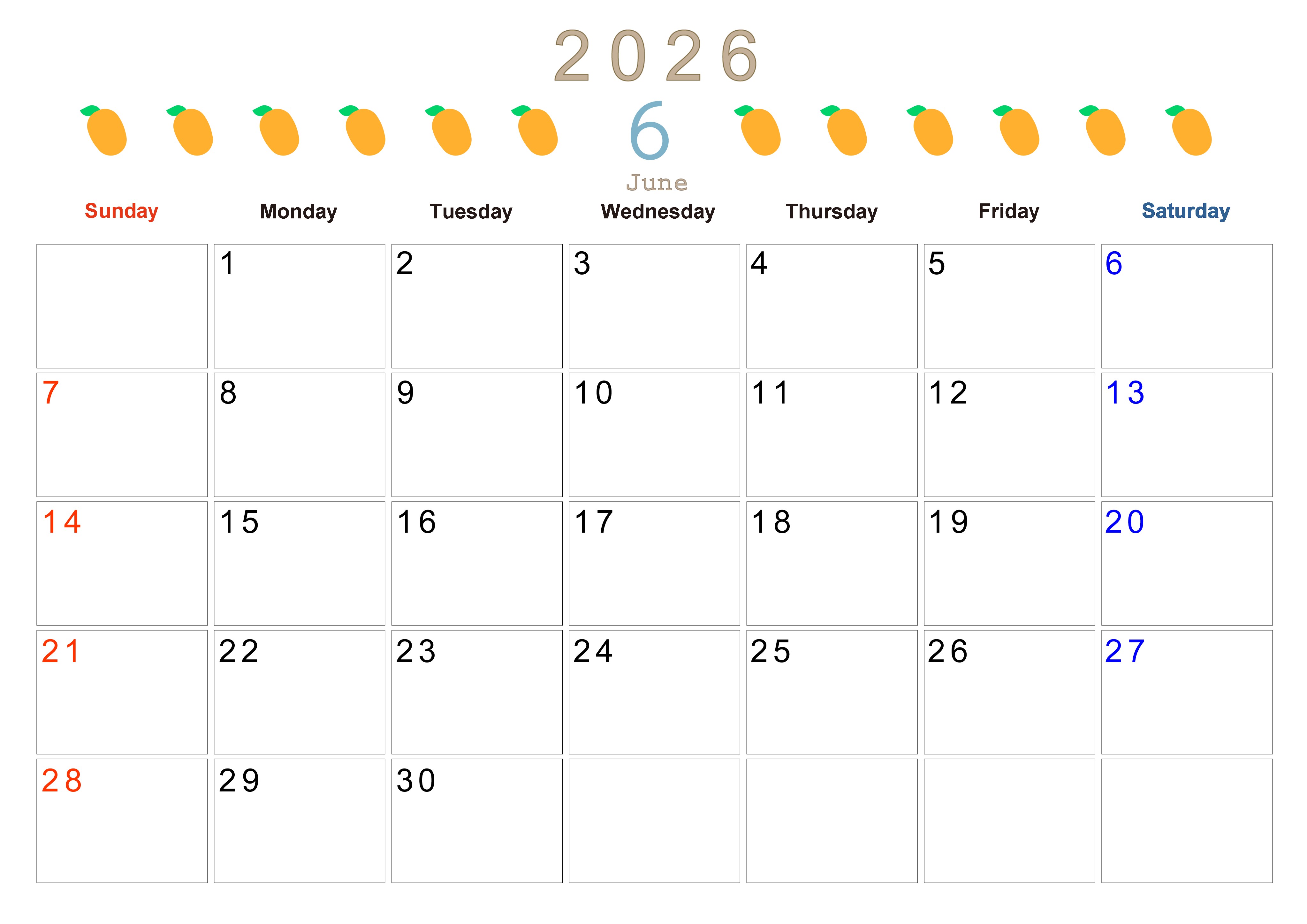 2026年・無料のカレンダーテンプレート 2026年6月カレンダーは横型日曜始まりで旬のフルーツのイラストがおしゃれ:無料(2026-01350600) 素材状デザイン王 2025年4月11日 2026年6月カレンダーは横型日曜始まりで旬のフルーツのイラストがおしゃれです。ダウンロードは無料で行えるので気軽に季節感を楽しめます。(2026-01350600) おしゃれ 6月 果物 横型のカレンダー 日曜始まり カレンダーデザイン-0135
