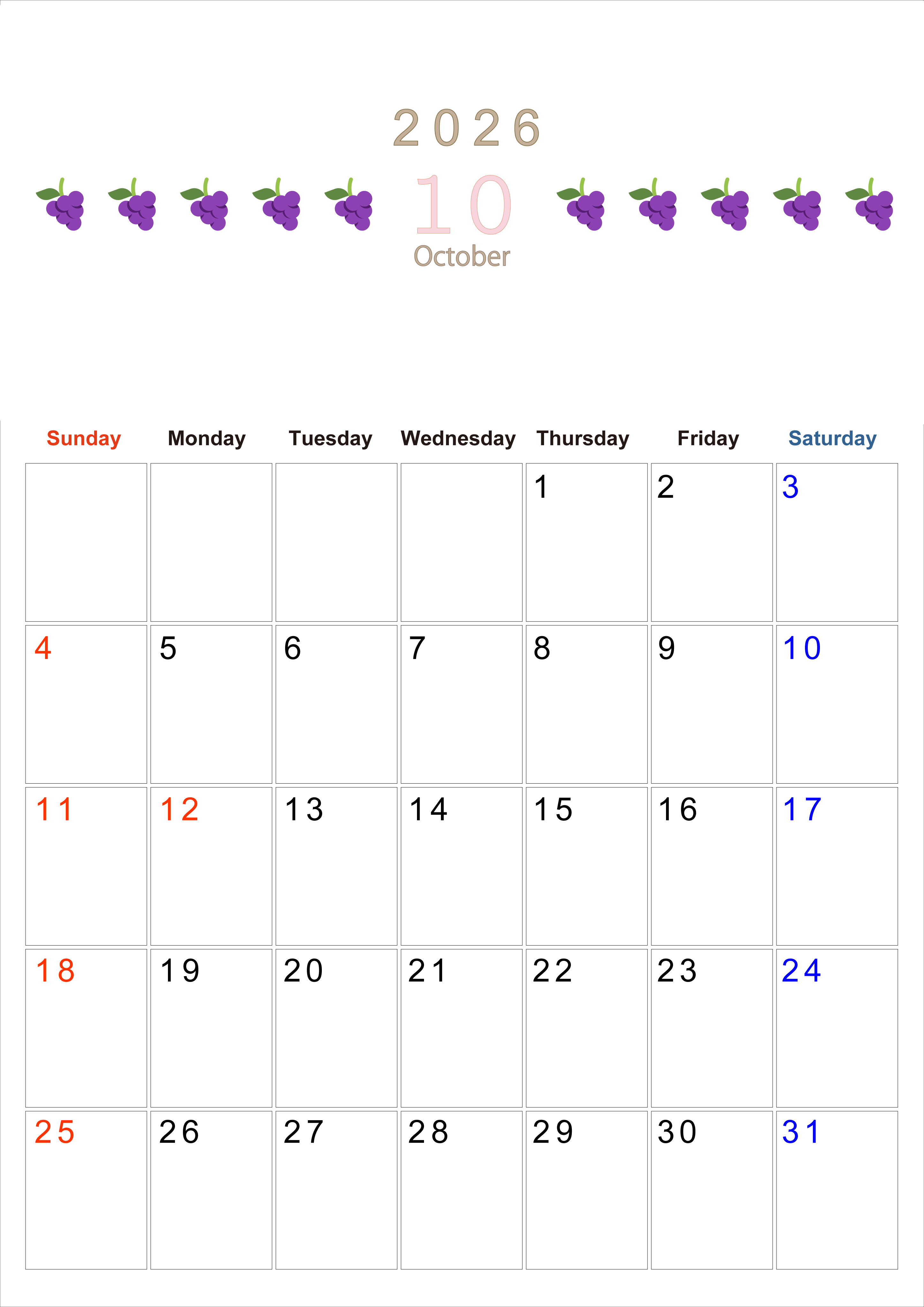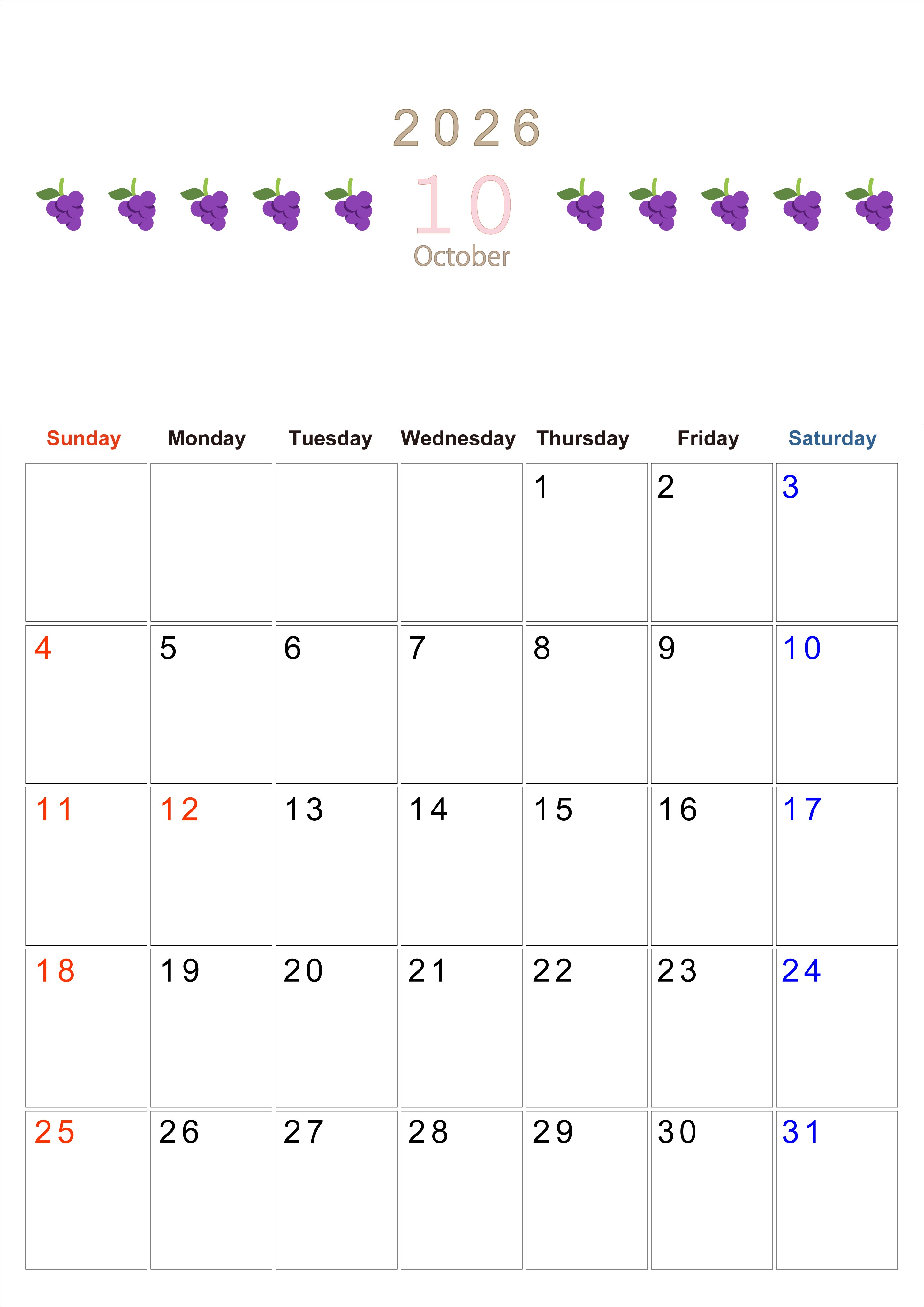 2026年・無料のカレンダーテンプレート 2026年10月カレンダーは縦型日曜始まりで旬のフルーツのイラストがおしゃれ:無料(2026-01351010) 素材状デザイン王 2025年4月11日 2026年10月カレンダーは縦型日曜始まりで旬のフルーツのイラストがおしゃれです。ダウンロードは無料で行えるので気軽に季節感を楽しめます。(2026-01351010) おしゃれ 10月 果物 縦型のカレンダー 日曜始まり カレンダーデザイン-0135
