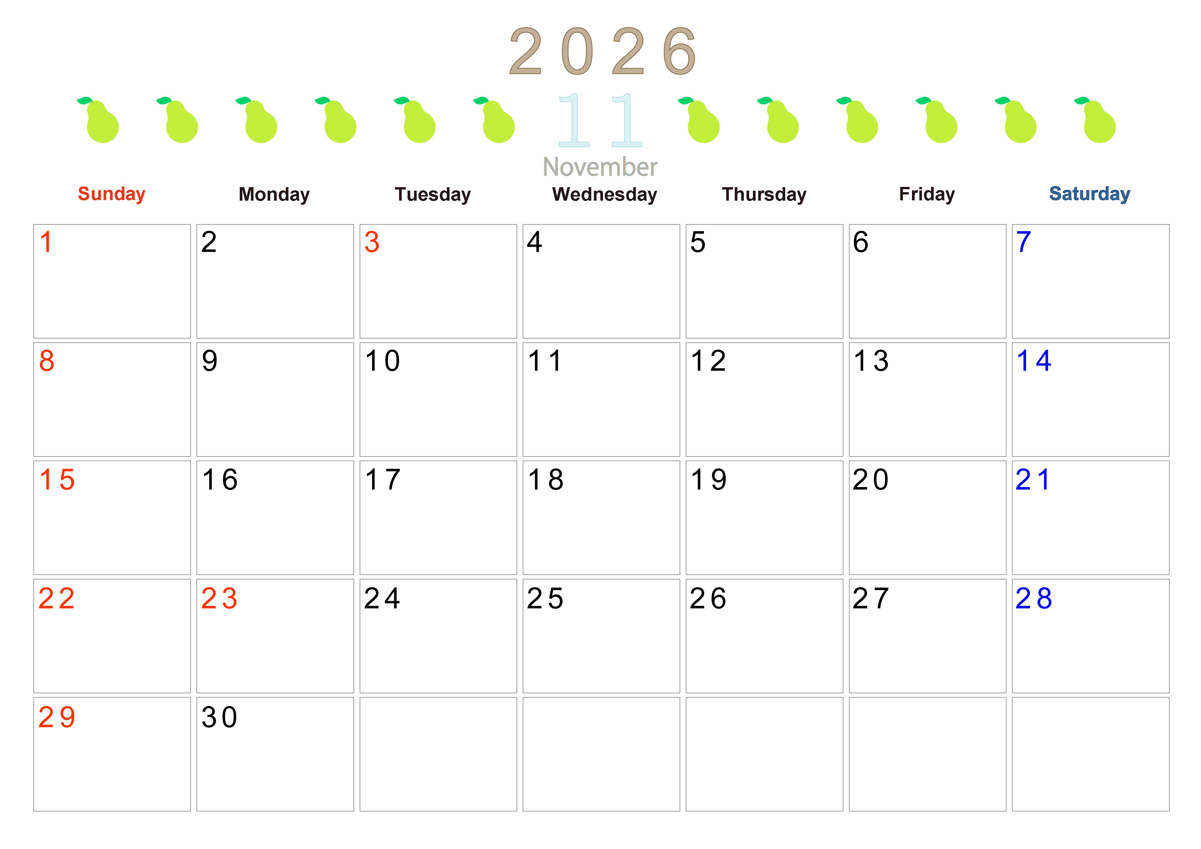2026年・無料のカレンダーテンプレート 2026年11月カレンダーは横型日曜始まりで旬のフルーツのイラストがおしゃれ:無料(2026-01351100) 素材状デザイン王 2025年4月11日 2026年11月カレンダーは横型日曜始まりで旬のフルーツのイラストがおしゃれです。ダウンロードは無料で行えるので気軽に季節感を楽しめます。(2026-01351100) おしゃれ 11月 果物 横型のカレンダー 日曜始まり カレンダーデザイン-0135