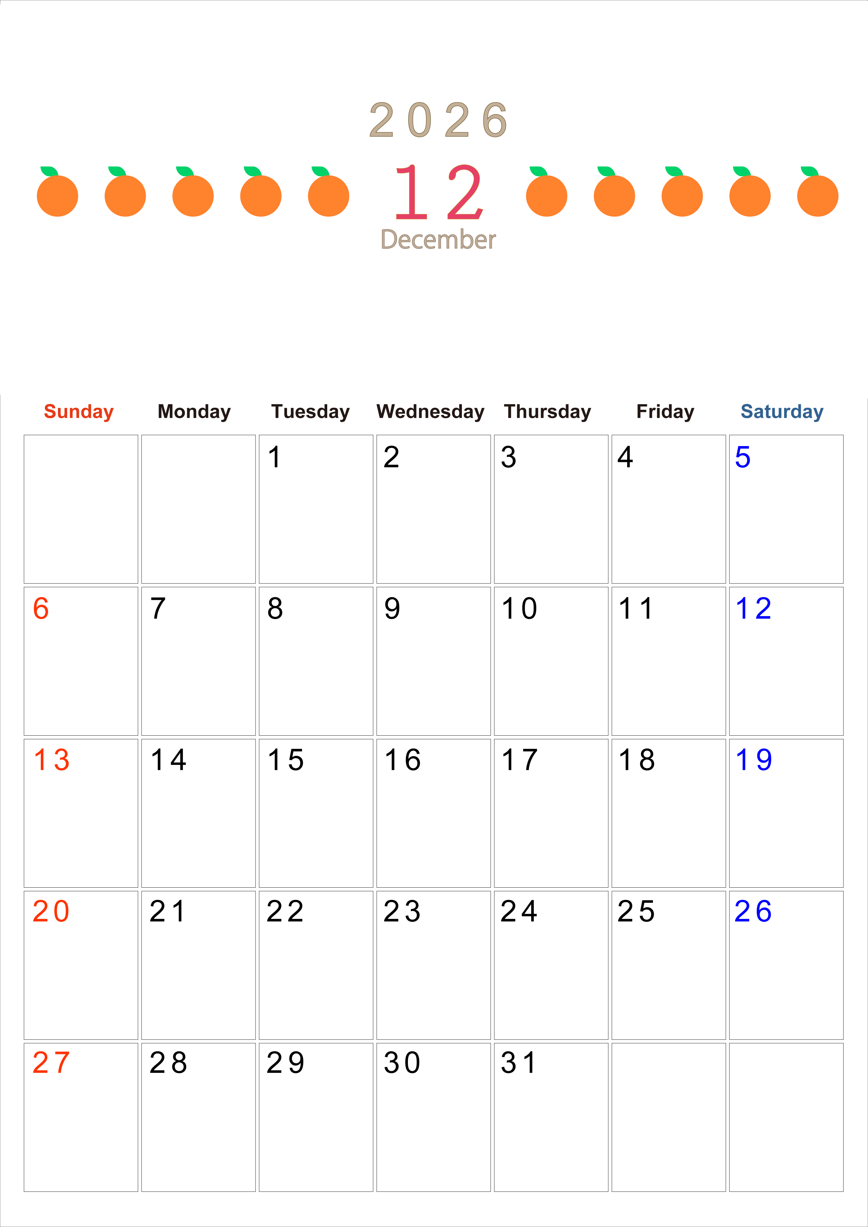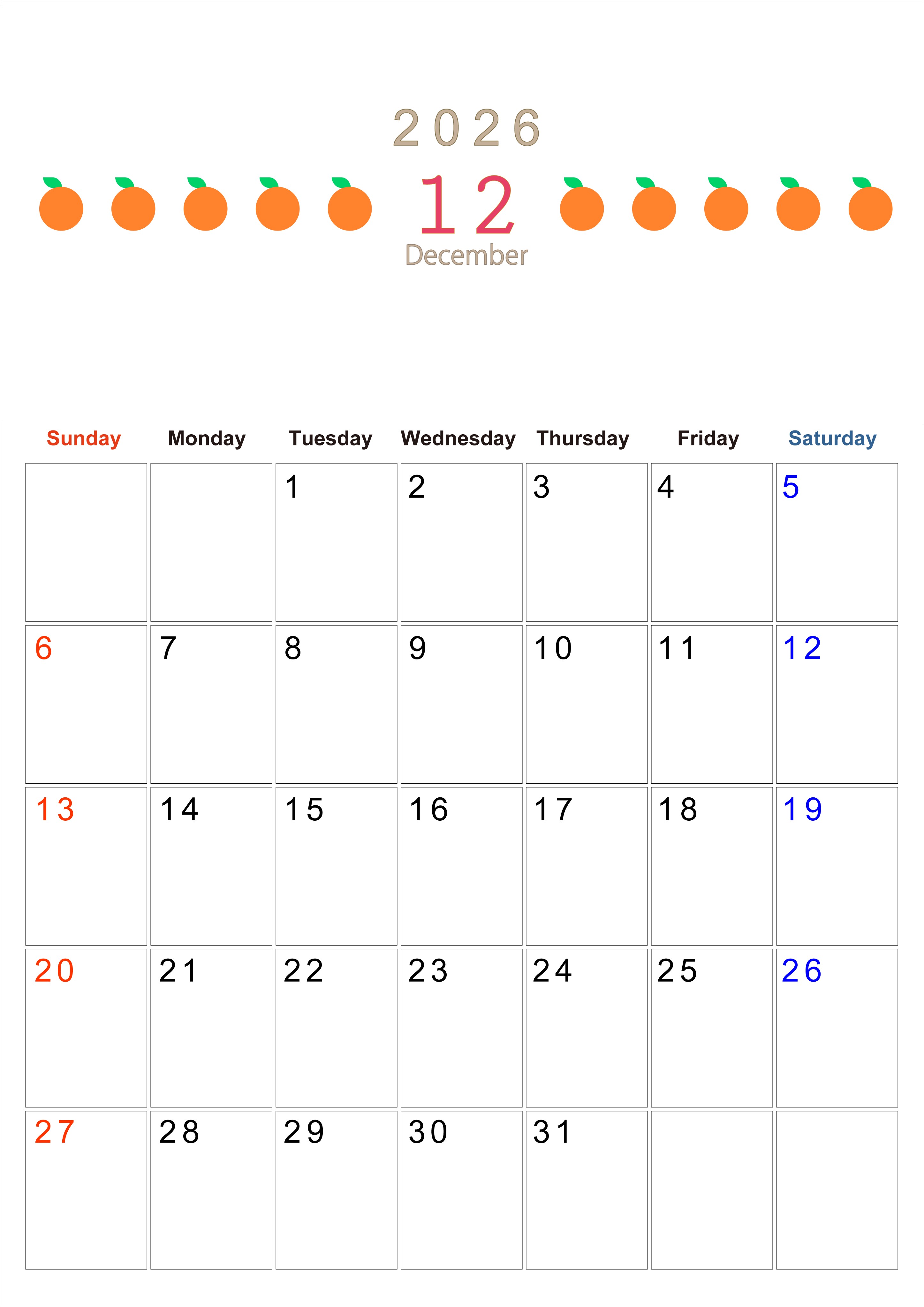 2026年12月カレンダーは縦型日曜始まりで旬のフルーツのイラストがおしゃれ:無料(2026-01351210)