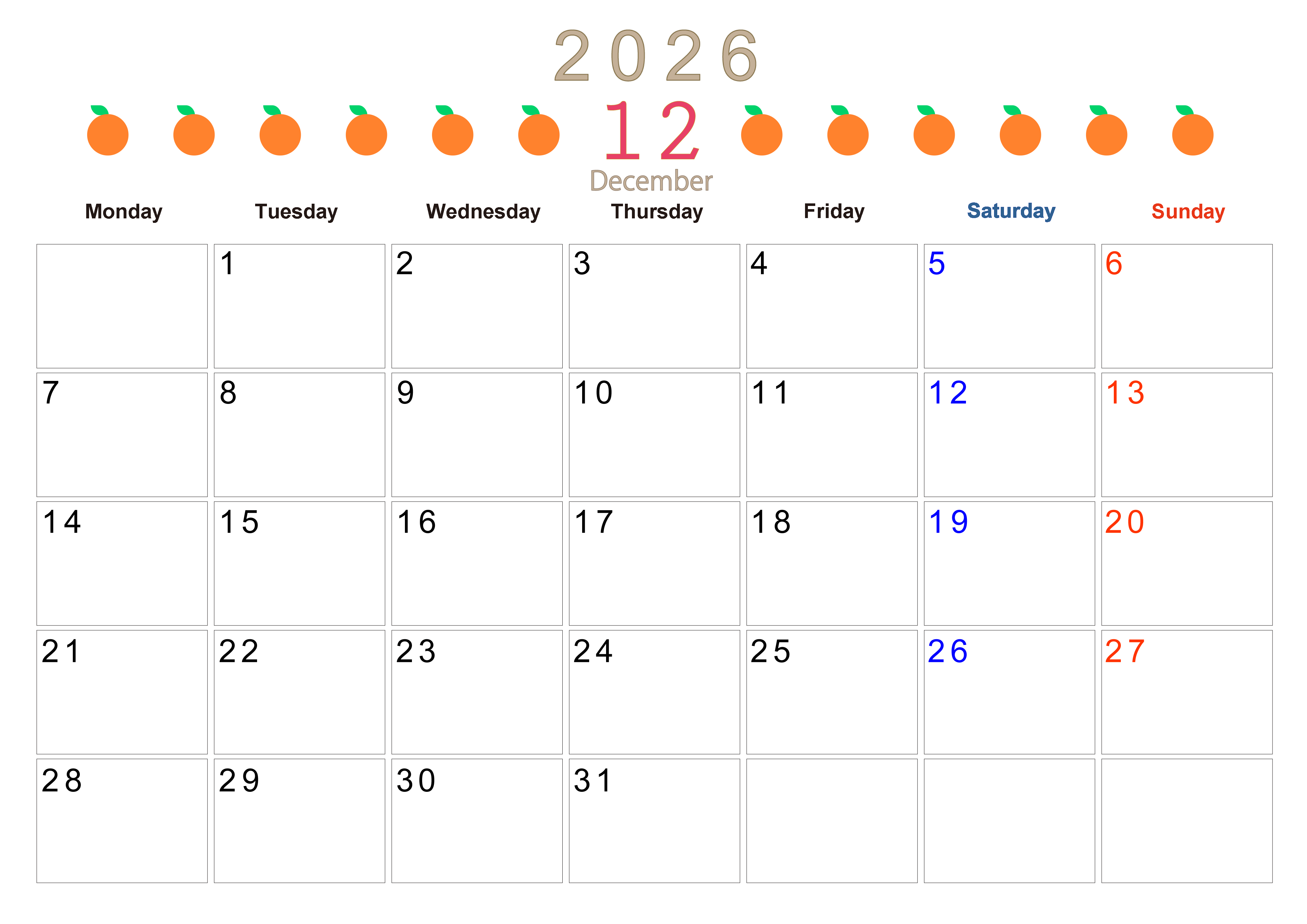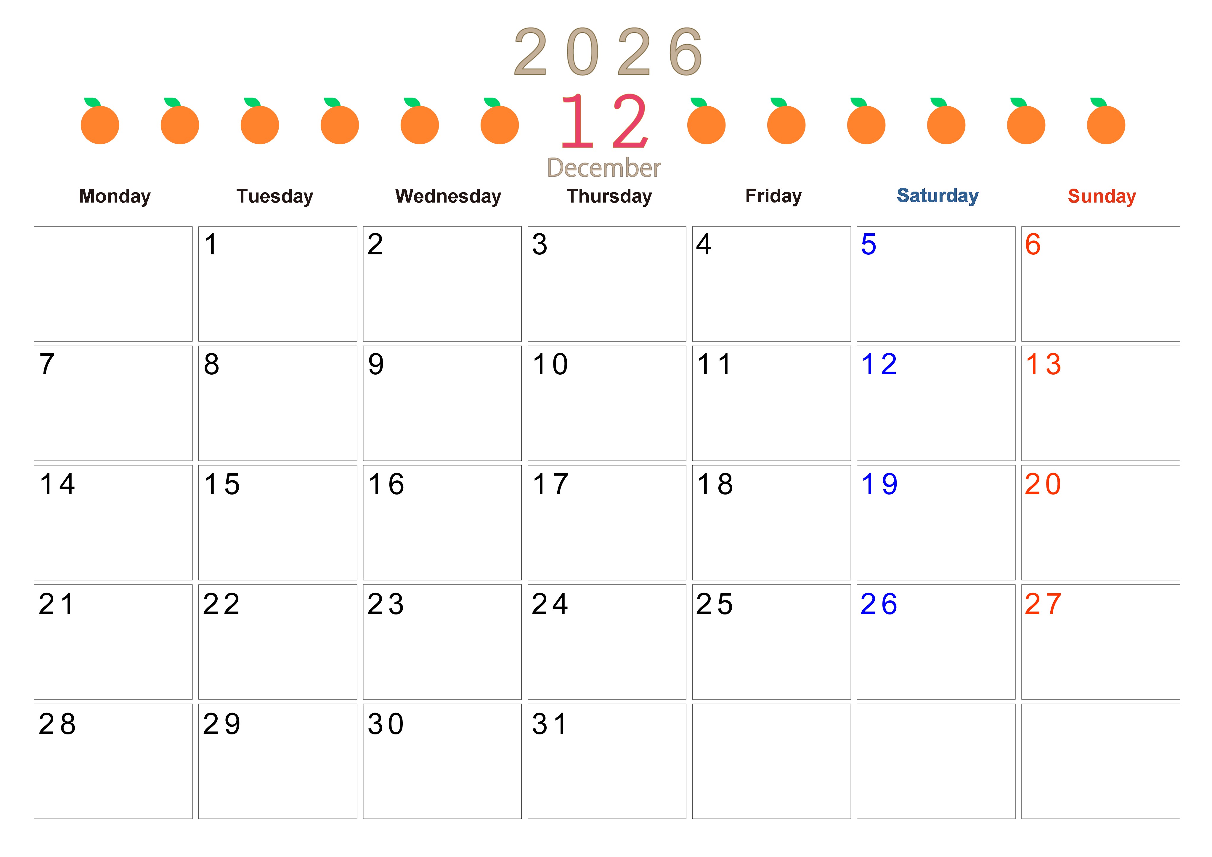 2026年12月カレンダーは横型月曜始まりで旬のフルーツのイラストがおしゃれ:無料(2026-01351201)