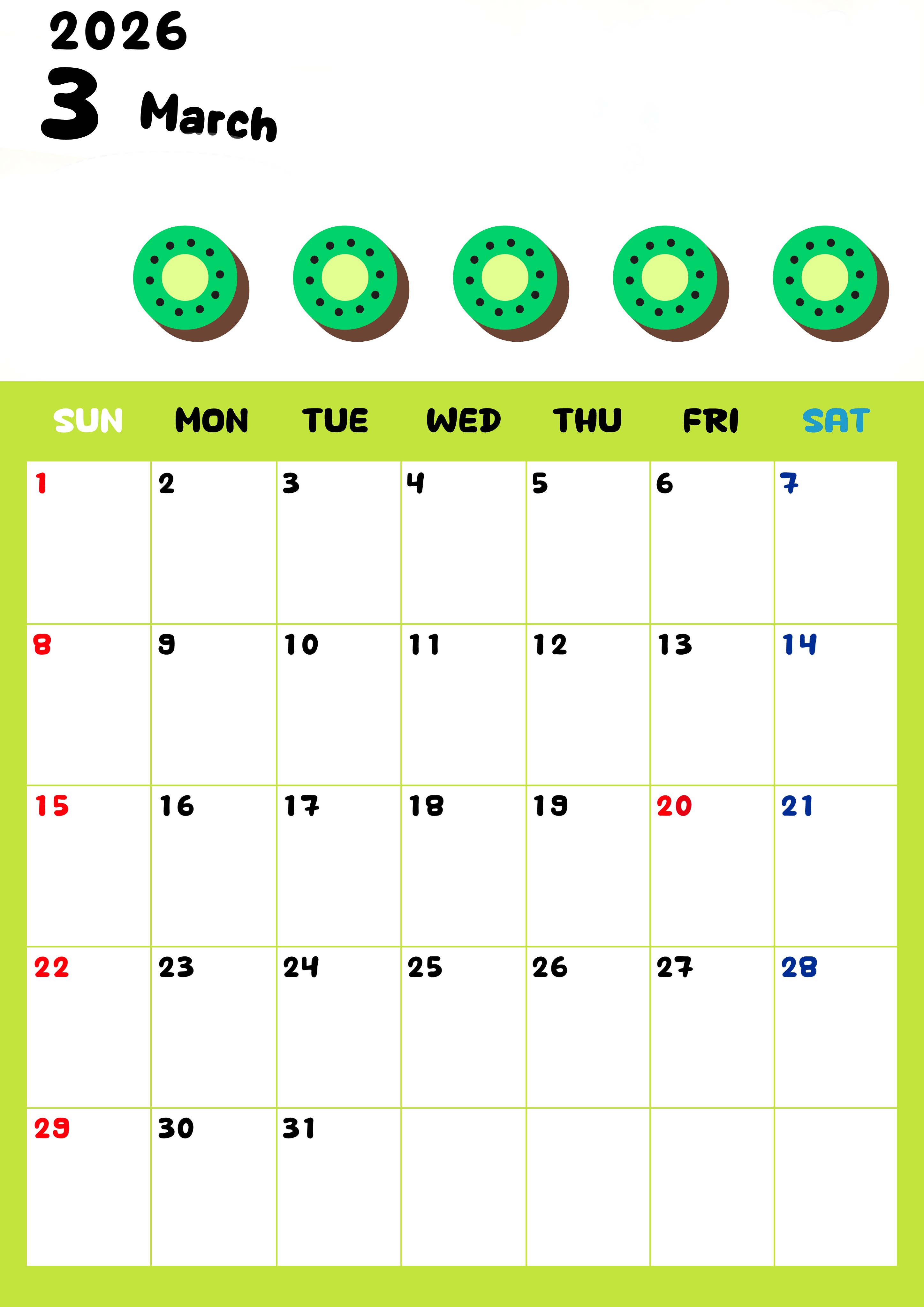 2026年・無料のカレンダーテンプレート 2026年3月カレンダーは縦型日曜始まりで季節感あふれる果物のカラフルなイラストがかわいい:無料(2026-01360310) 素材状デザイン王 2025年4月11日 2026年3月カレンダーは縦型日曜始まりで季節感あふれる果物のカラフルなイラストがかわいいです。無料ダウンロードをして季節のおいしそうな果物をお楽しみください。(2026-01360310) かわいい 3月 果物 縦型のカレンダー 日曜始まり カレンダーデザイン-0136