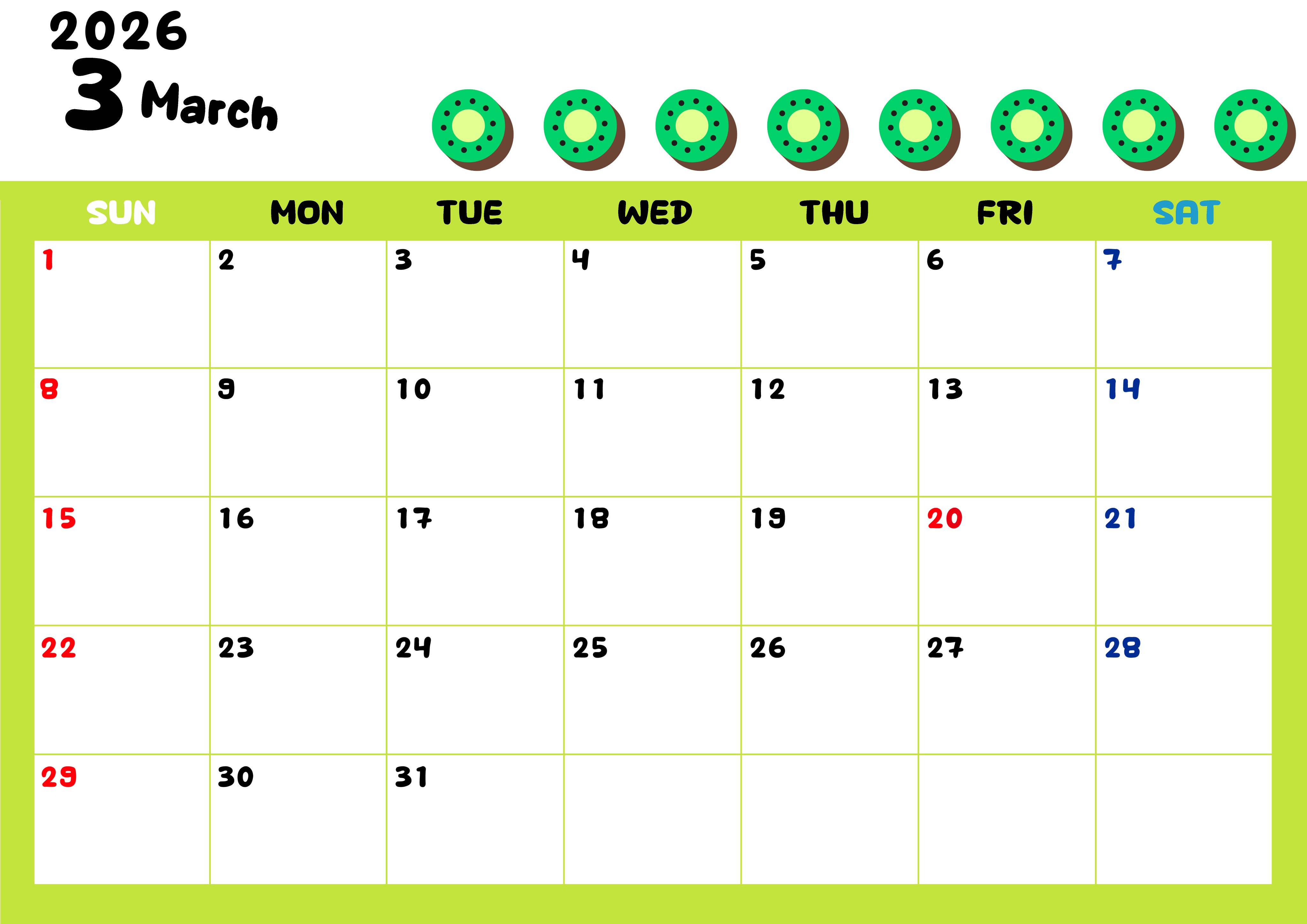 2026年・無料のカレンダーテンプレート 2026年3月カレンダーは横型日曜始まりで季節感あふれる果物のカラフルなイラストがかわいい:無料(2026-01360300) 素材状デザイン王 2025年4月11日 2026年3月カレンダーは横型日曜始まりで季節感あふれる果物のカラフルなイラストがかわいいです。無料ダウンロードをして季節のおいしそうな果物をお楽しみください。(2026-01360300) かわいい 3月 果物 横型のカレンダー 日曜始まり カレンダーデザイン-0136