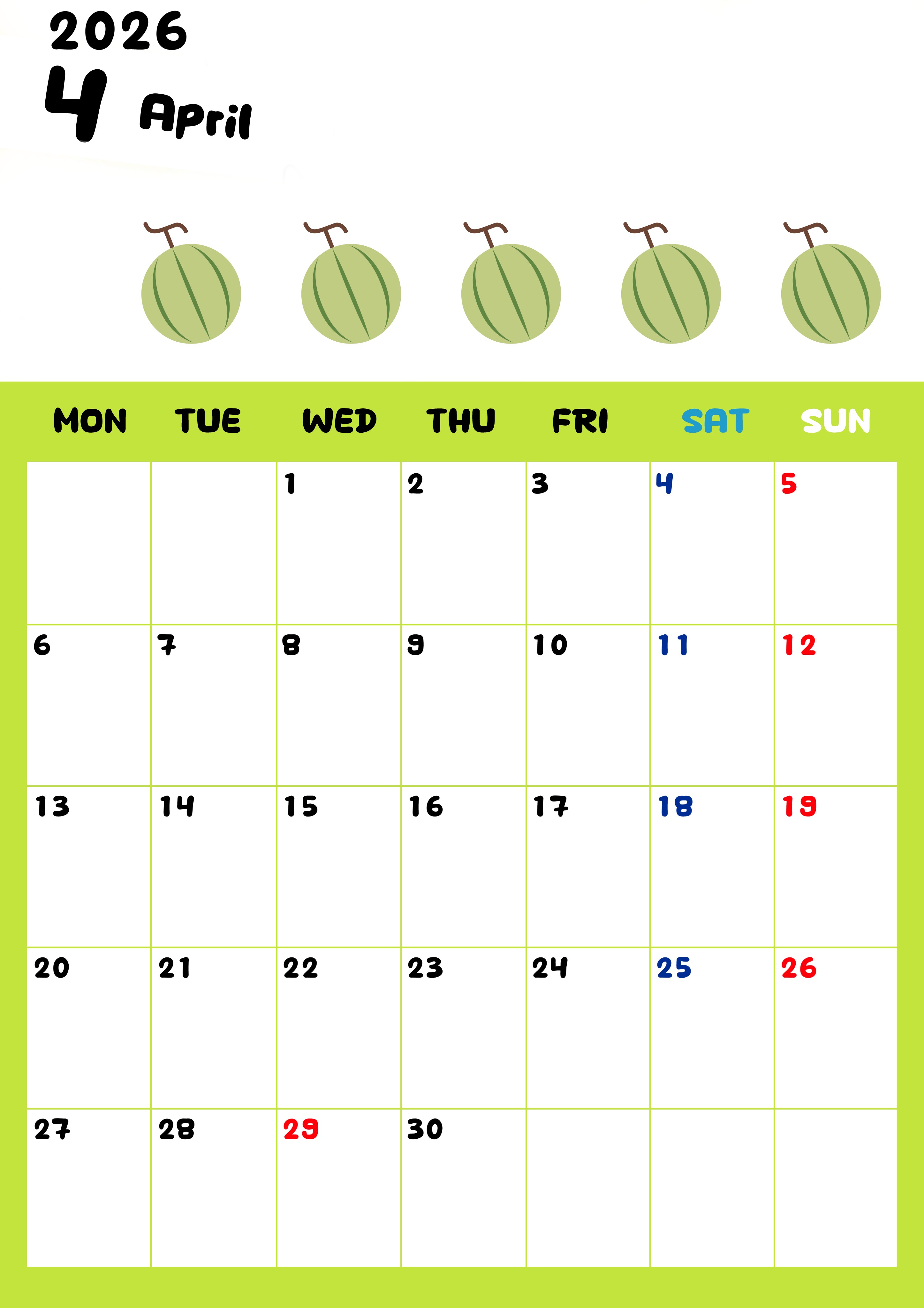 2026年・無料のカレンダーテンプレート 2026年4月カレンダーは縦型月曜始まりで季節感あふれる果物のカラフルなイラストがかわいい:無料(2026-01360411) 素材状デザイン王 2025年4月11日 2026年4月カレンダーは縦型月曜始まりで季節感あふれる果物のカラフルなイラストがかわいいです。無料ダウンロードをして季節のおいしそうな果物をお楽しみください。(2026-01360411) かわいい 4月 果物 縦型のカレンダー 月曜始まり カレンダーデザイン-0136