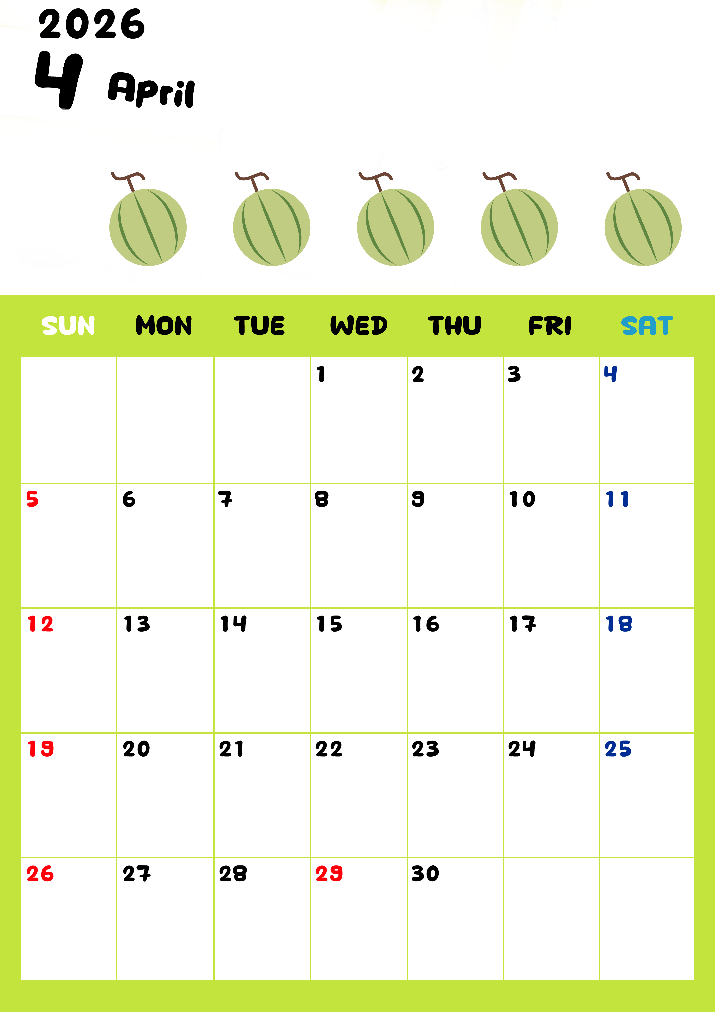 2026年・無料のカレンダーテンプレート 2026年4月カレンダーは縦型日曜始まりで季節感あふれる果物のカラフルなイラストがかわいい:無料(2026-01360410) 素材状デザイン王 2025年4月11日 2026年4月カレンダーは縦型日曜始まりで季節感あふれる果物のカラフルなイラストがかわいいです。無料ダウンロードをして季節のおいしそうな果物をお楽しみください。(2026-01360410) かわいい 4月 果物 縦型のカレンダー 日曜始まり カレンダーデザイン-0136