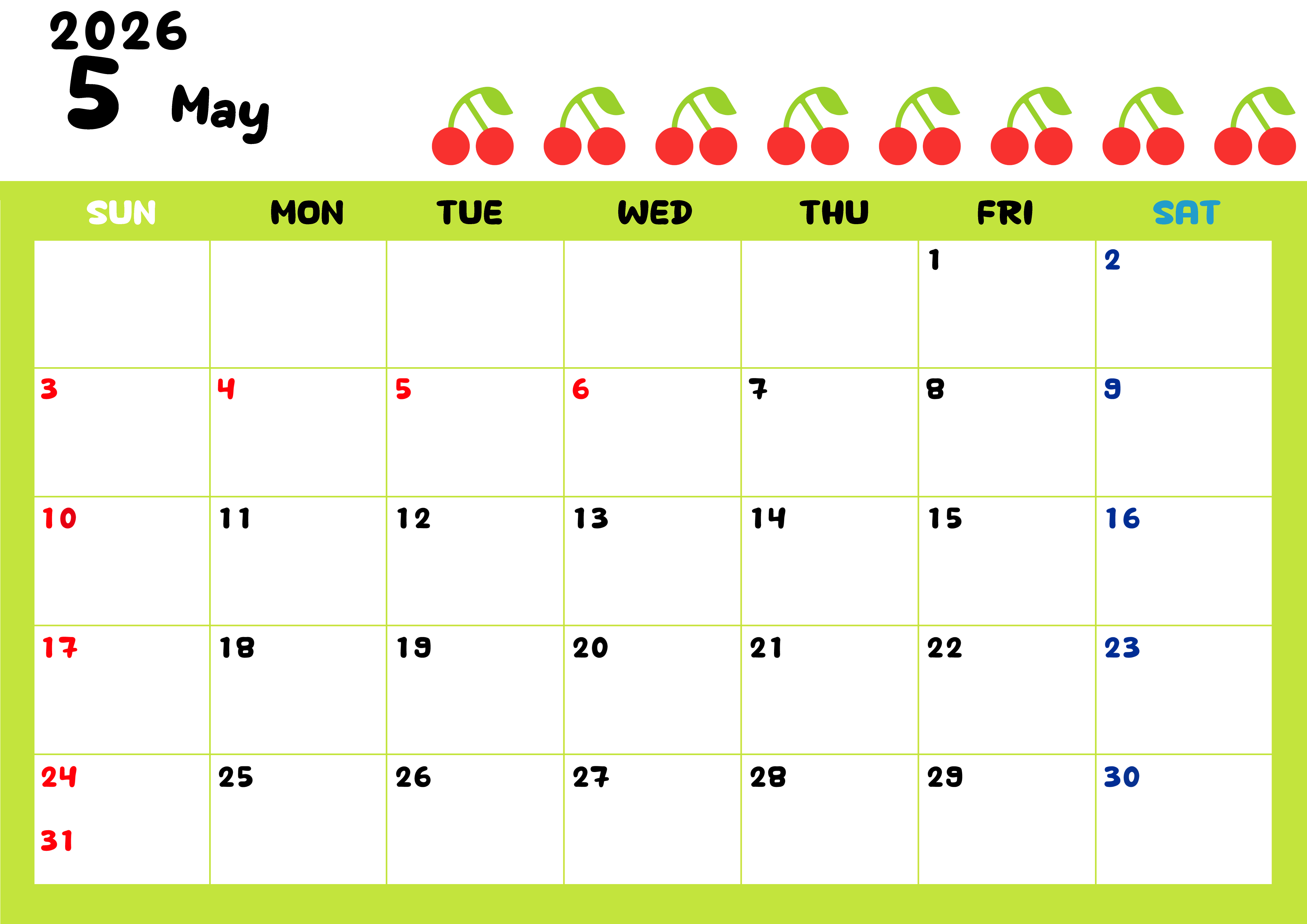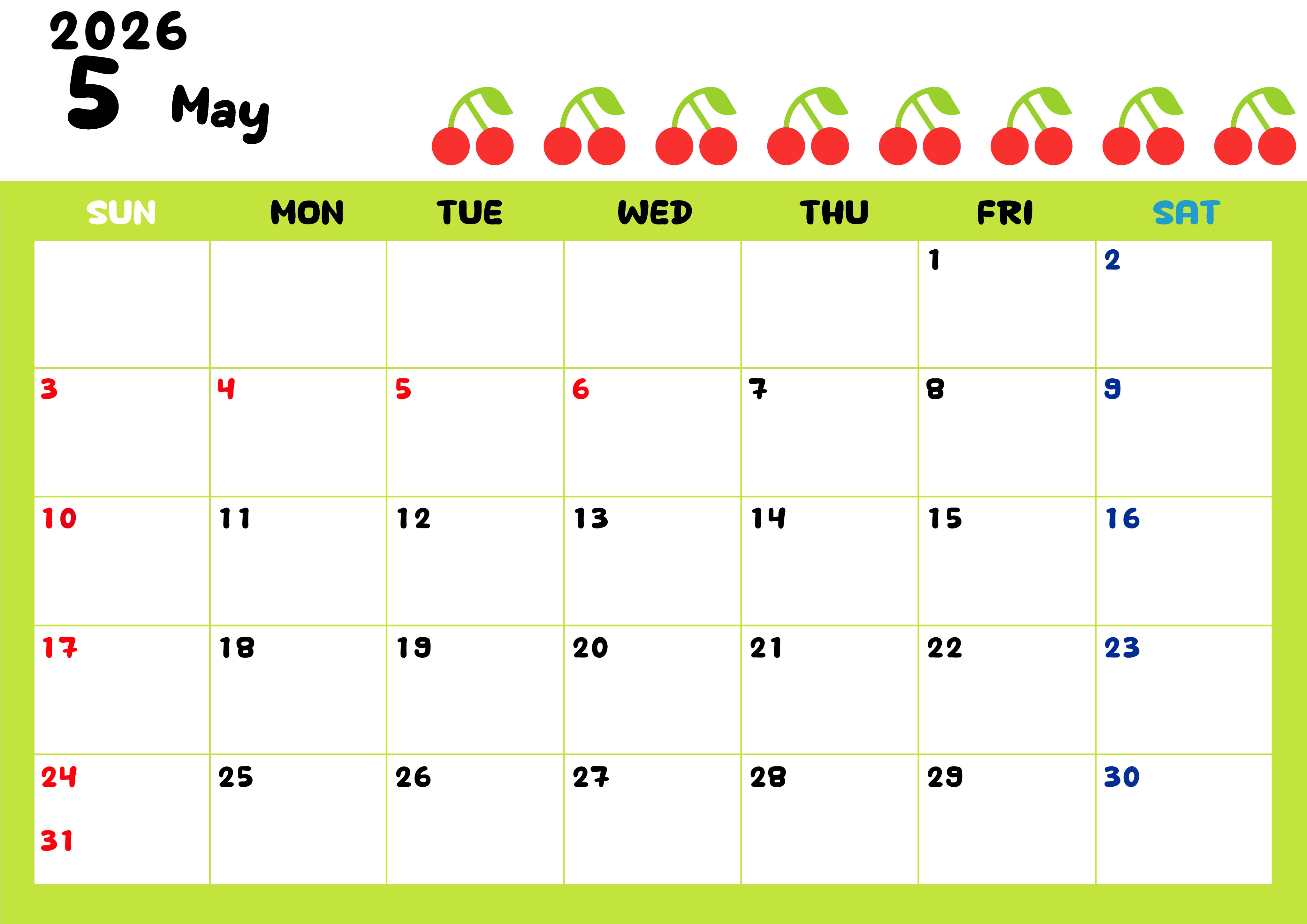 2026年5月カレンダーは横型日曜始まりで季節感あふれる果物のカラフルなイラストがかわいいです。無料ダウンロードをして季節のおいしそうな果物をお楽しみください。(2026-01360500)