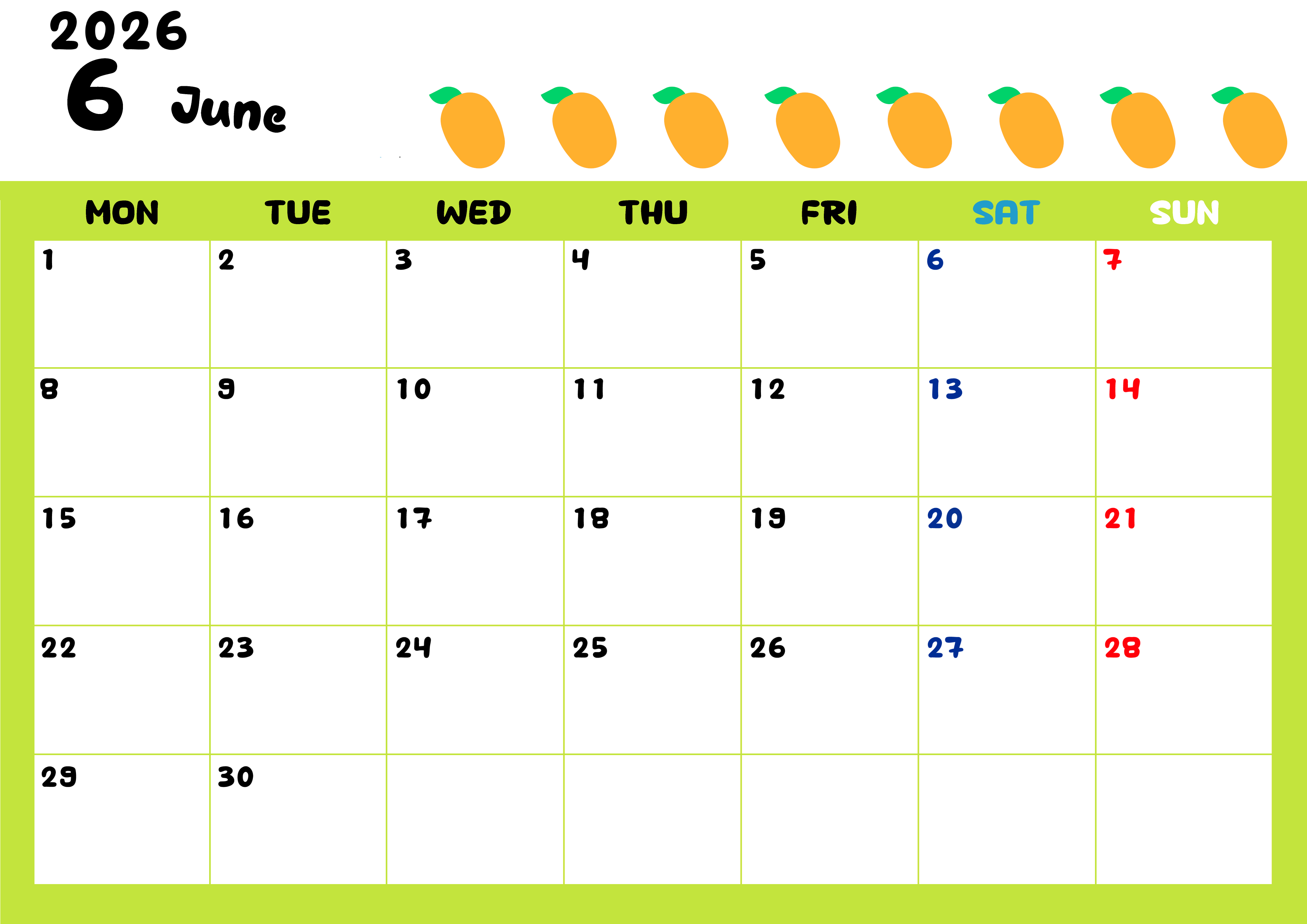 2026年・無料のカレンダーテンプレート 2026年6月カレンダーは横型月曜始まりで季節感あふれる果物のカラフルなイラストがかわいい:無料(2026-01360601) 素材状デザイン王 2025年4月11日 2026年6月カレンダーは横型月曜始まりで季節感あふれる果物のカラフルなイラストがかわいいです。無料ダウンロードをして季節のおいしそうな果物をお楽しみください。(2026-01360601) かわいい 6月 果物 横型のカレンダー 月曜始まり カレンダーデザイン-0136