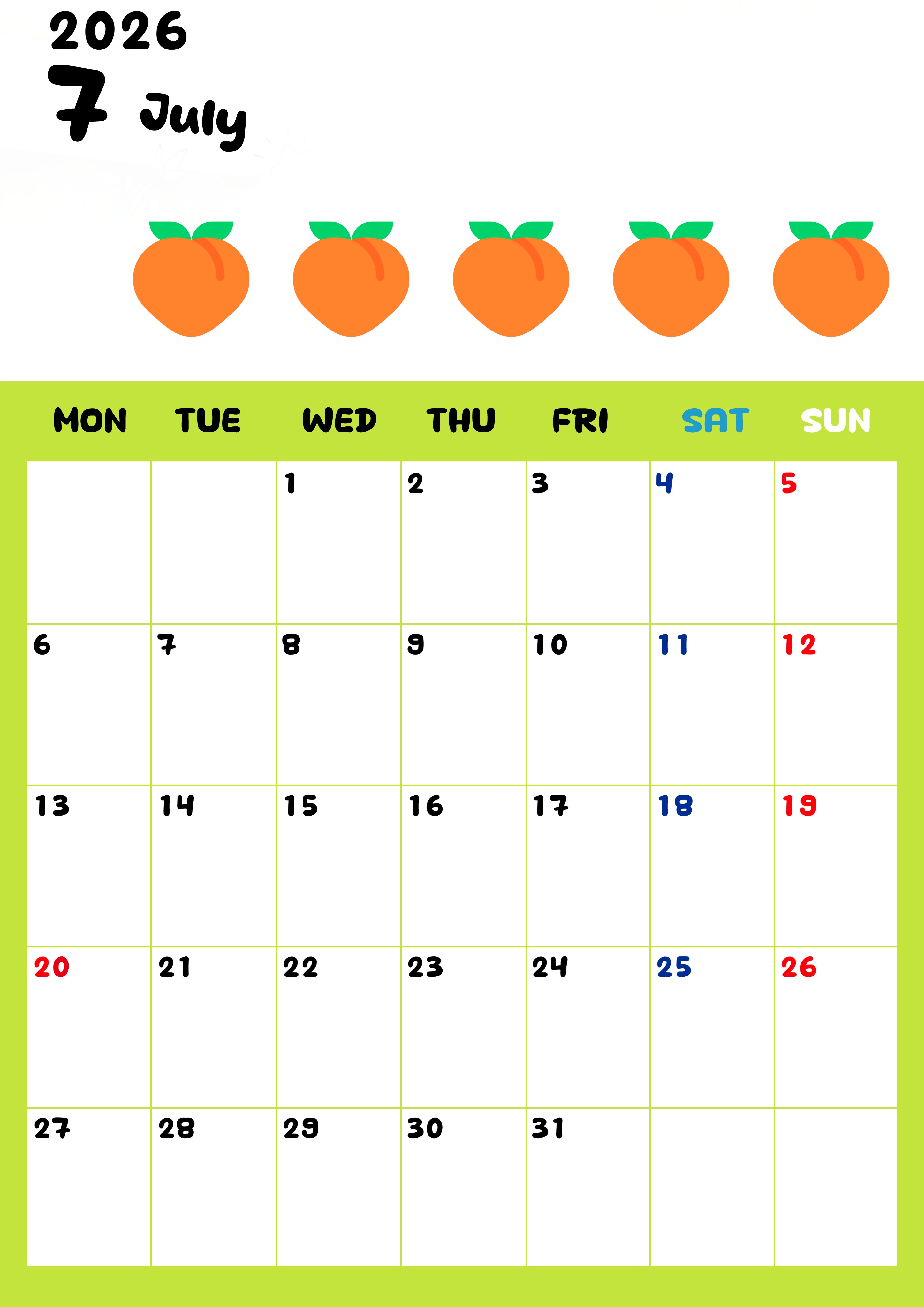 2026年7月カレンダーは縦型月曜始まりで季節感あふれる果物のカラフルなイラストがかわいいです。無料ダウンロードをして季節のおいしそうな果物をお楽しみください。(2026-01360711)