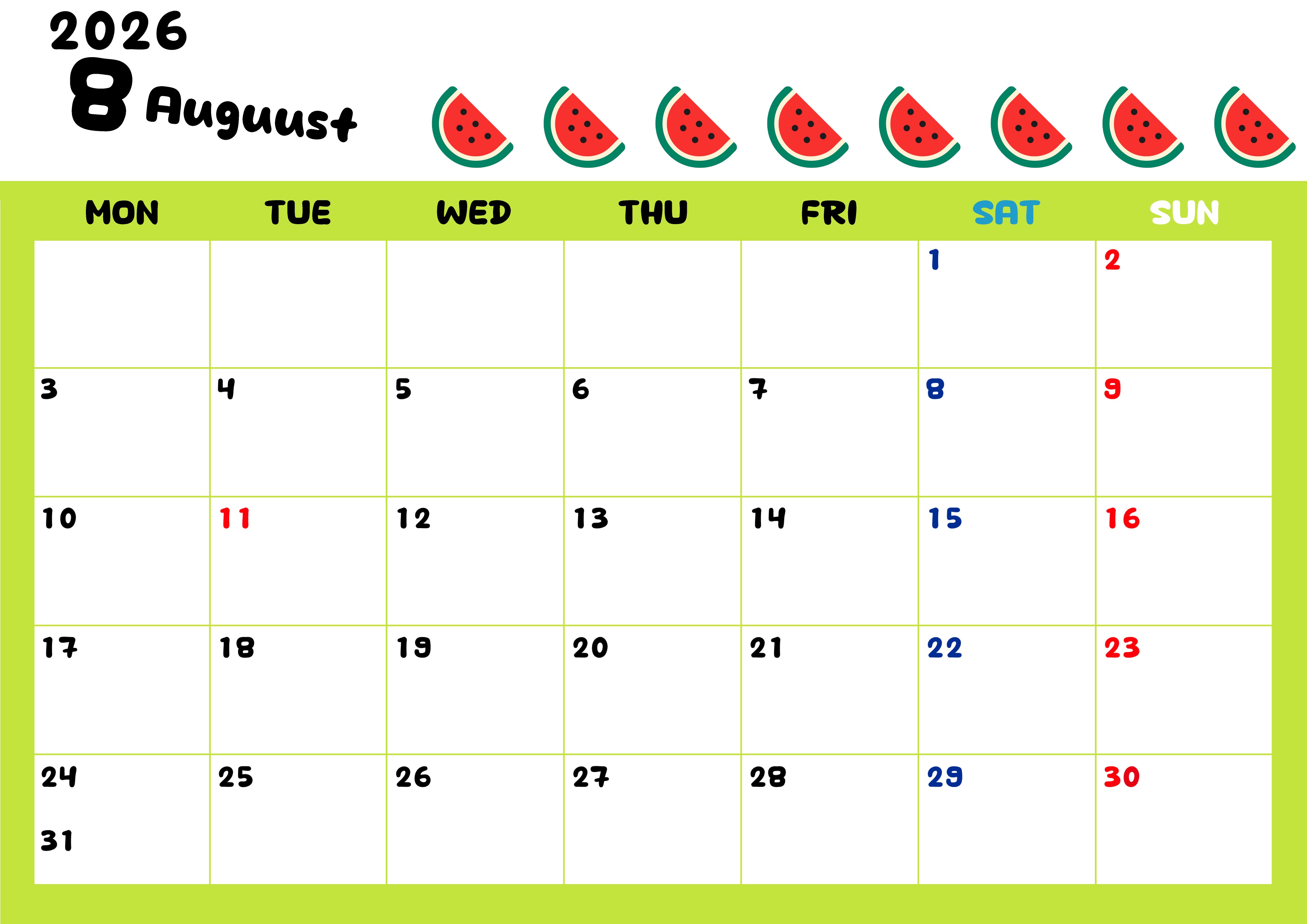 2026年8月カレンダーは横型月曜始まりで季節感あふれる果物のカラフルなイラストがかわいい:無料(2026-01360801)