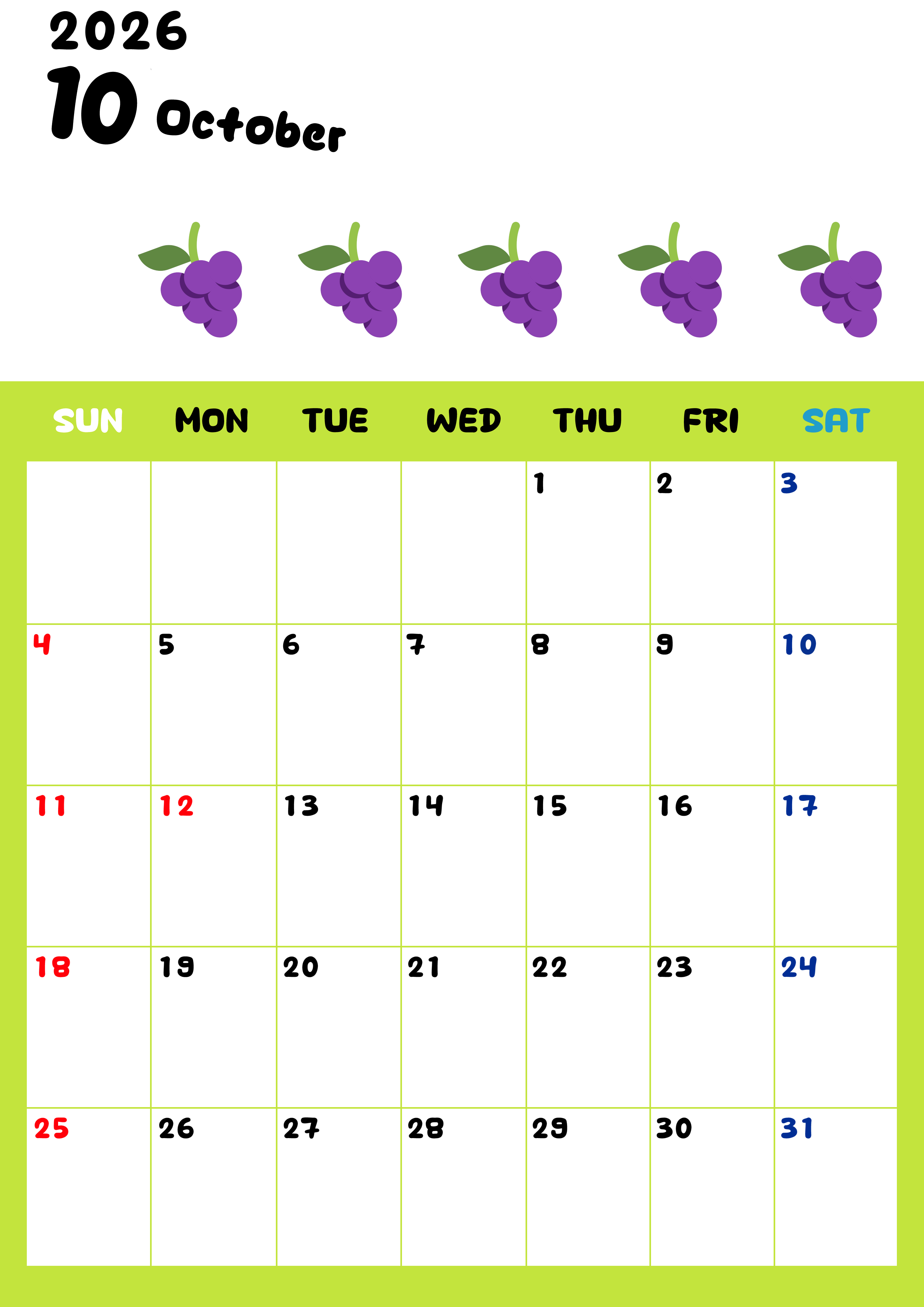 2026年・無料のカレンダーテンプレート 2026年10月カレンダーは縦型日曜始まりで季節感あふれる果物のカラフルなイラストがかわいい:無料(2026-01361010) 素材状デザイン王 2025年4月11日 2026年10月カレンダーは縦型日曜始まりで季節感あふれる果物のカラフルなイラストがかわいいです。無料ダウンロードをして季節のおいしそうな果物をお楽しみください。(2026-01361010) かわいい 10月 果物 縦型のカレンダー 日曜始まり カレンダーデザイン-0136