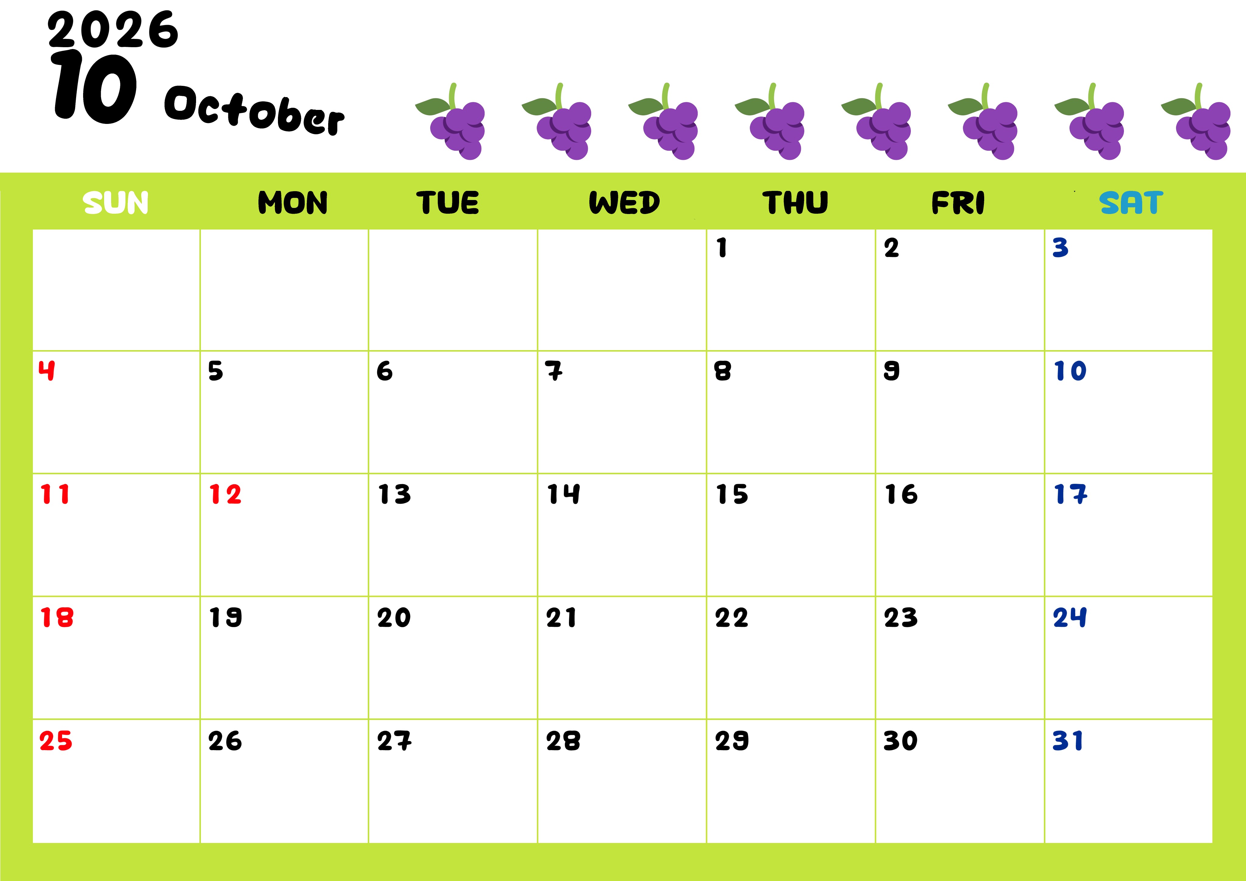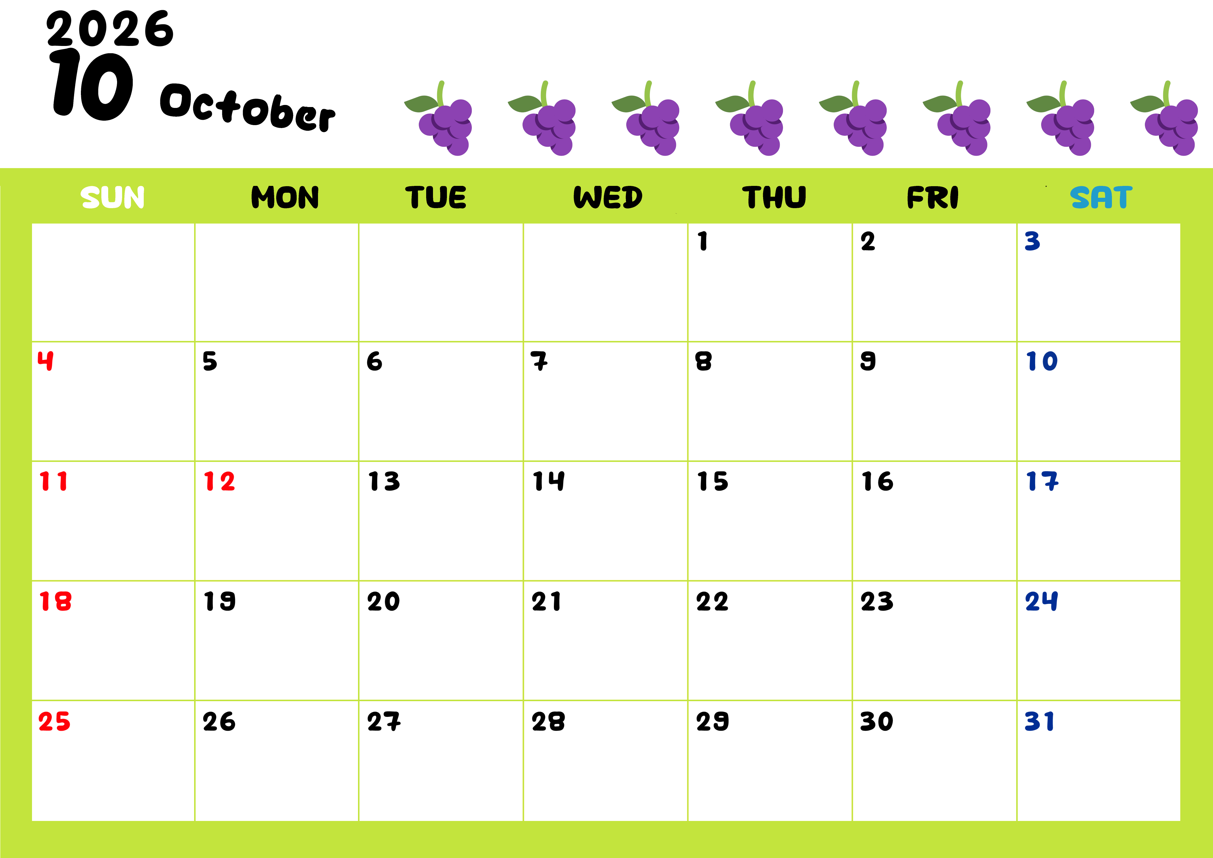 2026年・無料のカレンダーテンプレート 2026年10月カレンダーは横型日曜始まりで季節感あふれる果物のカラフルなイラストがかわいい:無料(2026-01361000) 素材状デザイン王 2025年4月11日 2026年10月カレンダーは横型日曜始まりで季節感あふれる果物のカラフルなイラストがかわいいです。無料ダウンロードをして季節のおいしそうな果物をお楽しみください。(2026-01361000) かわいい 10月 果物 横型のカレンダー 日曜始まり カレンダーデザイン-0136