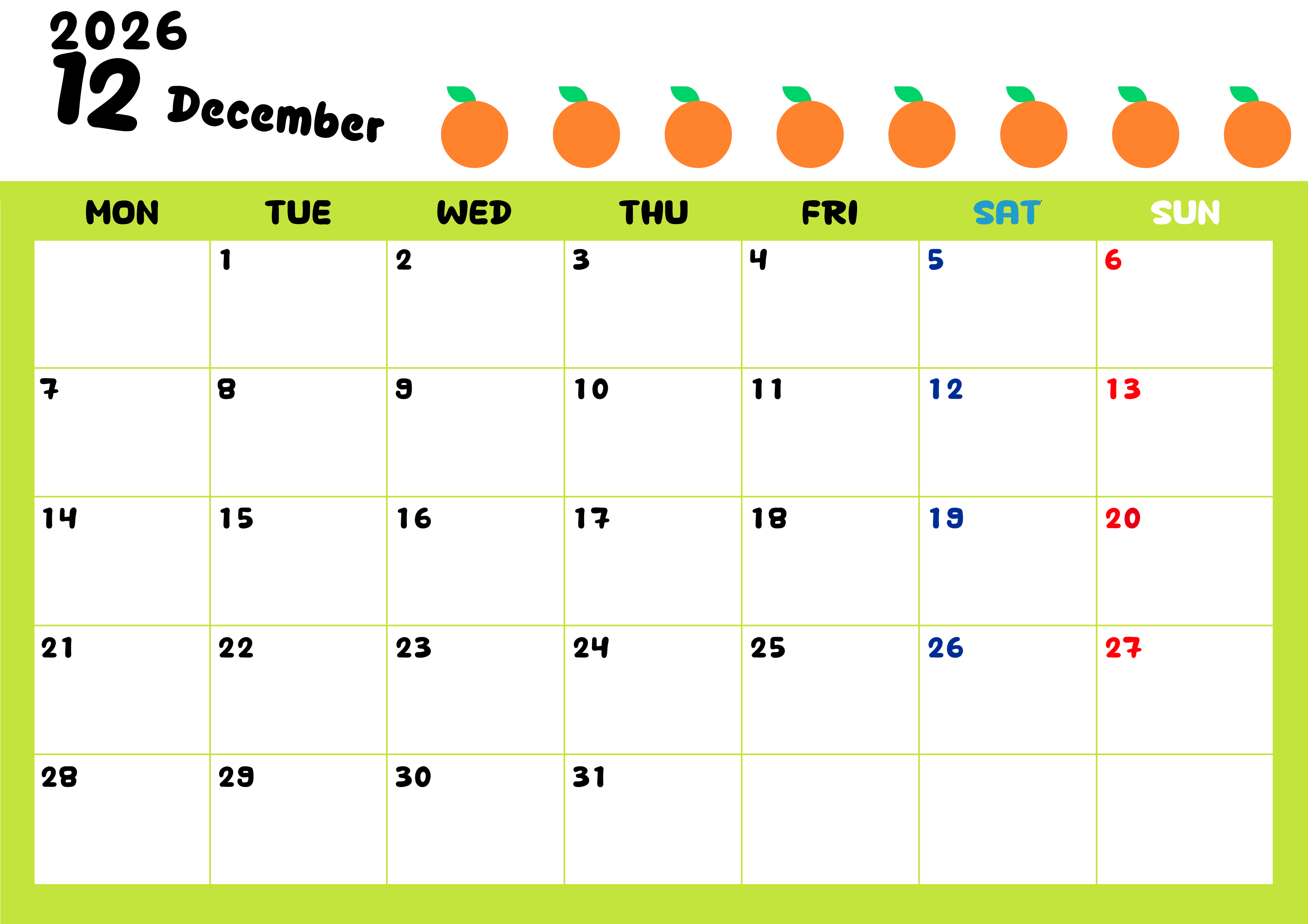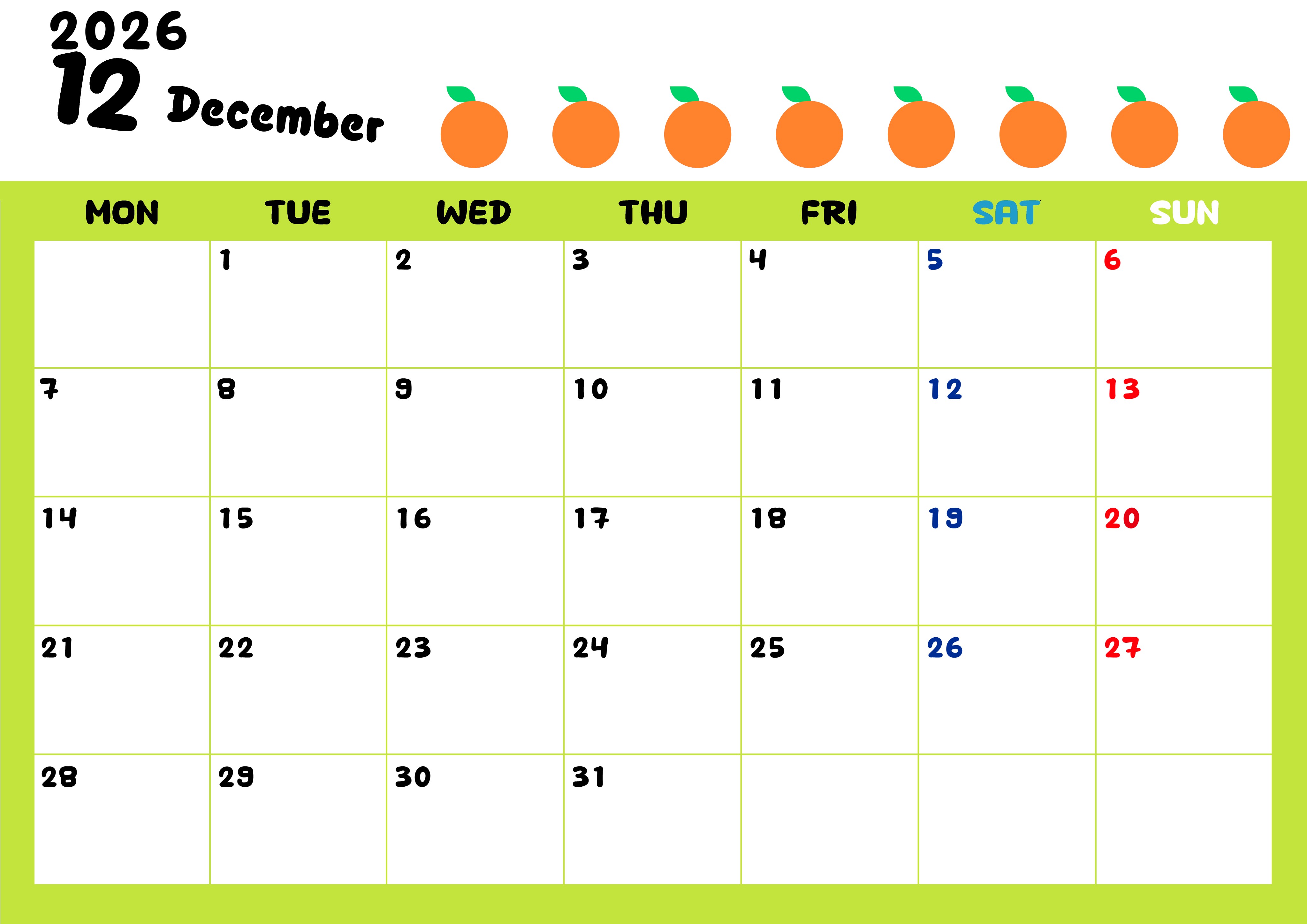 2026年・無料のカレンダーテンプレート 2026年12月カレンダーは横型月曜始まりで季節感あふれる果物のカラフルなイラストがかわいい:無料(2026-01361201) 素材状デザイン王 2025年4月11日 2026年12月カレンダーは横型月曜始まりで季節感あふれる果物のカラフルなイラストがかわいいです。無料ダウンロードをして季節のおいしそうな果物をお楽しみください。(2026-01361201) かわいい 12月 果物 横型のカレンダー 月曜始まり カレンダーデザイン-0136