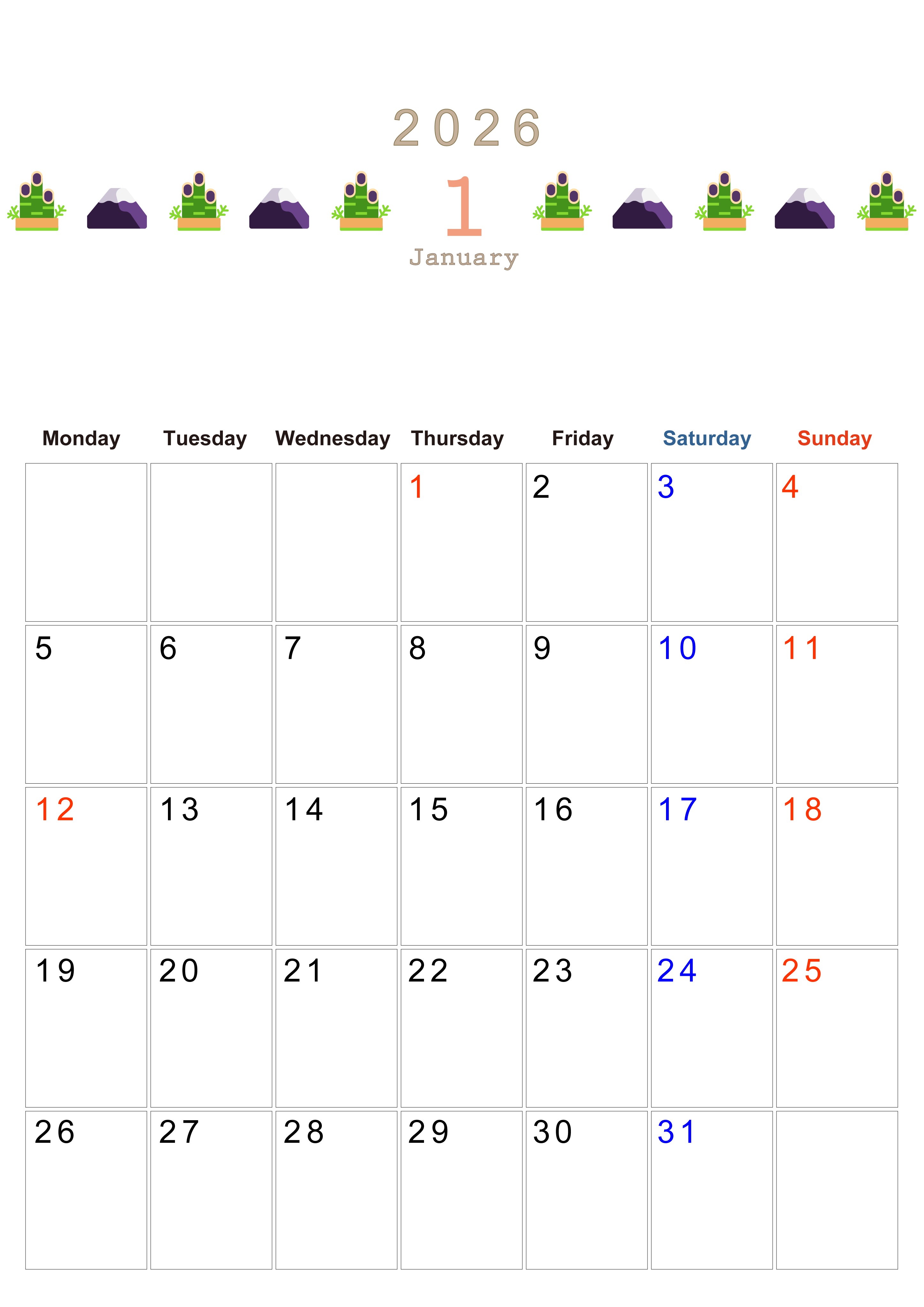 2026年・無料のカレンダーテンプレート 2026年1月カレンダーは縦型月曜始まりで季節感あふれる行事のカラフルなイラストがおしゃれ:無料(2026-01370111) 素材状デザイン王 2025年4月11日 2026年1月カレンダーは縦型月曜始まりで季節感のある行事のカラフルな絵文字イラストがおしゃれです。無料でダウンロードをして季節に合ったイラストをお楽しみください。(2026-01370111) おしゃれ 1月 季節 縦型のカレンダー 月曜始まり カレンダーデザイン-0137
