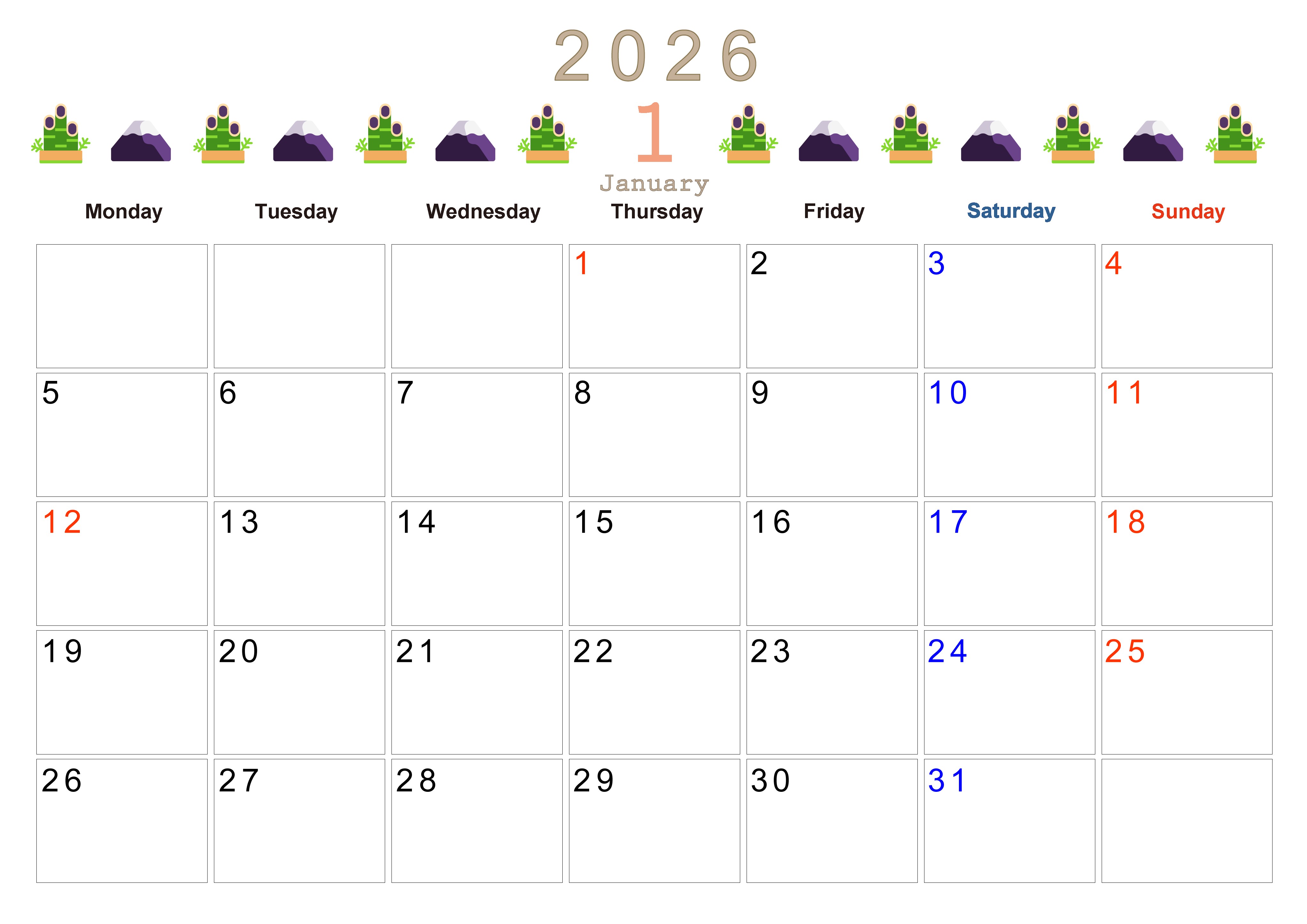 2026年・無料のカレンダーテンプレート 2026年1月カレンダーは横型月曜始まりで季節感あふれる行事のカラフルなイラストがおしゃれ:無料(2026-01370101) 素材状デザイン王 2025年4月11日 2026年1月カレンダーは横型月曜始まりで季節感のある行事のカラフルな絵文字イラストがおしゃれです。無料でダウンロードをして季節に合ったイラストをお楽しみください。(2026-01370101) おしゃれ 1月 季節 横型のカレンダー 月曜始まり カレンダーデザイン-0137