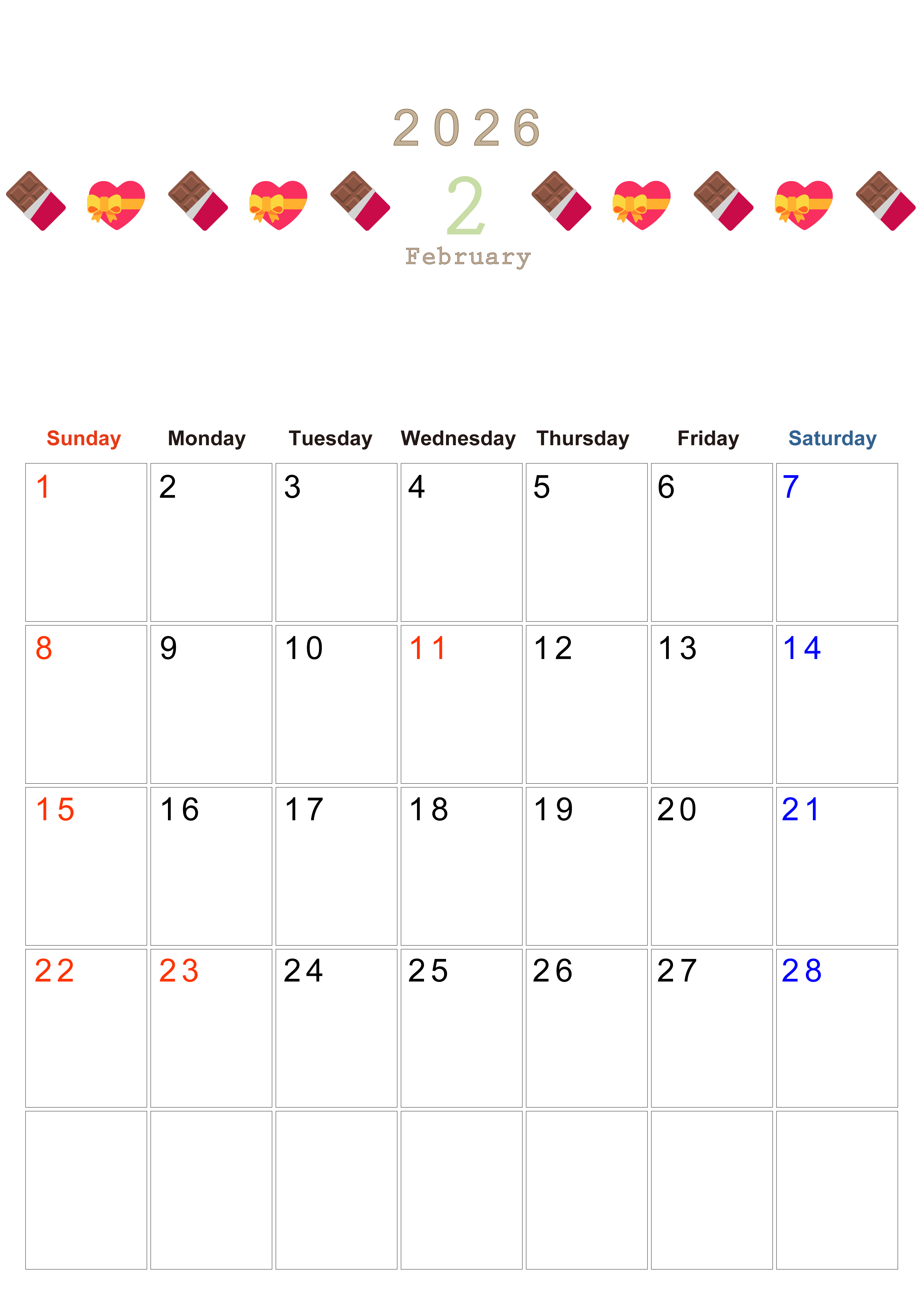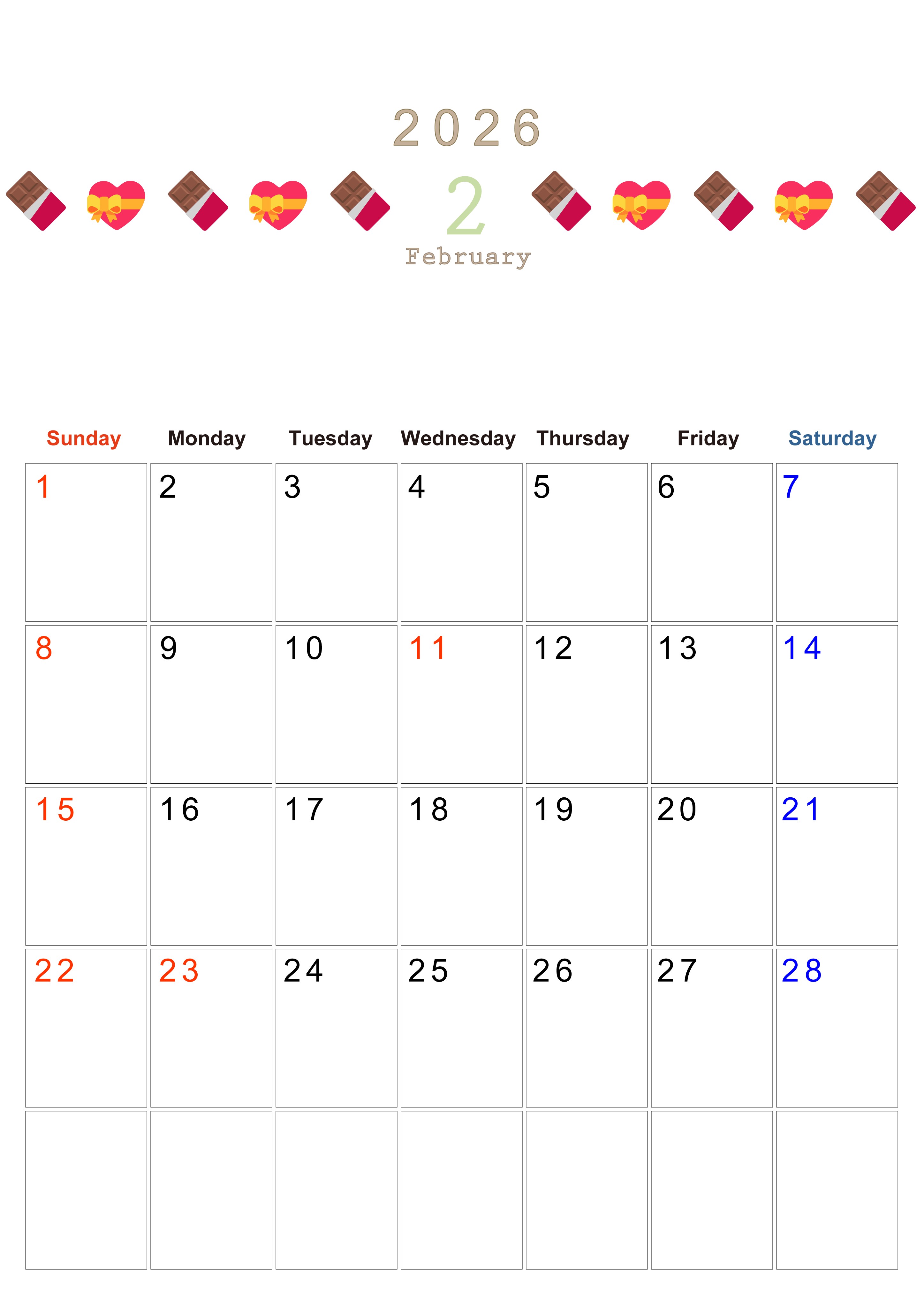 2026年・無料のカレンダーテンプレート 2026年2月カレンダーは縦型日曜始まりで季節感あふれる行事のカラフルなイラストがおしゃれ:無料(2026-01370210) 素材状デザイン王 2025年4月11日 2026年2月カレンダーは縦型日曜始まりで季節感のある行事のカラフルな絵文字イラストがおしゃれです。無料でダウンロードをして季節に合ったイラストをお楽しみください。(2026-01370210) おしゃれ 2月 季節 縦型のカレンダー 日曜始まり カレンダーデザイン-0137