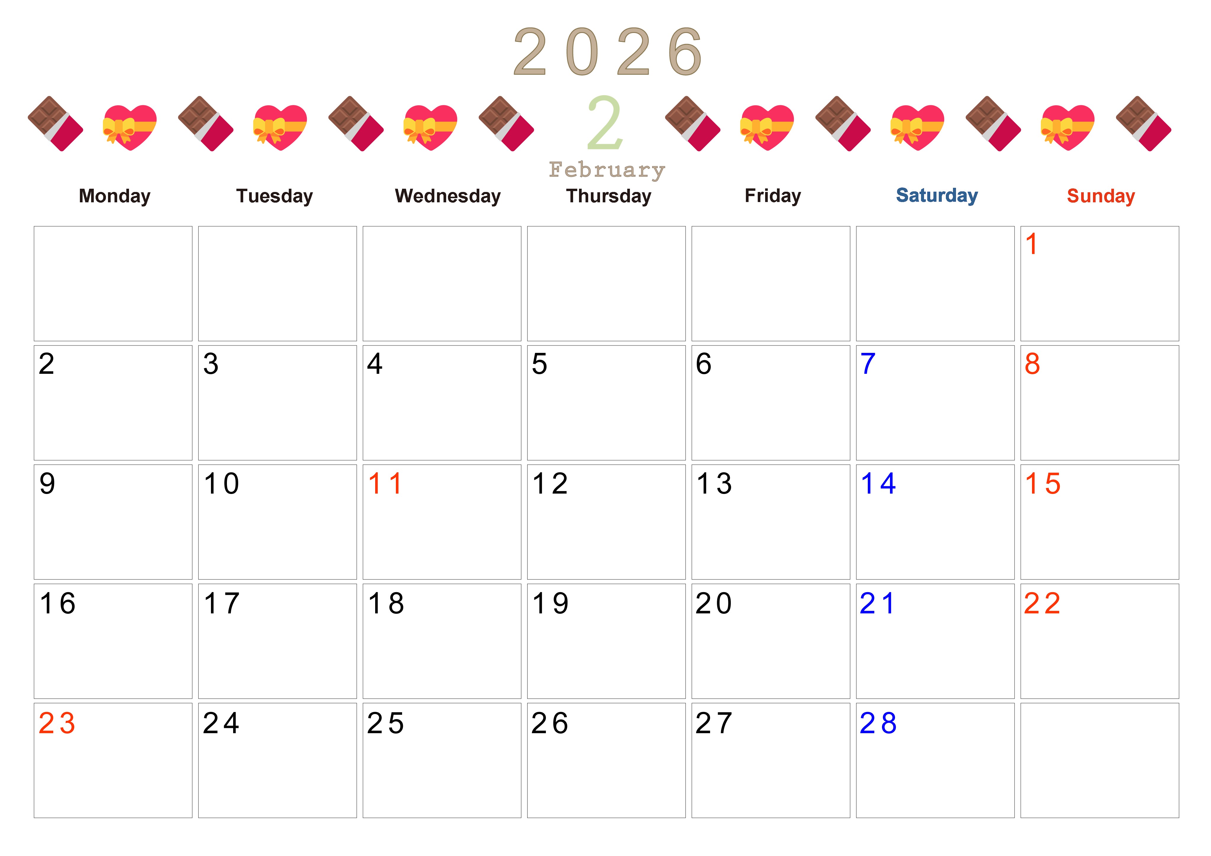2026年・無料のカレンダーテンプレート 2026年2月カレンダーは横型月曜始まりで季節感あふれる行事のカラフルなイラストがおしゃれ:無料(2026-01370201) 素材状デザイン王 2025年4月11日 2026年2月カレンダーは横型月曜始まりで季節感のある行事のカラフルな絵文字イラストがおしゃれです。無料でダウンロードをして季節に合ったイラストをお楽しみください。(2026-01370201) おしゃれ 2月 季節 横型のカレンダー 月曜始まり カレンダーデザイン-0137