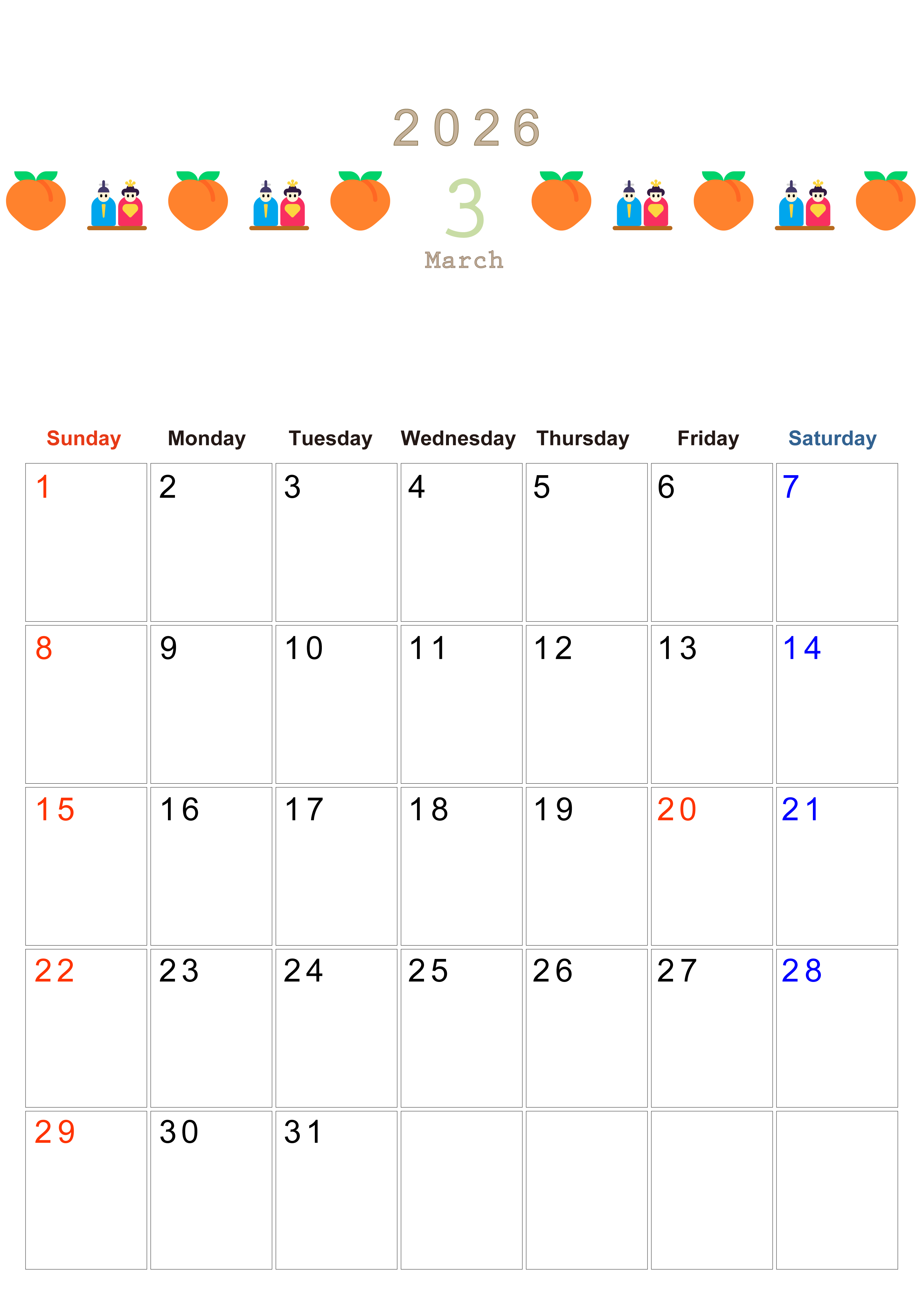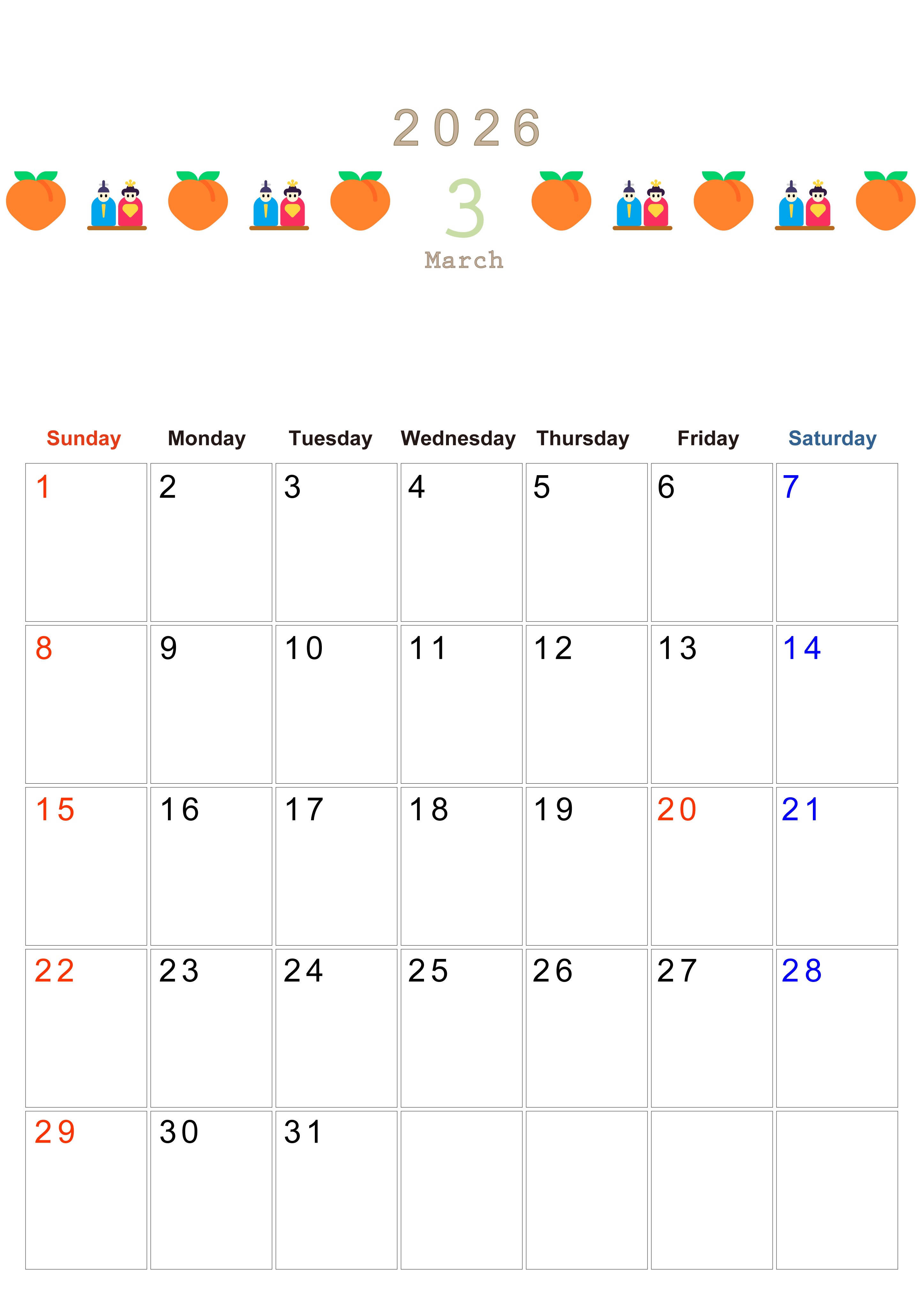 2026年・無料のカレンダーテンプレート 2026年3月カレンダーは縦型日曜始まりで季節感あふれる行事のカラフルなイラストがおしゃれ:無料(2026-01370310) 素材状デザイン王 2025年4月11日 2026年3月カレンダーは縦型日曜始まりで季節感のある行事のカラフルな絵文字イラストがおしゃれです。無料でダウンロードをして季節に合ったイラストをお楽しみください。(2026-01370310) おしゃれ 3月 季節 縦型のカレンダー 日曜始まり カレンダーデザイン-0137