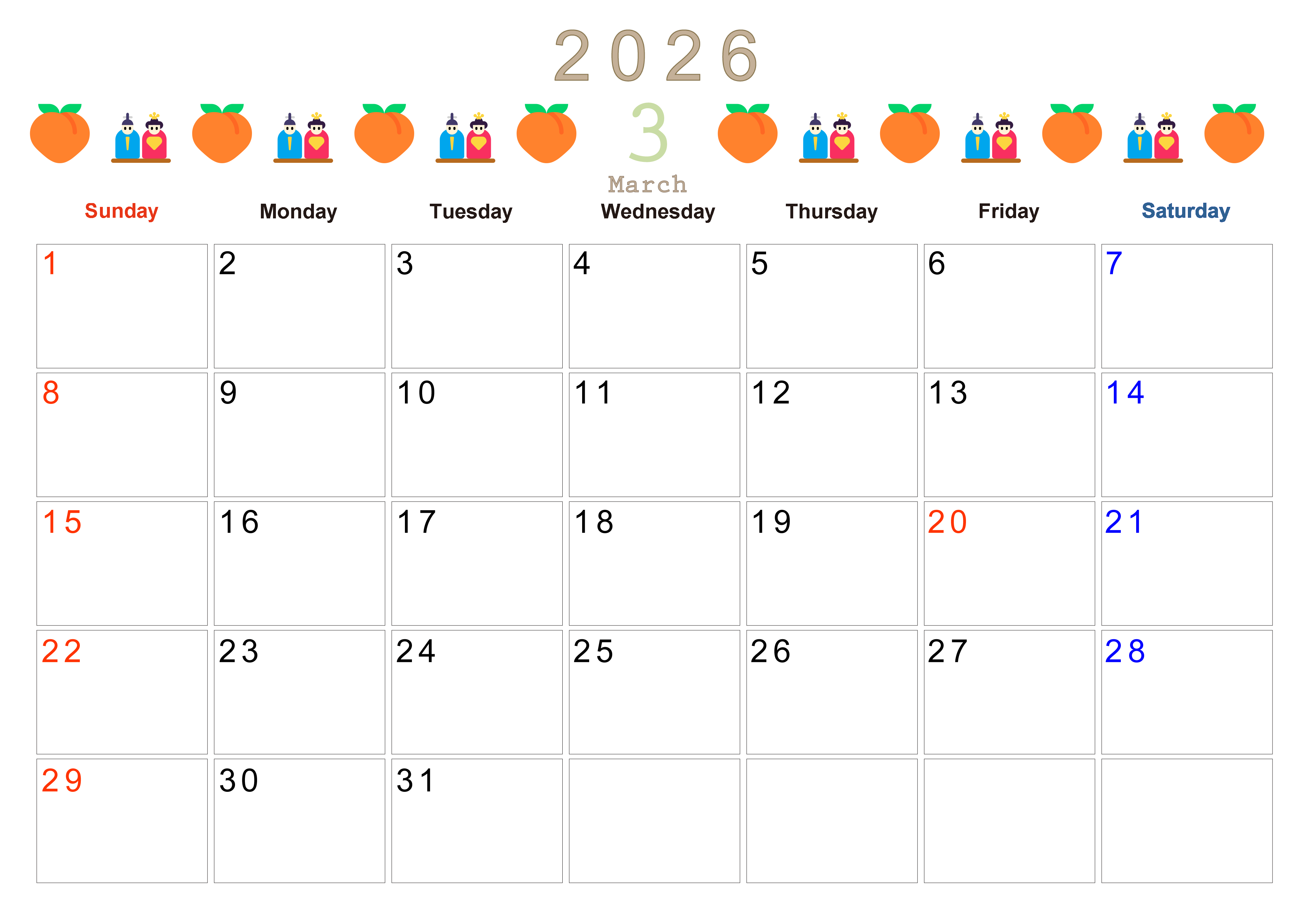 2026年・無料のカレンダーテンプレート 2026年3月カレンダーは横型日曜始まりで季節感あふれる行事のカラフルなイラストがおしゃれ:無料(2026-01370300) 素材状デザイン王 2025年4月11日 2026年3月カレンダーは横型日曜始まりで季節感のある行事のカラフルな絵文字イラストがおしゃれです。無料でダウンロードをして季節に合ったイラストをお楽しみください。(2026-01370300) おしゃれ 3月 季節 横型のカレンダー 日曜始まり カレンダーデザイン-0137