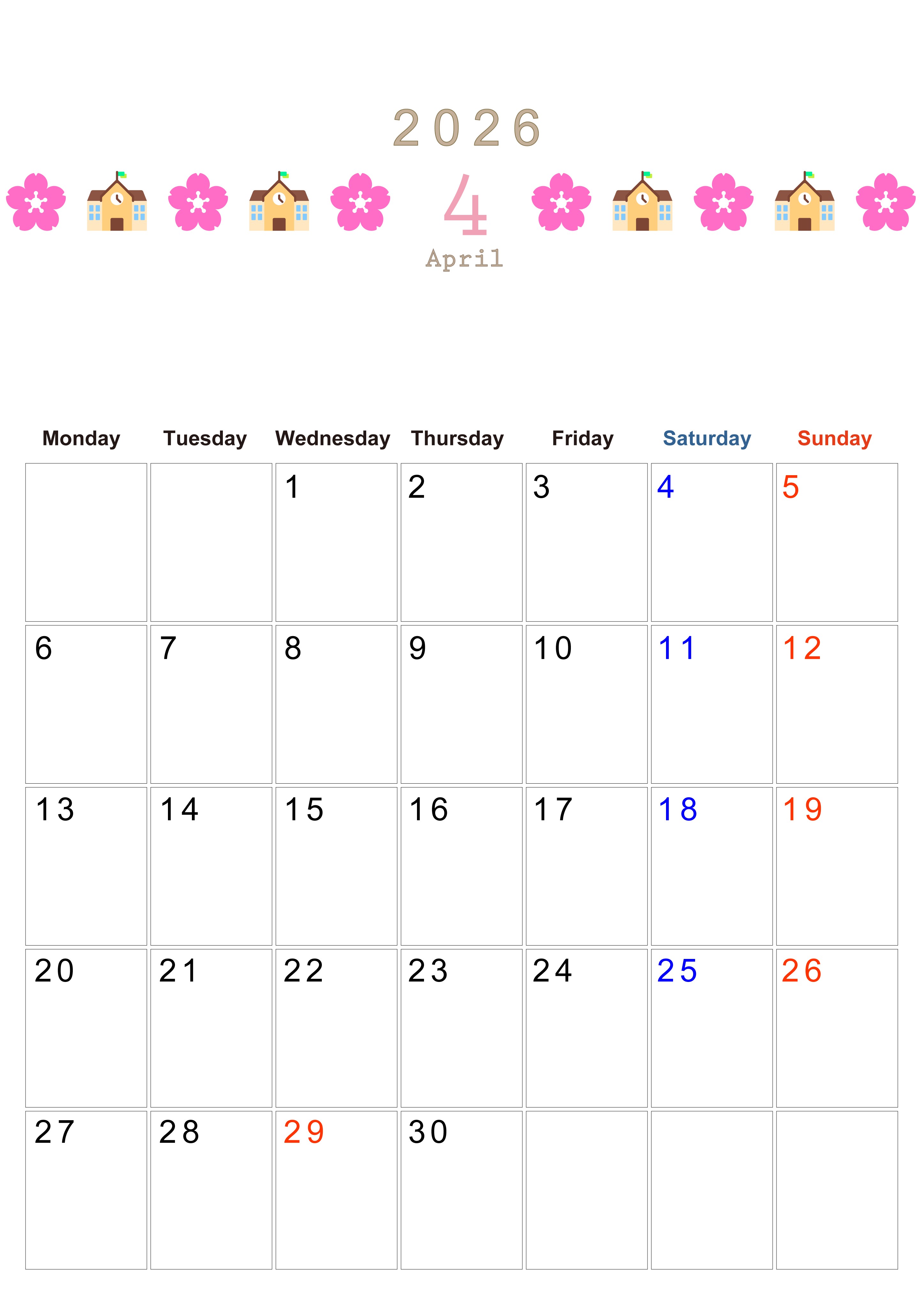 2026年4月カレンダーは縦型月曜始まりで季節感あふれる行事のカラフルなイラストがおしゃれ:無料(2026-01370411)
