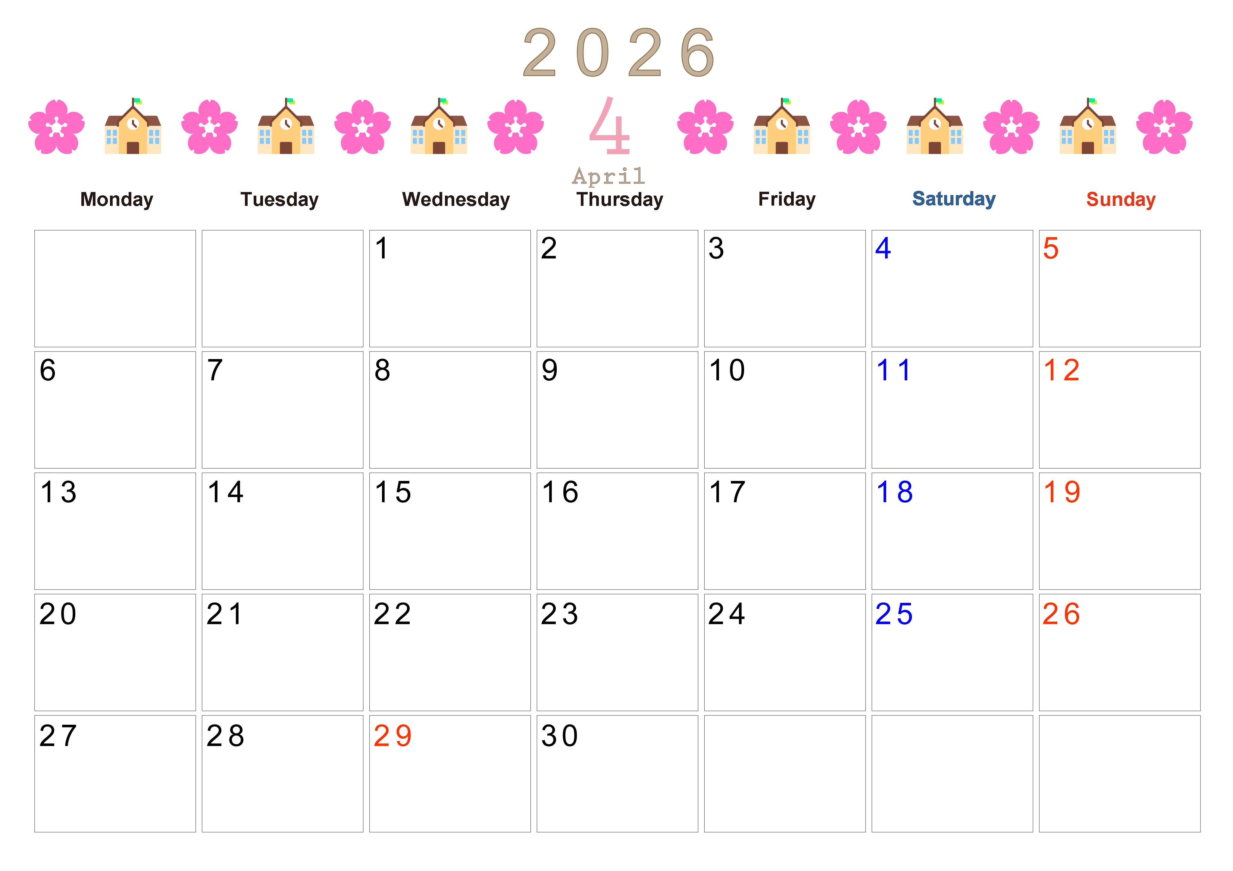 2026年4月カレンダーは横型月曜始まりで季節感あふれる行事のカラフルなイラストがおしゃれ:無料(2026-01370401)